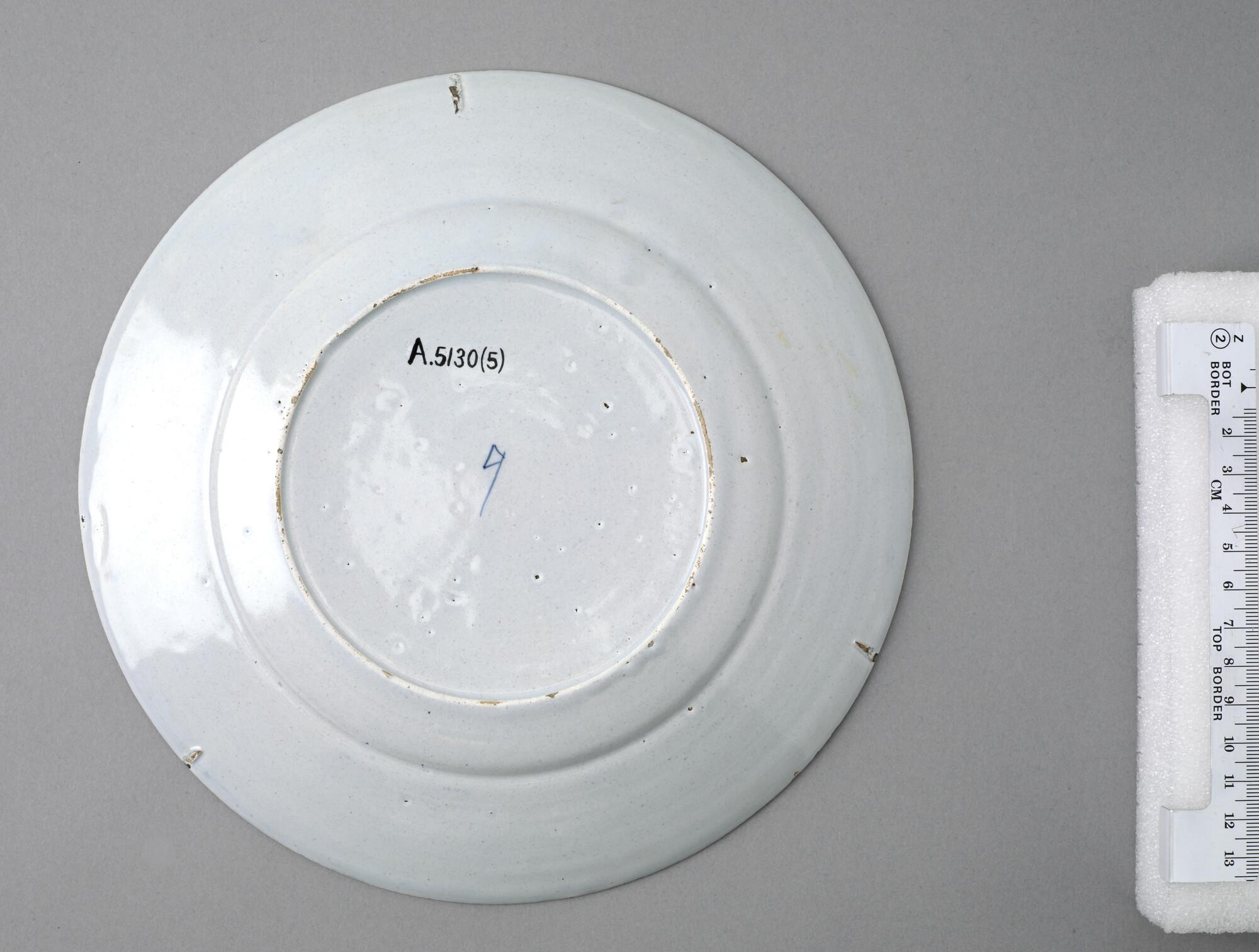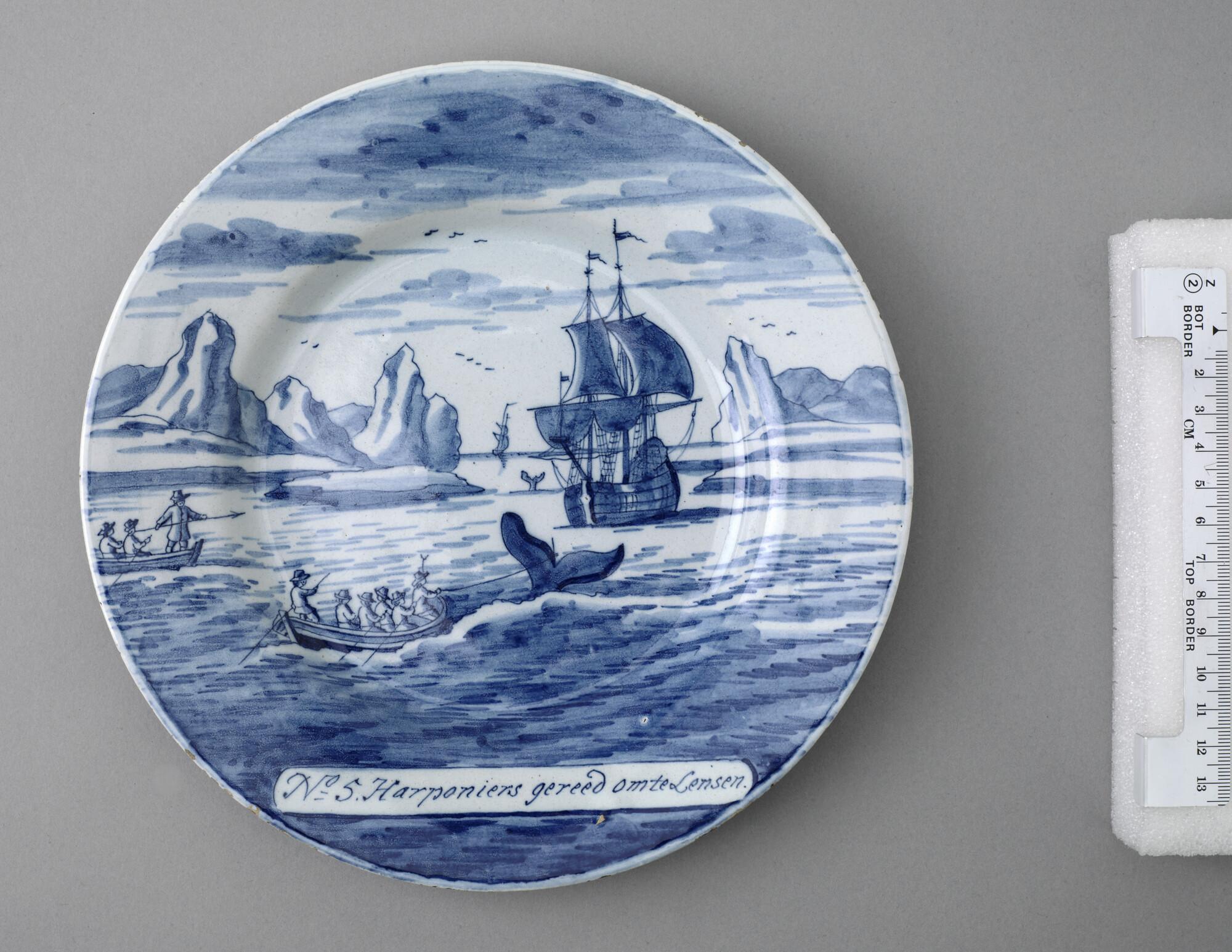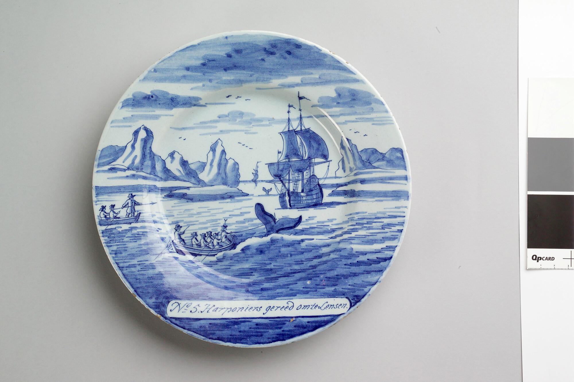 Bord van Delfts aardewerk met een voorstelling in blauw van de walvisvaart. Met op de voorzijde een cartouche met een nummer en opschrift: "Harponiers gereed om te lensen.".
