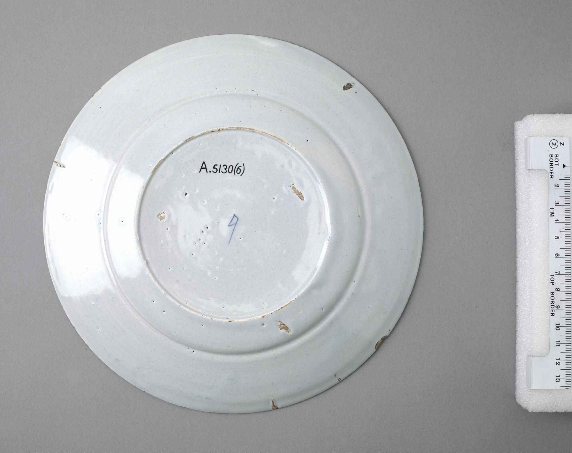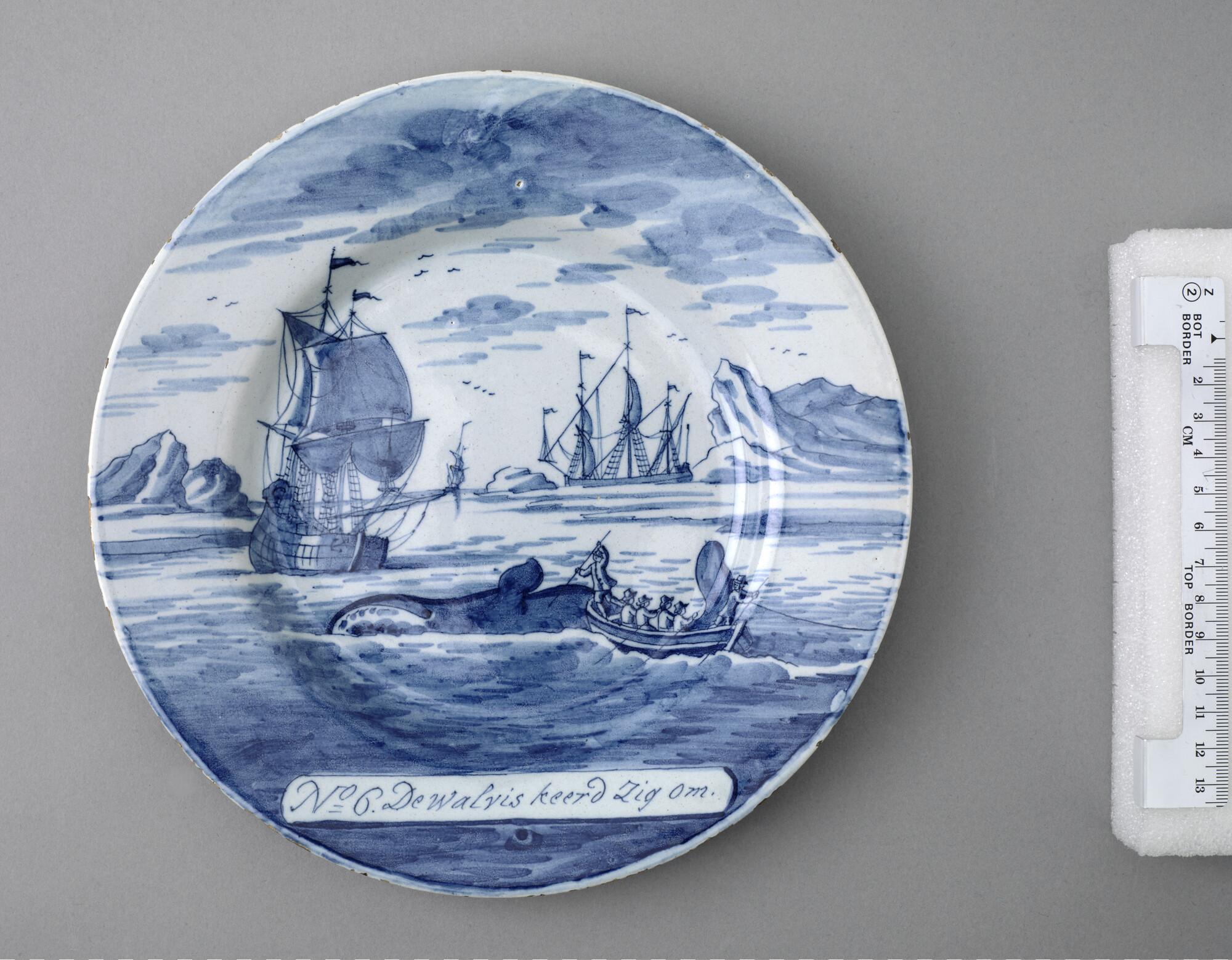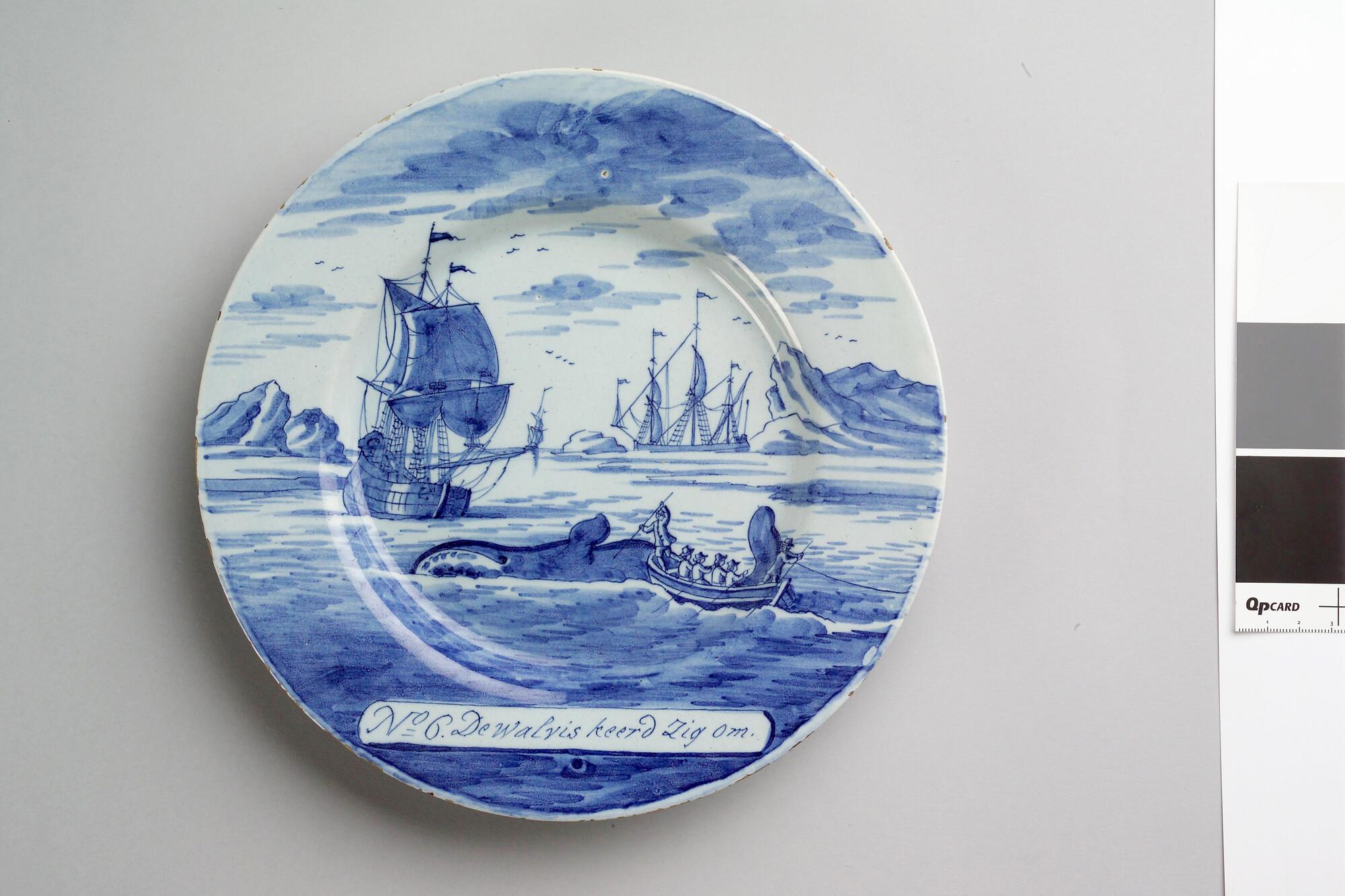 Bord van Delfts aardewerk met een voorstelling in blauw van de walvisvaart. Met op de voorzijde een cartouche met een nummer en opschrift: "De walvis keerd zig om.".