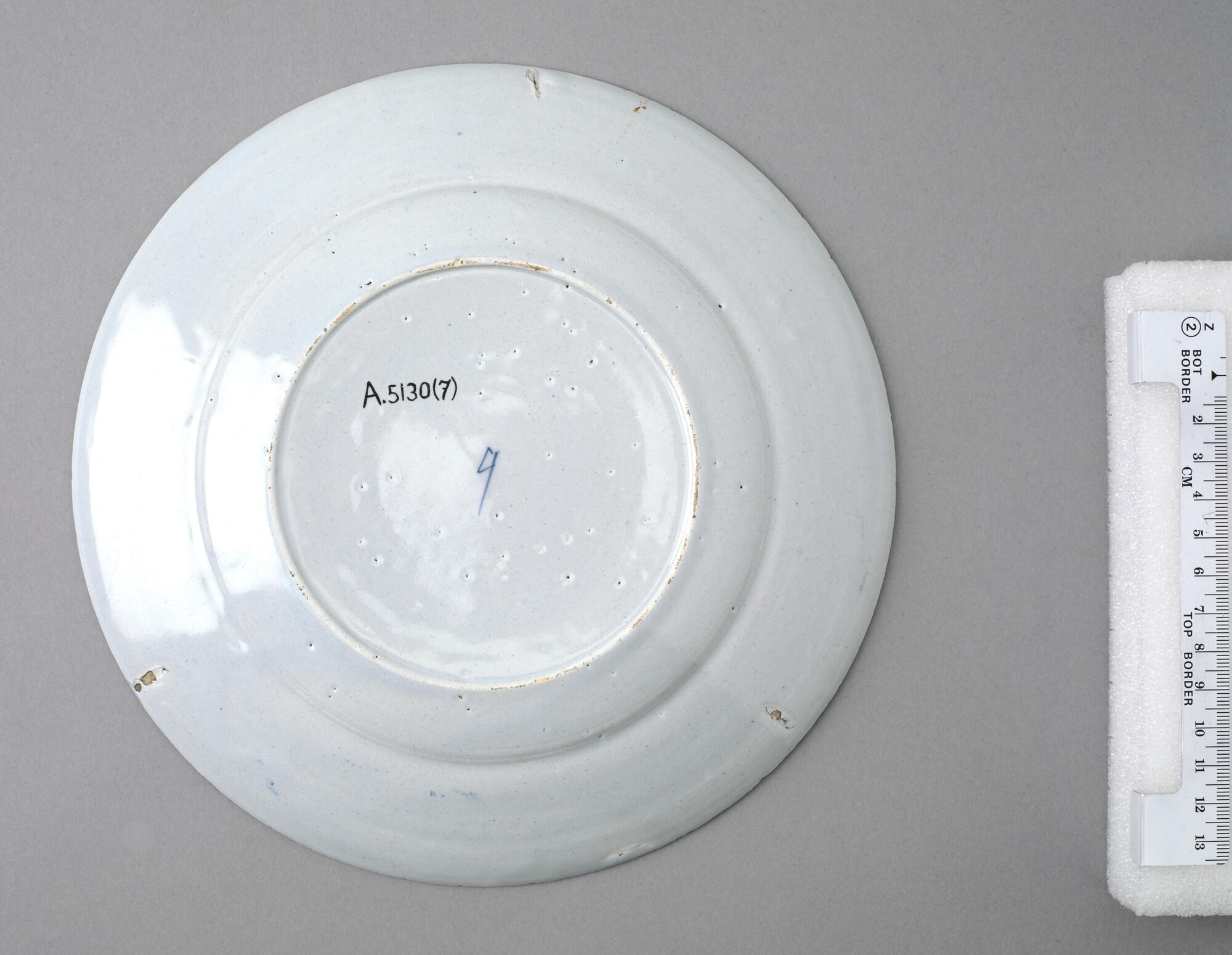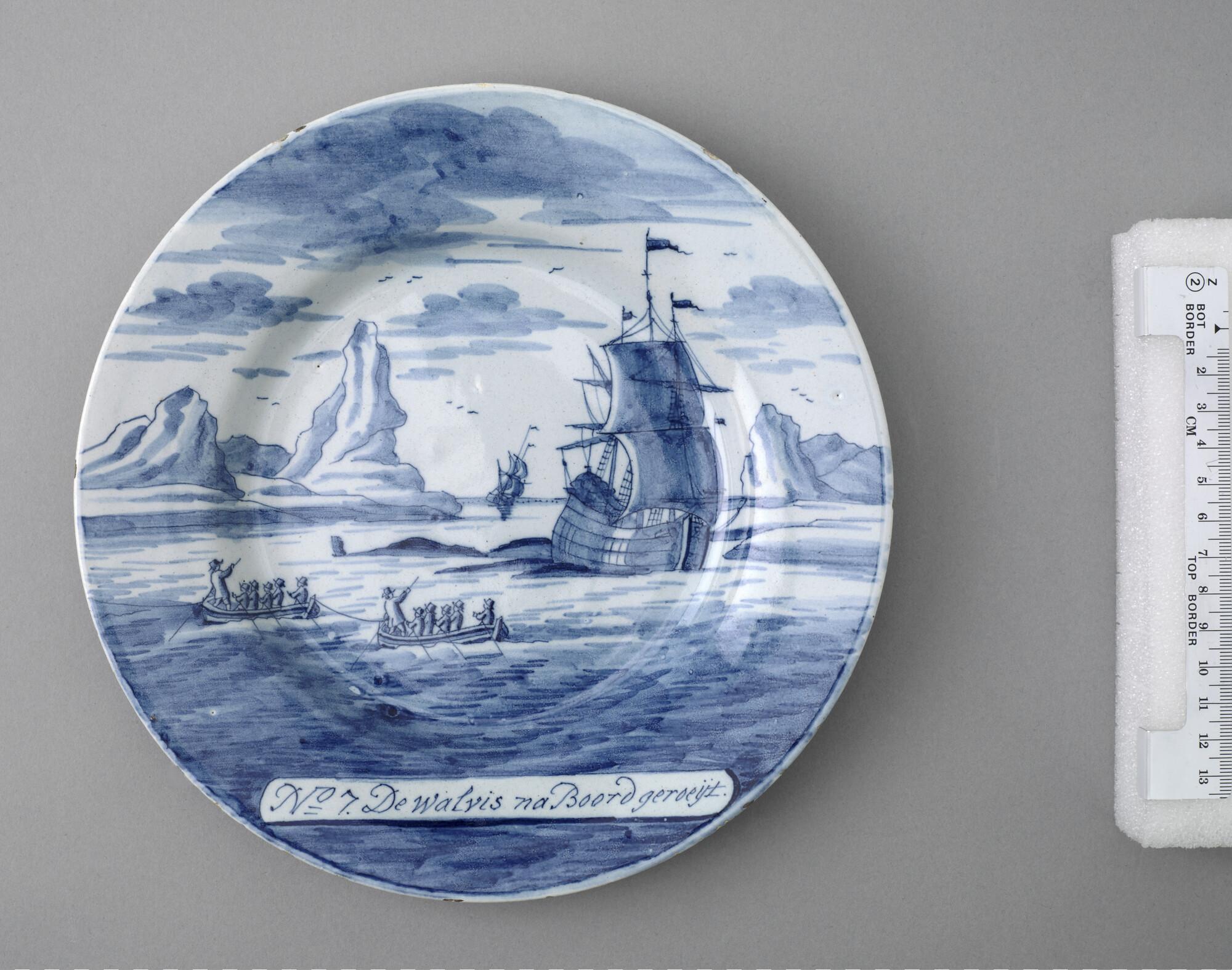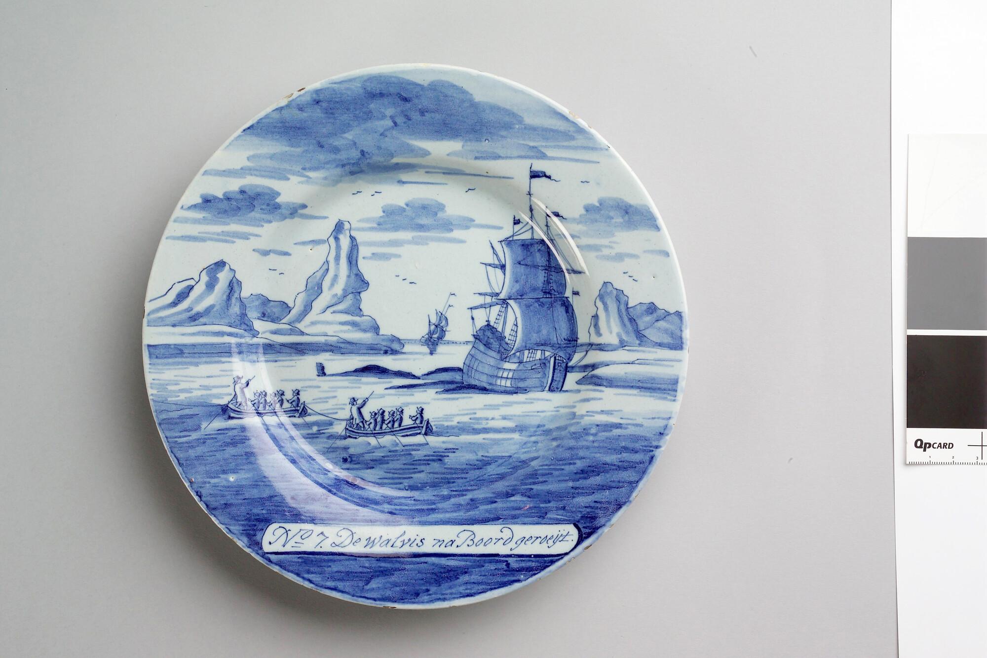 Bord van Delfts aardewerk met een voorstelling in blauw van de walvisvaart. Met op de voorzijde een cartouche met een nummer en opschrift: "De walvis na boord geroeijt.".