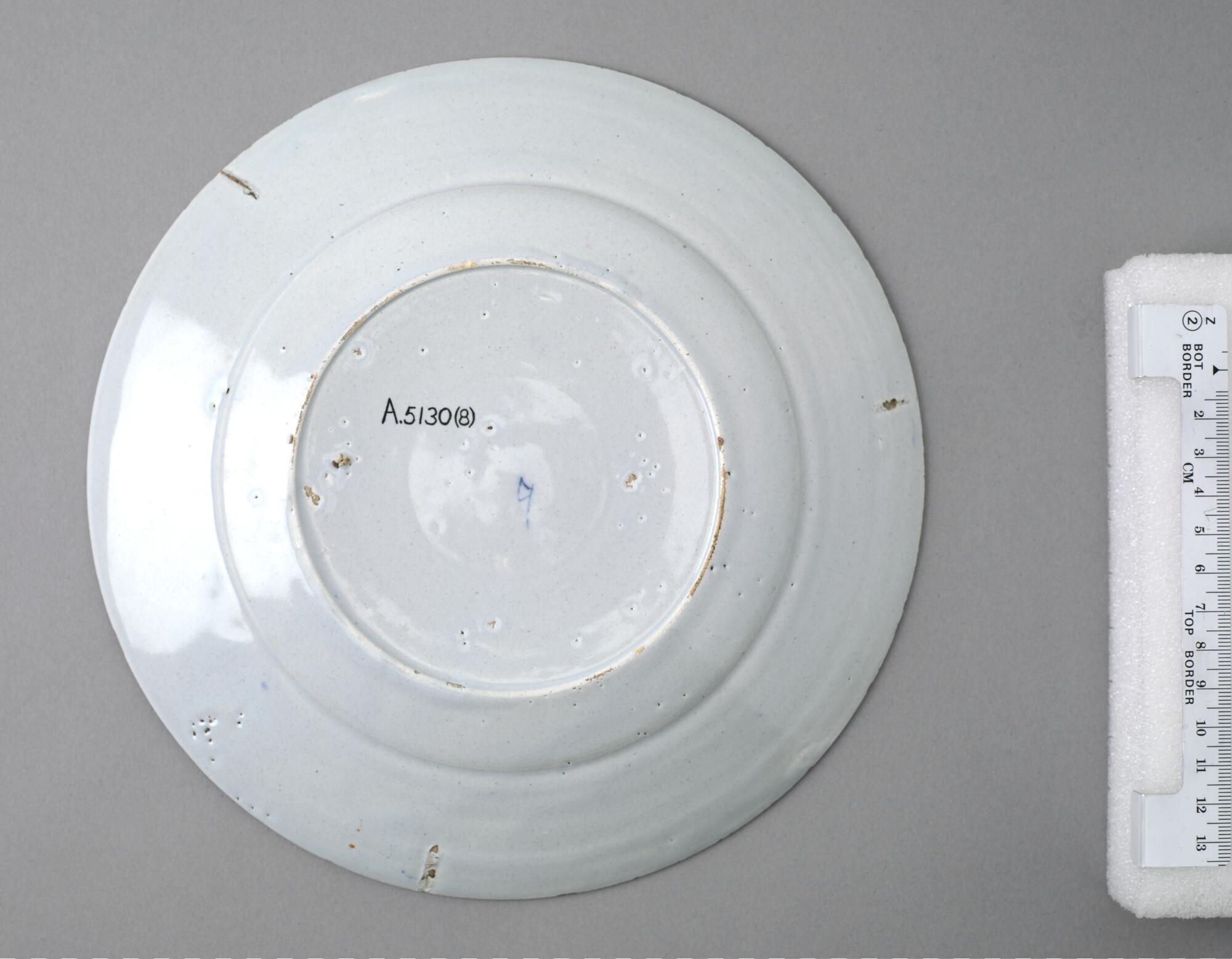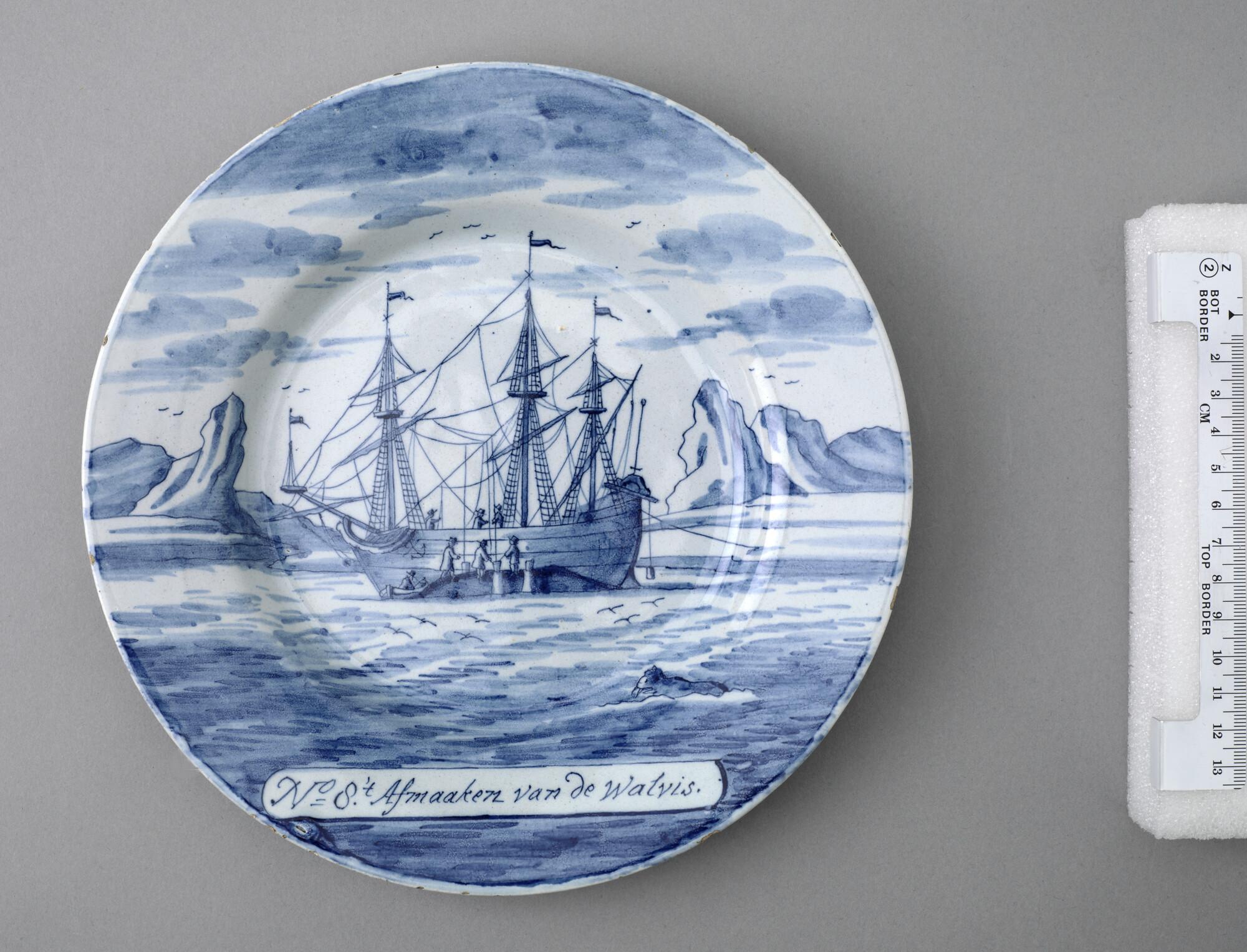 Bord van Delfts aardewerk met een voorstelling in blauw van de walvisvaart. Met op de voorzijde een cartouche met een nummer en opschrift: " 't Afmaaken van de walvis.".