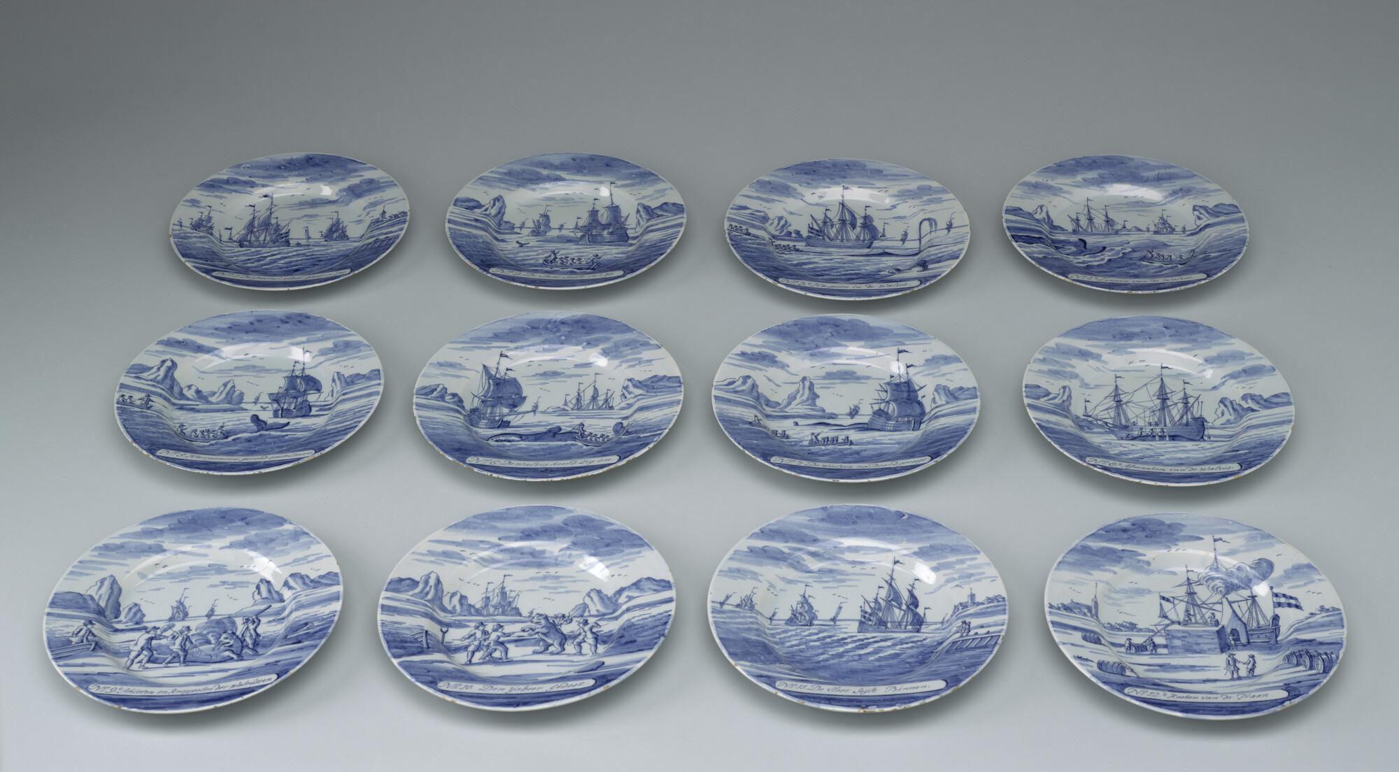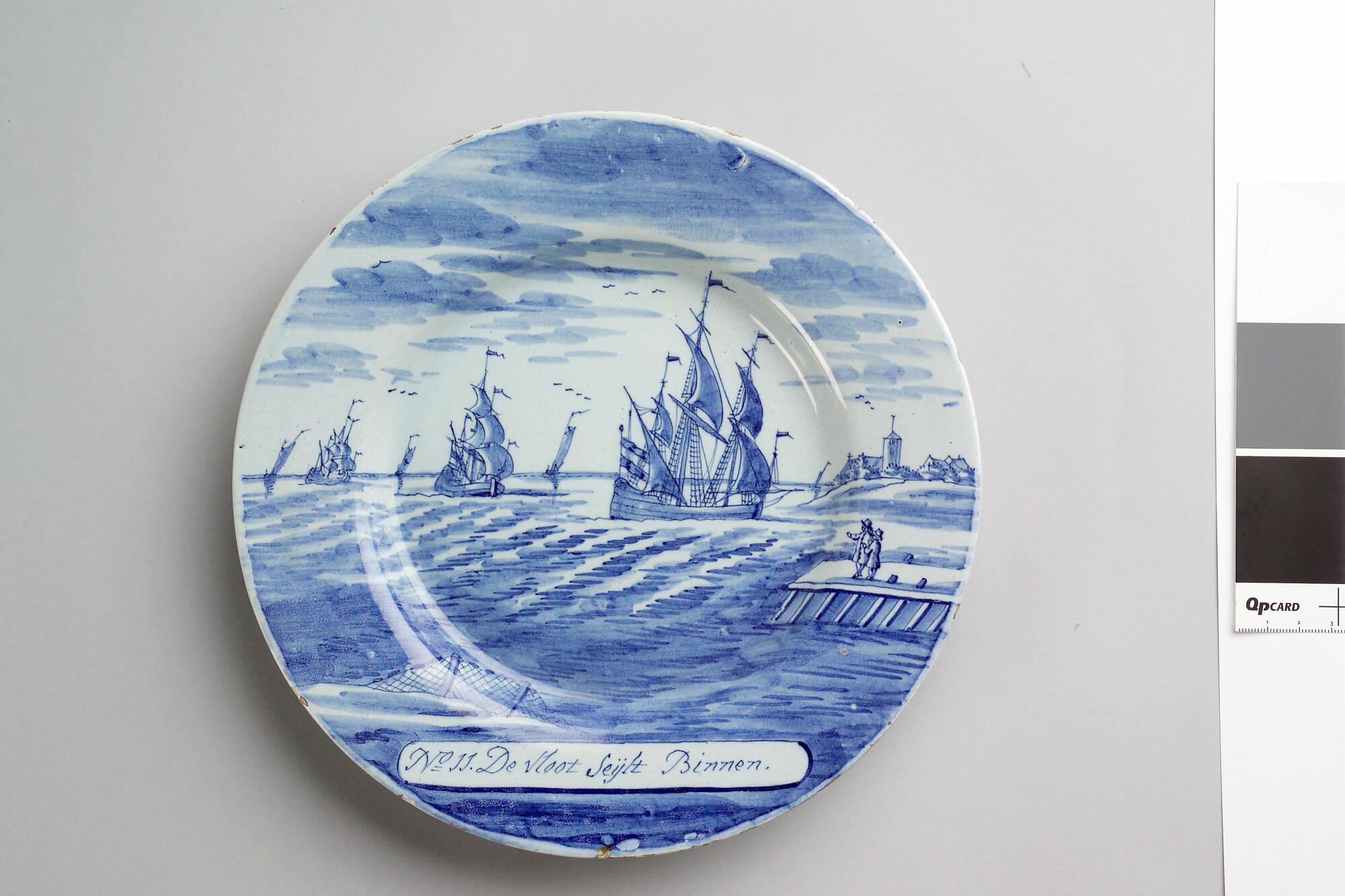 Bord van Delfts aardewerk met een voorstelling in blauw van de walvisvaart. Met op de voorzijde een cartouche met een nummer en opschrift: "De vloot seijlt binnen.".