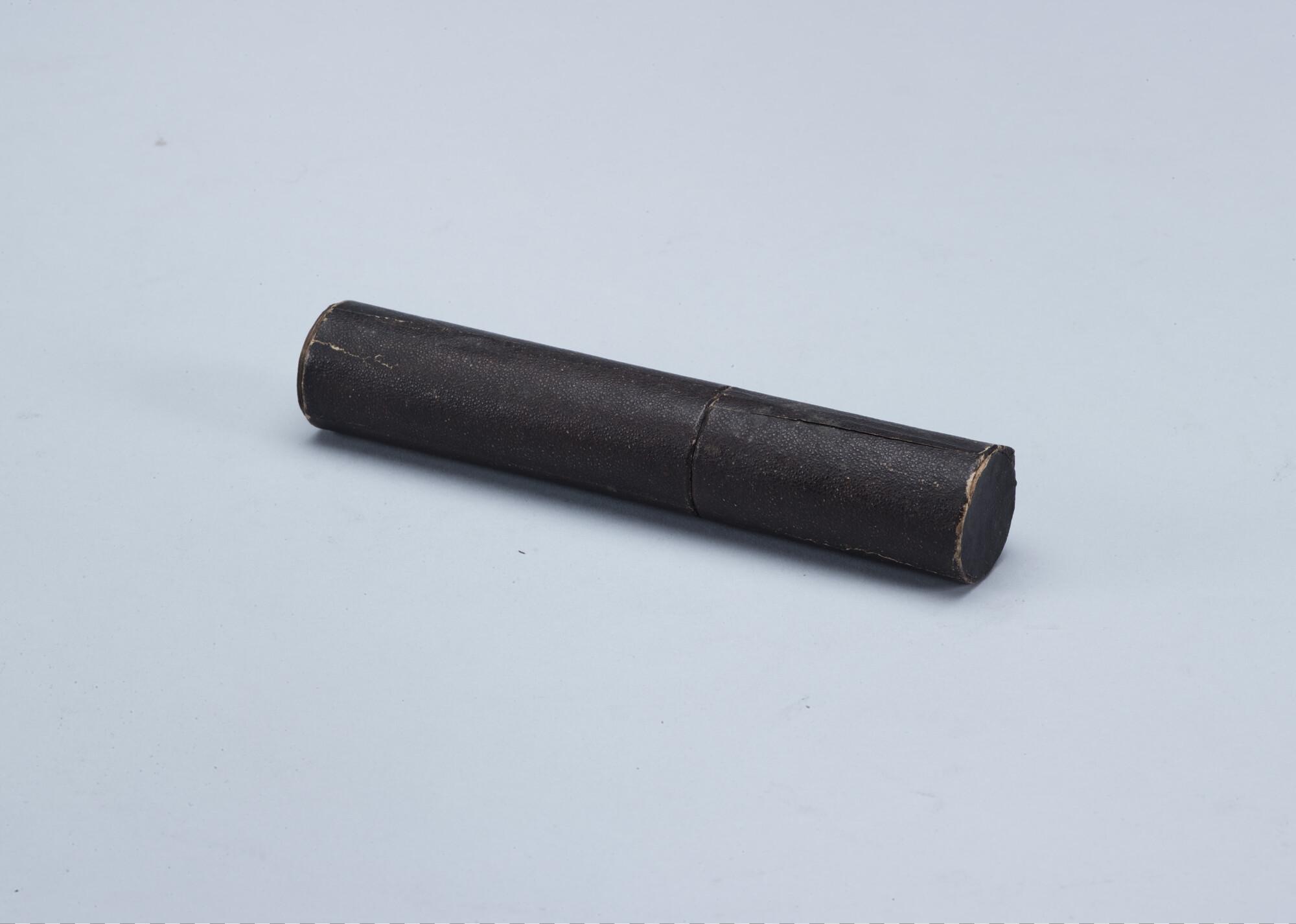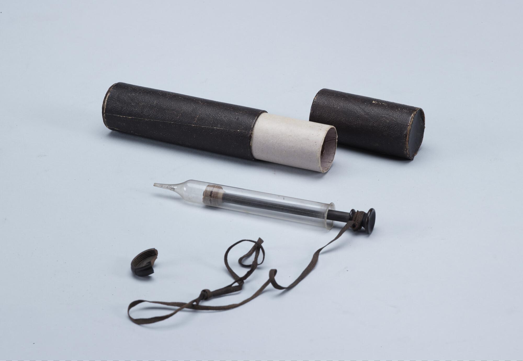Injectiespuit van glas (klisteerspuit) en hout, in ronde kartonnen koker. Onderdeel uit de medicijnkist van de Nederlandse Noordpool Expeditie 1882 - 1883.