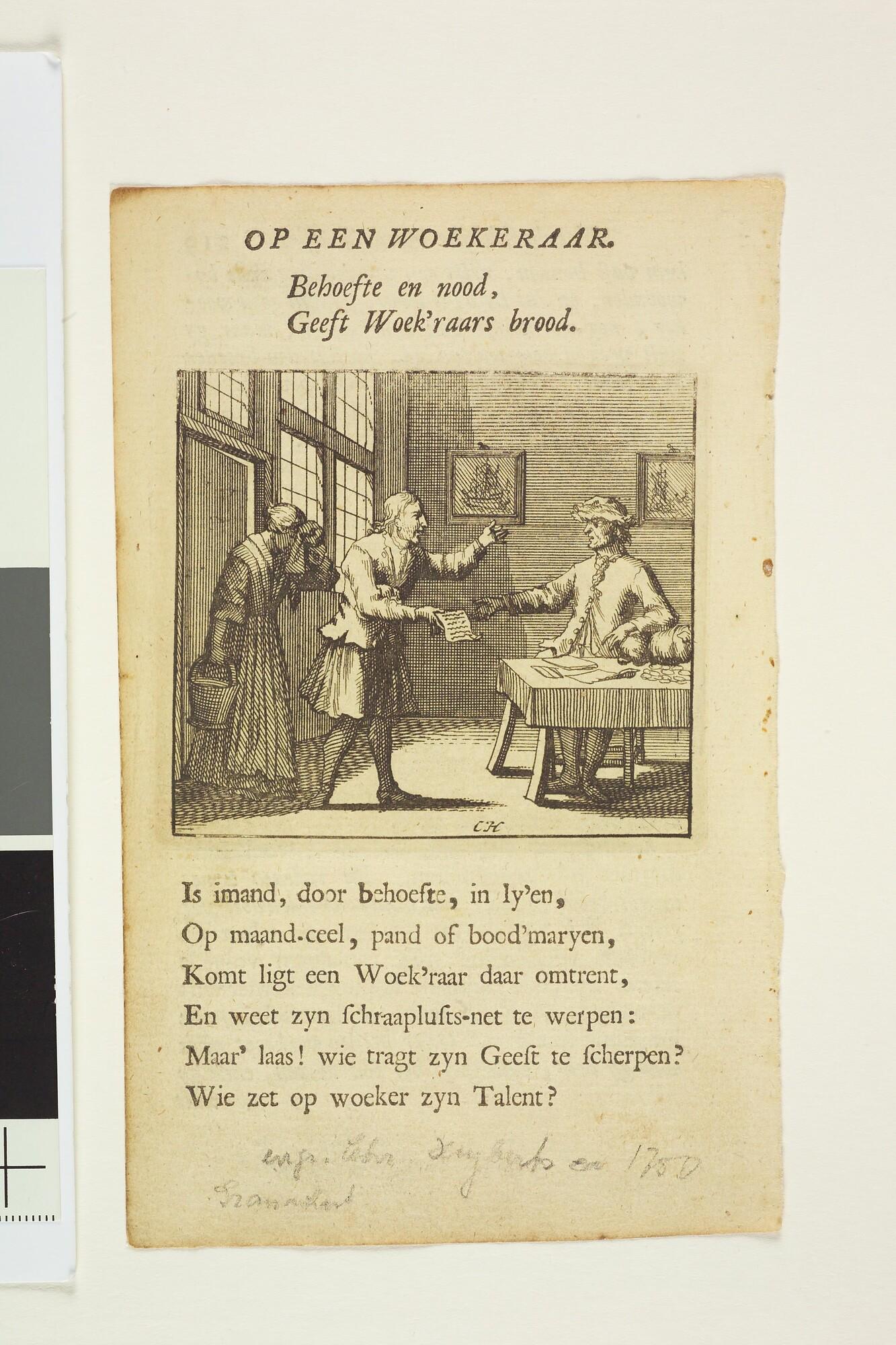 Een woekeraar met twee klanten. Aan de wand twee marines