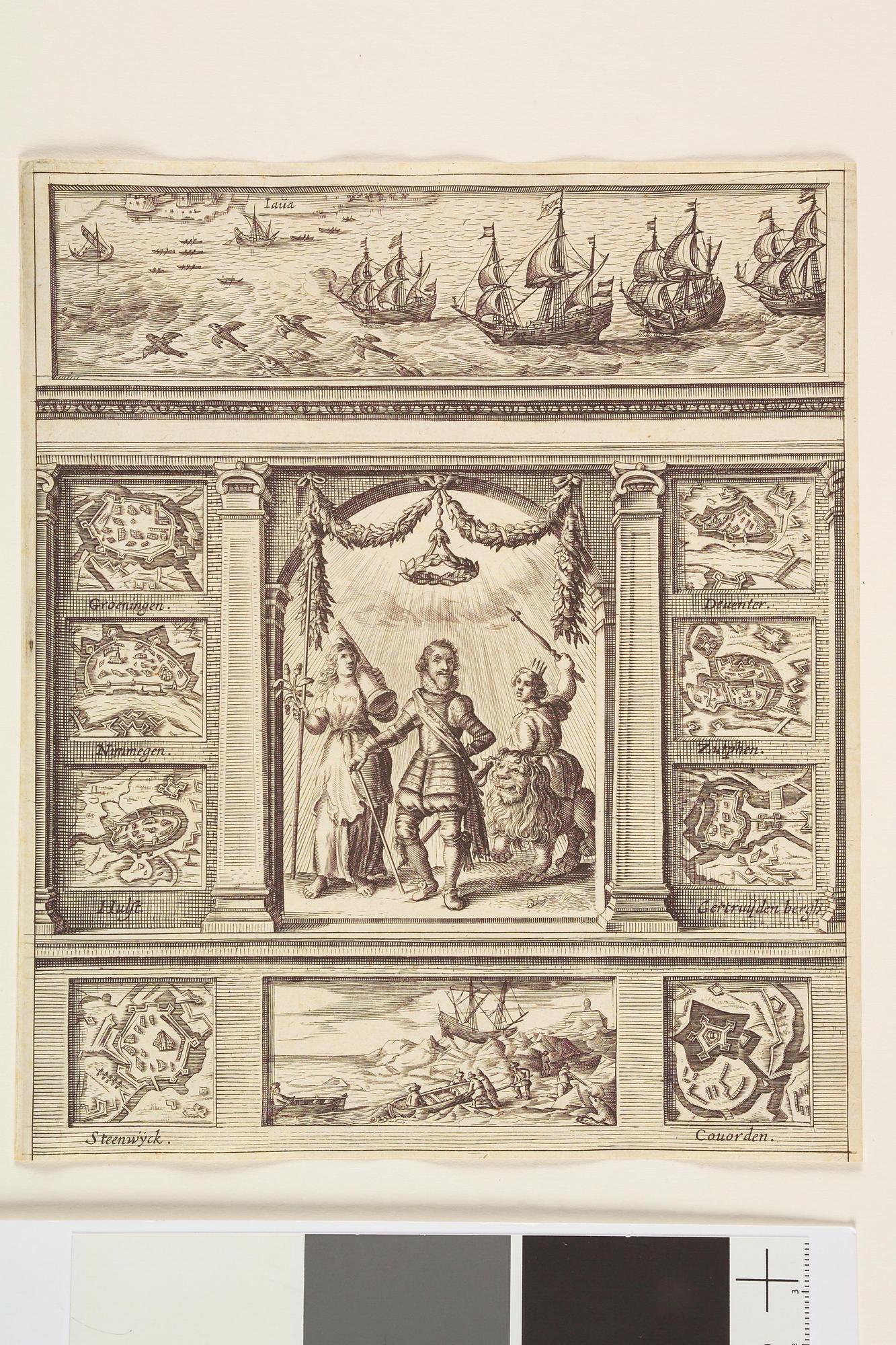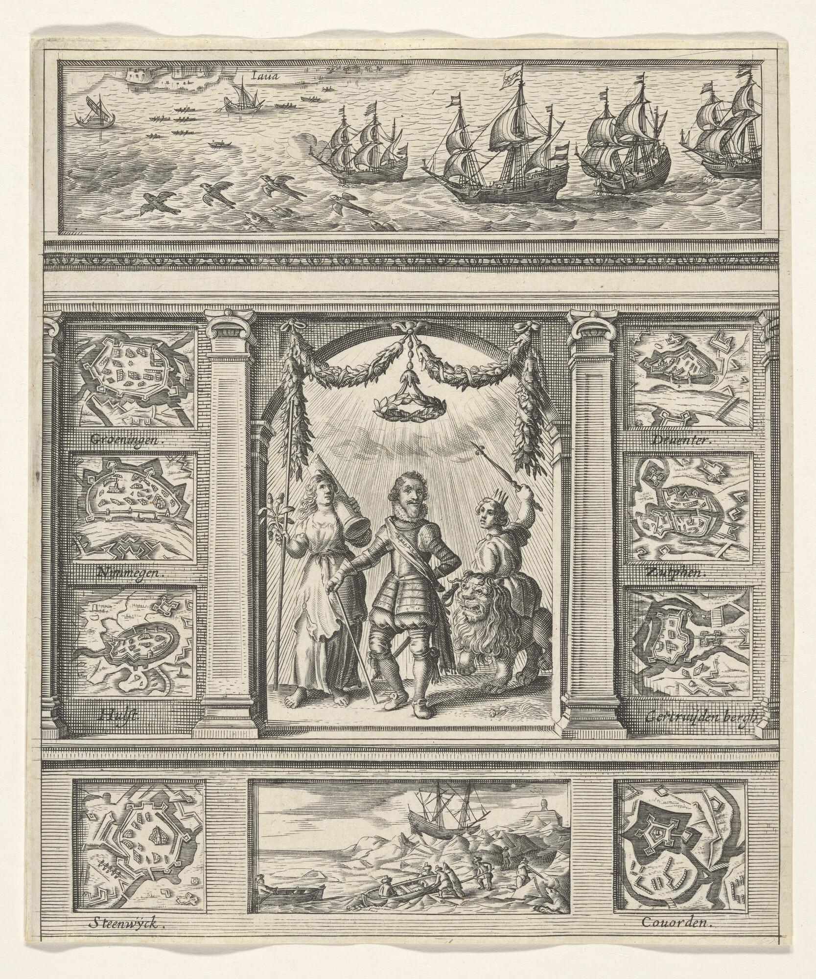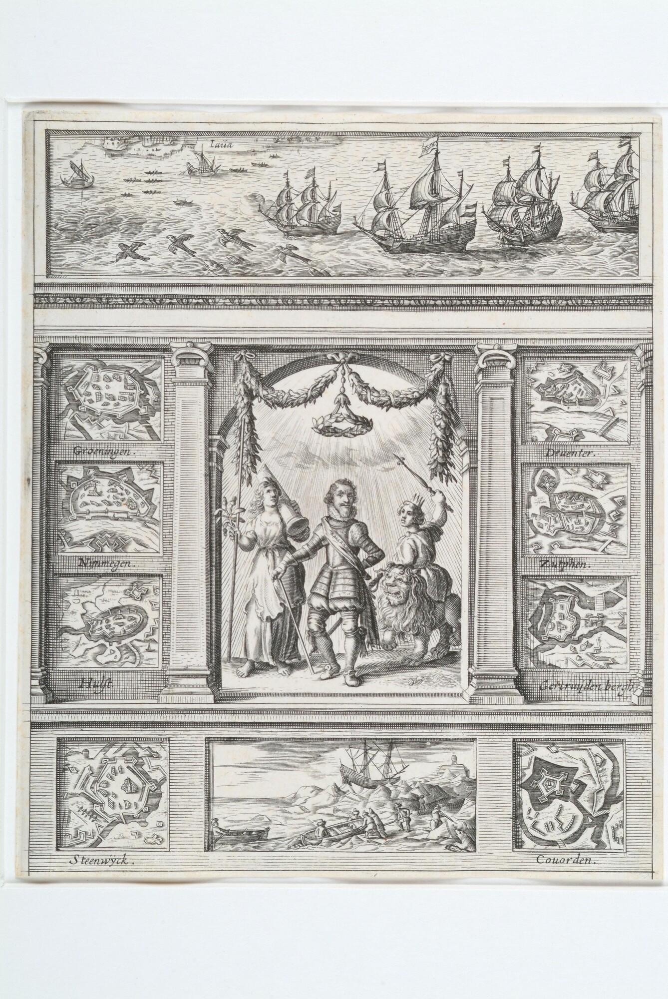 Zinneprent op prins Maurits. Met in het midden Maurits tussen twee allegorische vrouwenfiguren. Boven: de Eerste Schipreis naar Indië door Houtman. Links en rechts 8 plattegonden van door Maurits veroverde steden. Onder: de tocht naar/ overwintering op Nova Zembla.