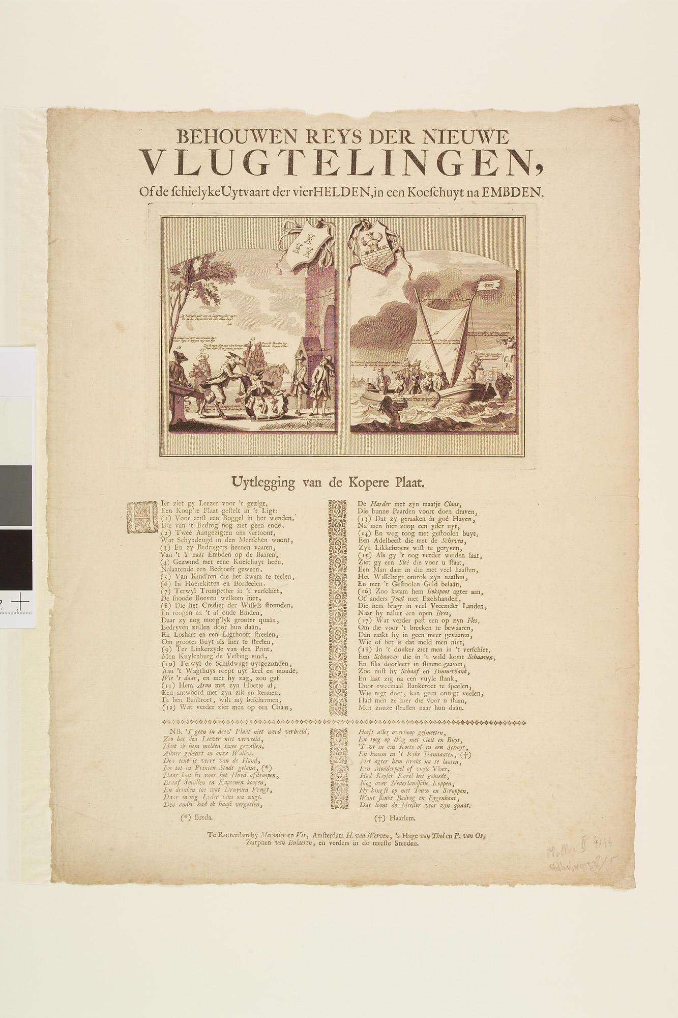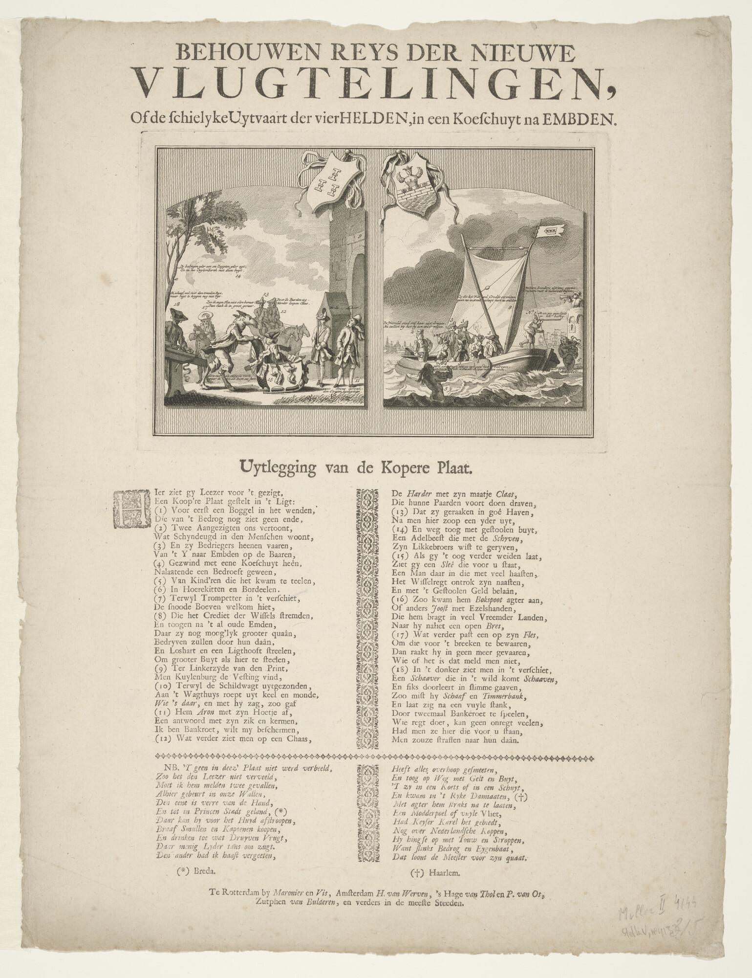 Zinnebeeldige prent bestaande uit twee afbeeldingen over het zware bankroet door de wisselhandel te Amsterdam in 1763, met afgebeeld vier vluchtende kooplieden vanaf Kuilenburg (Culemborg) en rechts in een koeschuit naar Emden.