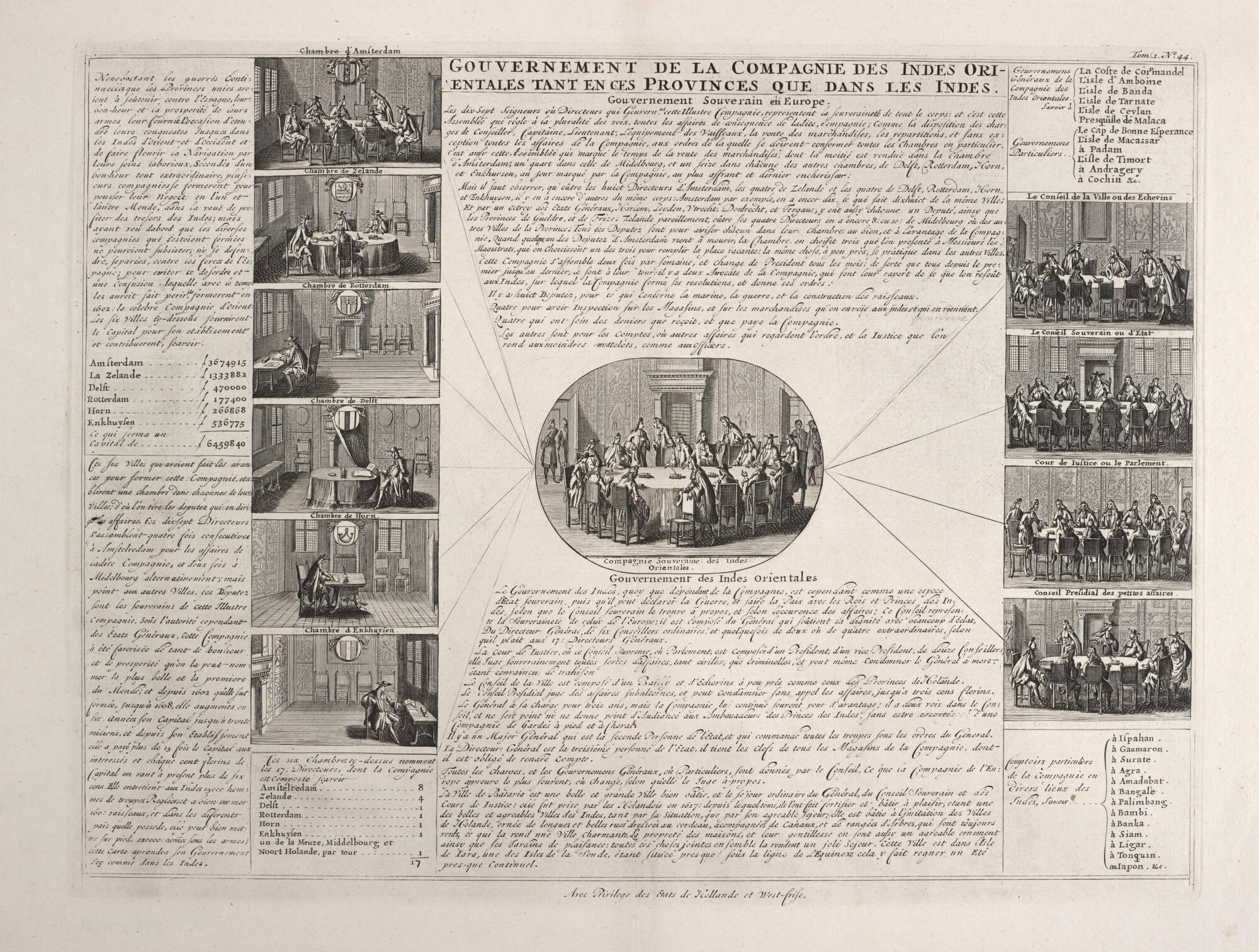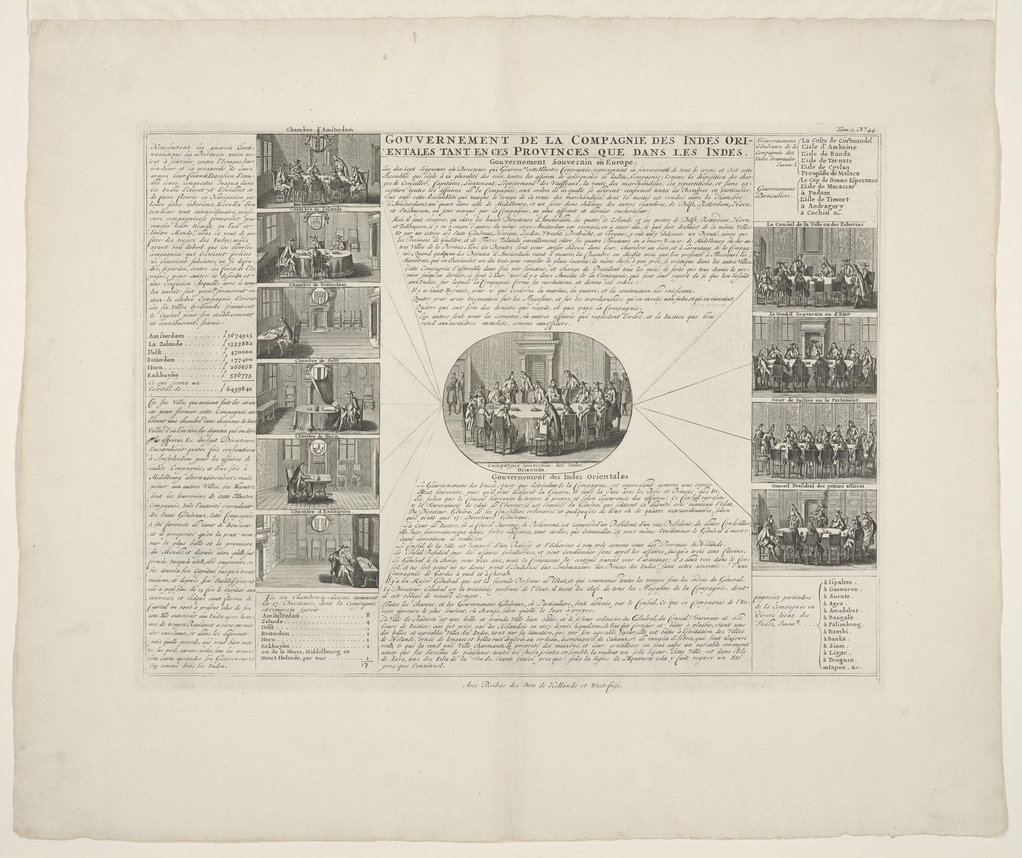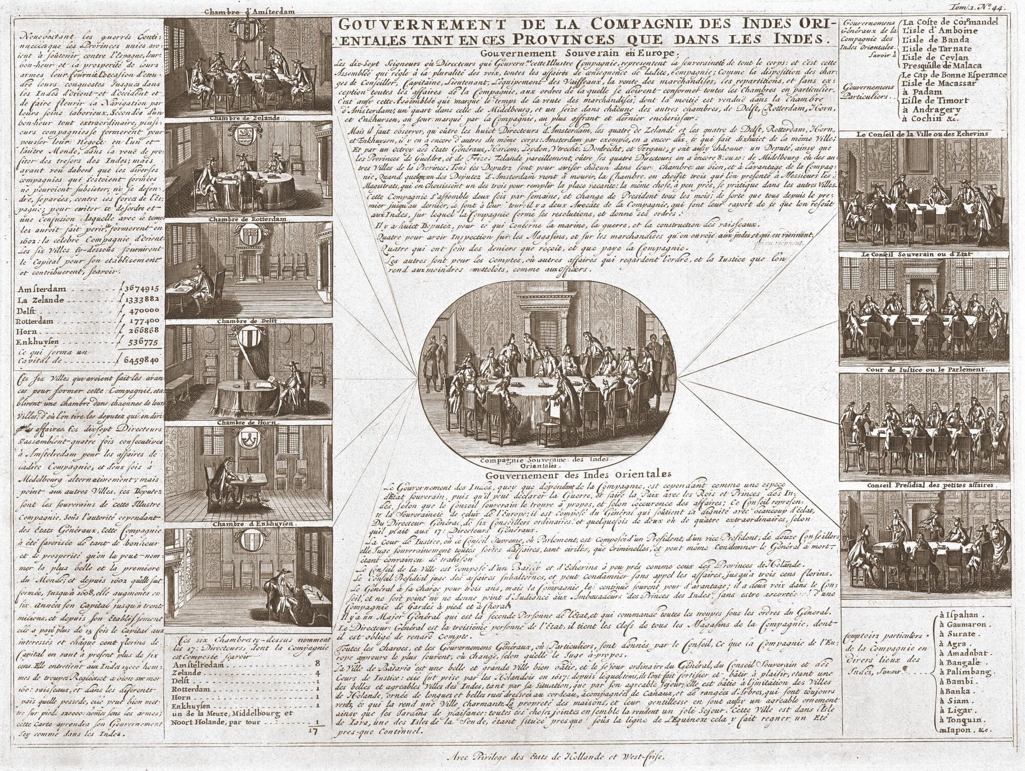 Schematisch overzicht van het bestuur van de VOC: afbeeldingen van de vergadering van de Heren Zeventien met een tiental afbeeldingen, links de zes kamers in Nederland in vergadering en rechts de vergadering van vier bestuurscolleges van het bestuur in Indië , met toelichting in het Frans. Prent oorspronkelijk afkomstig uit het boek Histoire abrégée des ...