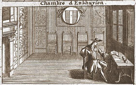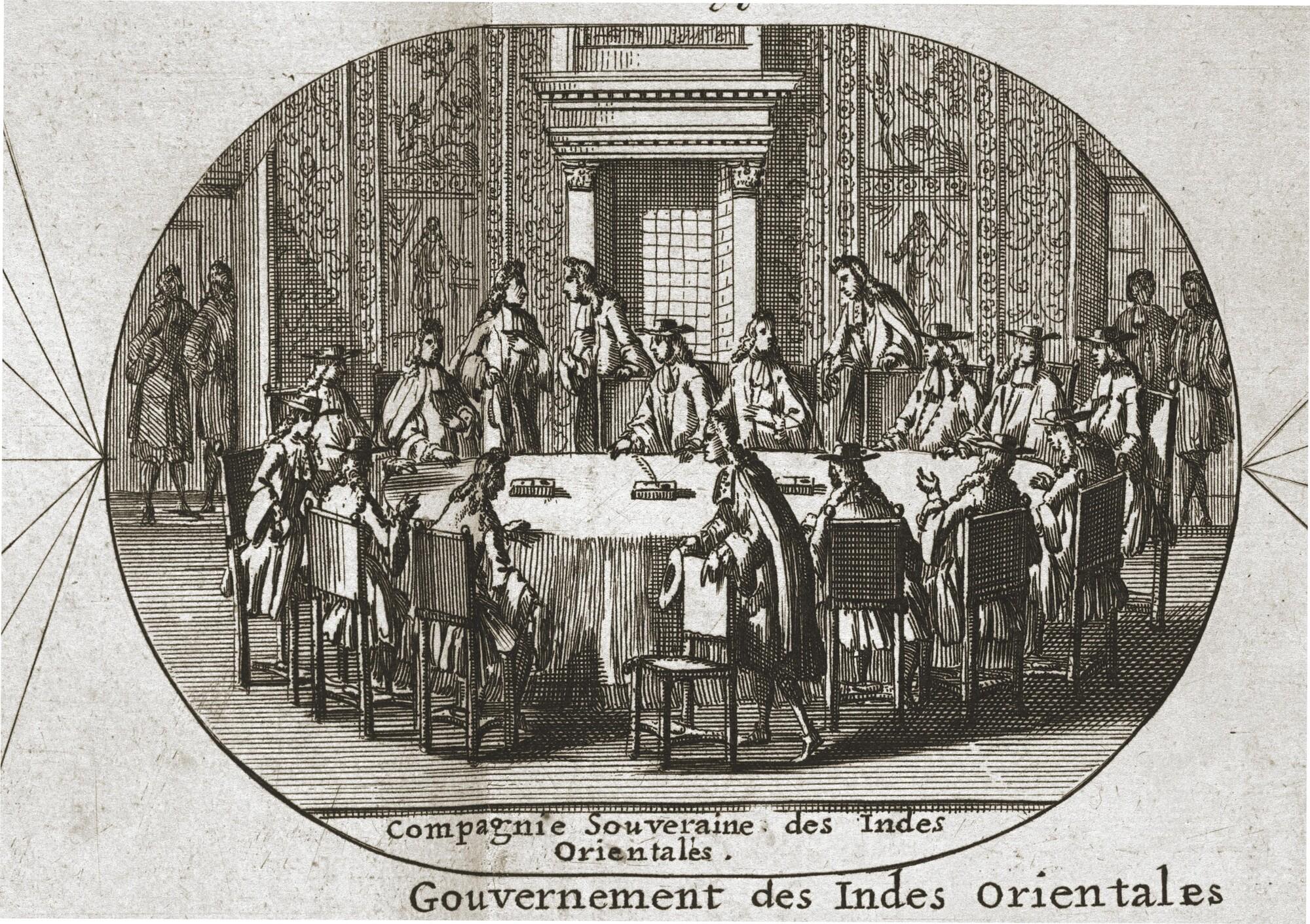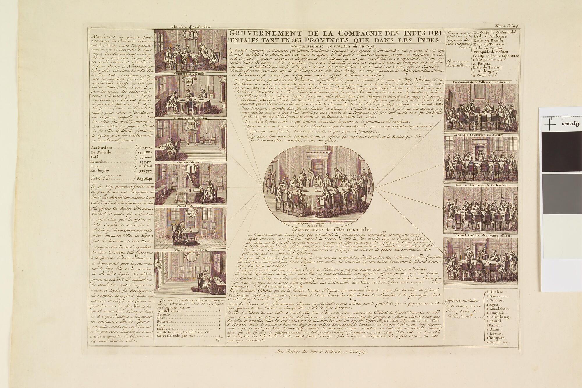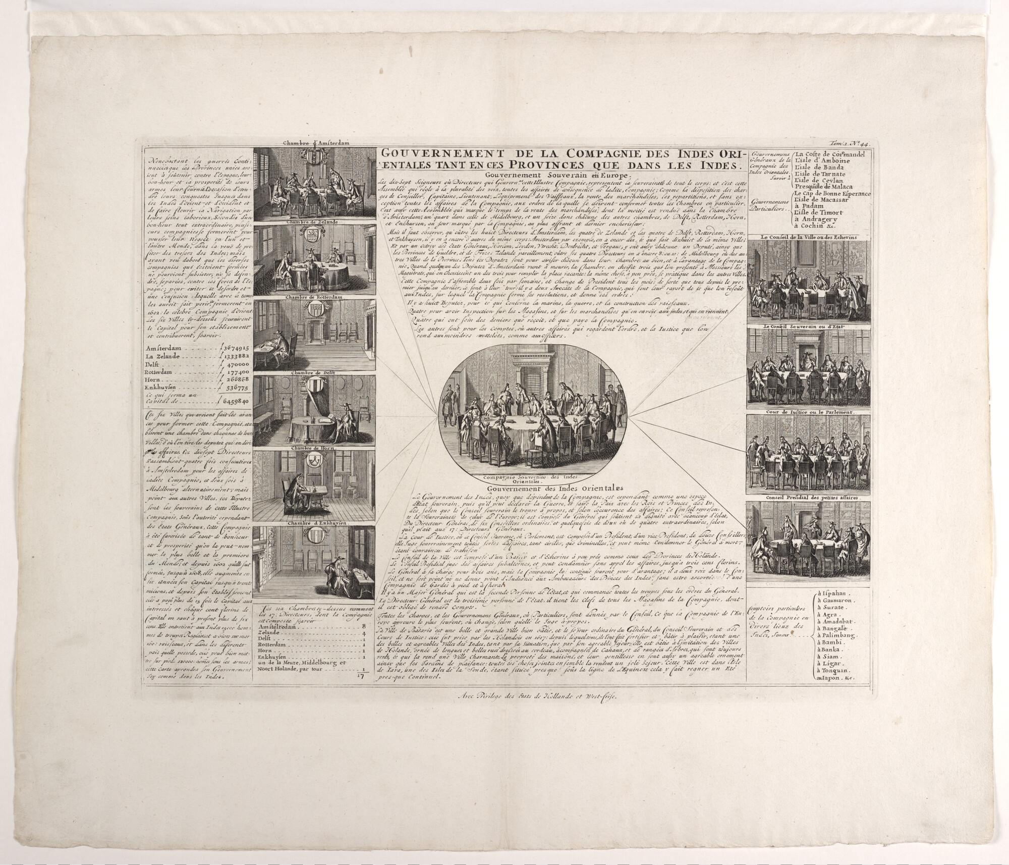 Schematisch overzicht van het bestuur van de VOC: afbeeldingen van de vergadering van de Heren Zeventien met een tiental afbeeldingen, links de zes kamers in Nederland in vergadering en rechts de vergadering van vier bestuurscolleges van het bestuur in Indië , met toelichting in het Frans. Prent oorspronkelijk afkomstig uit het boek Histoire abrégée des ...