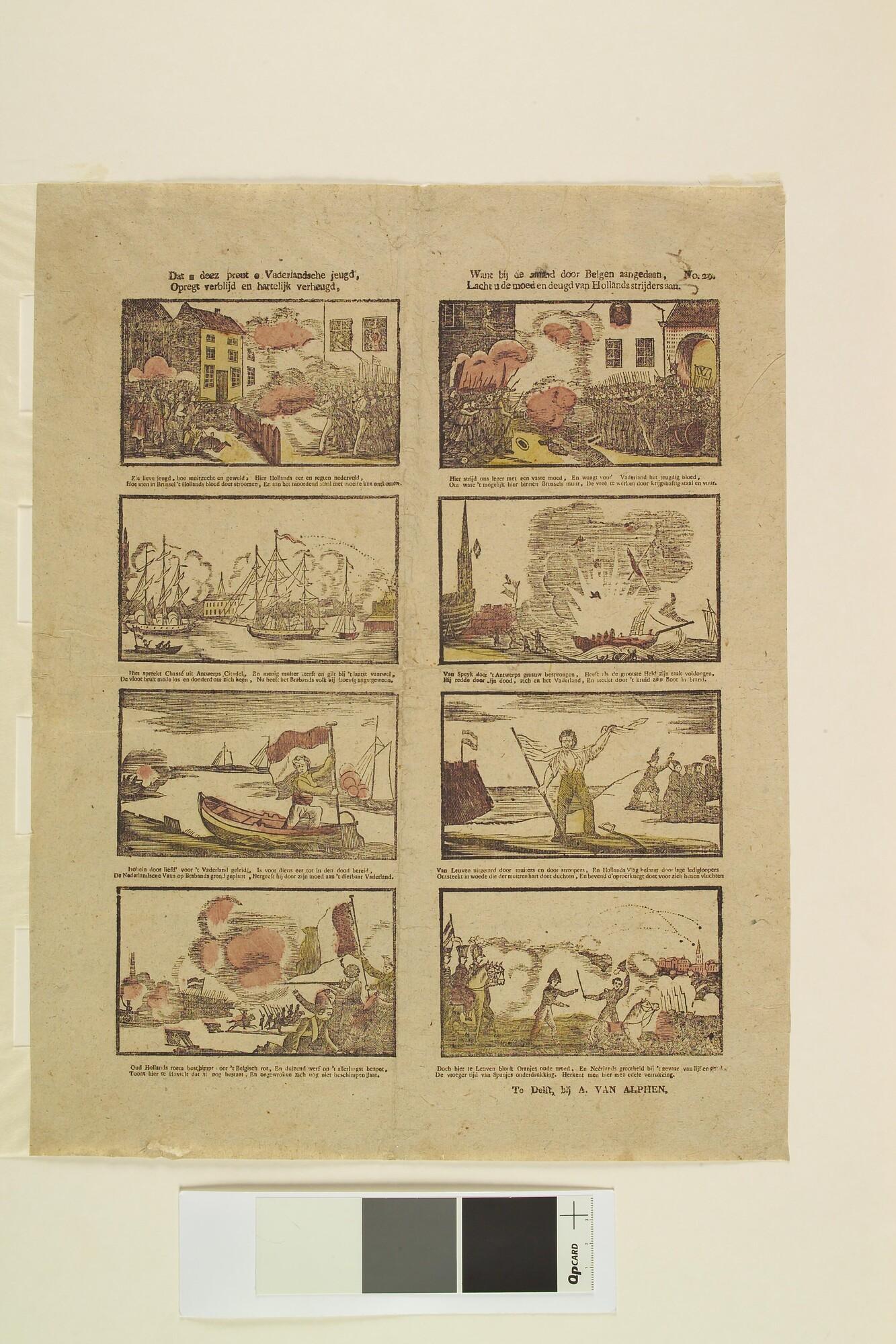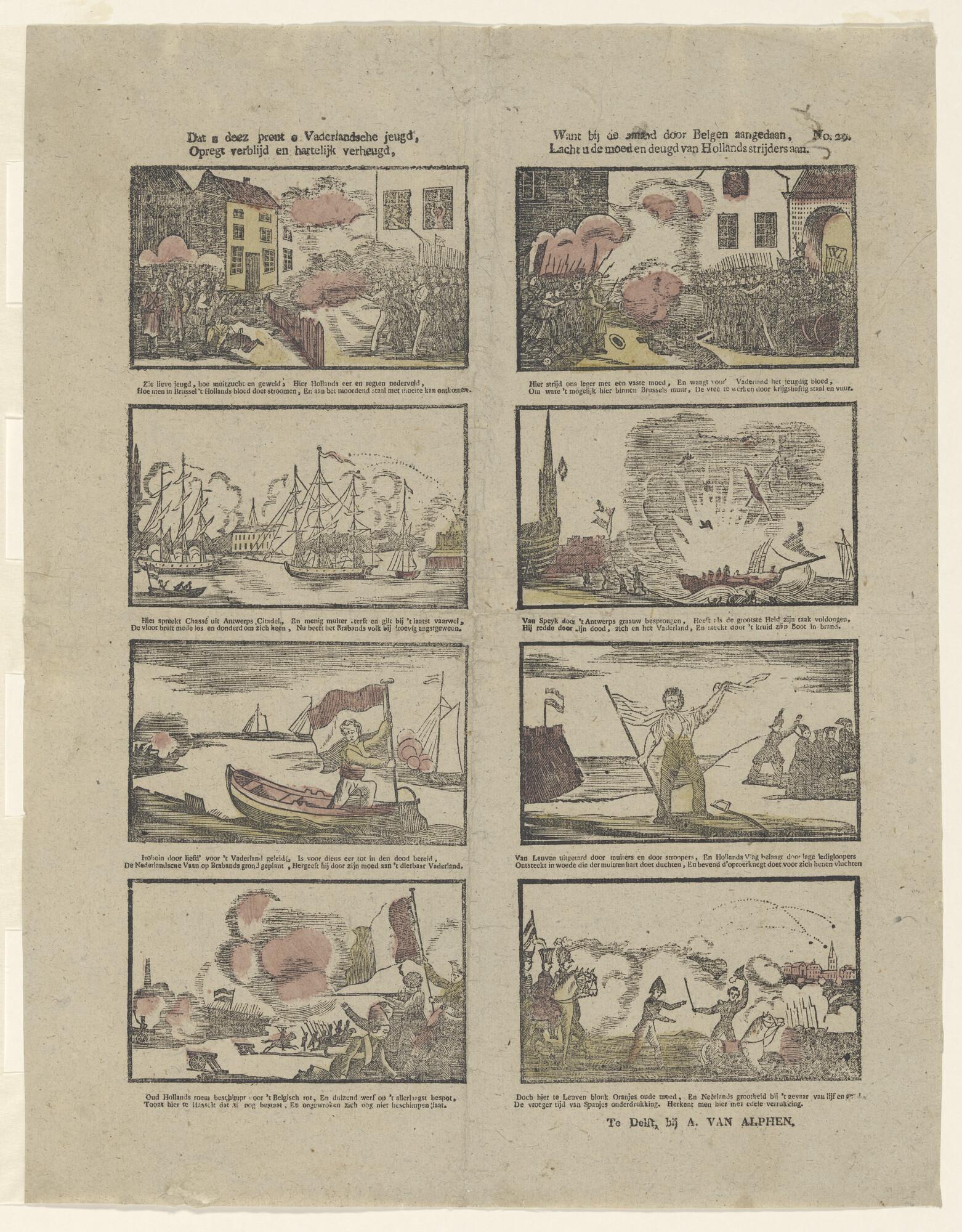 kinderprent met 8 afbeeldingen. De Belgische Opstand, 1830-1831, onder meer de heldendaden van Hobein en Van Speyk.