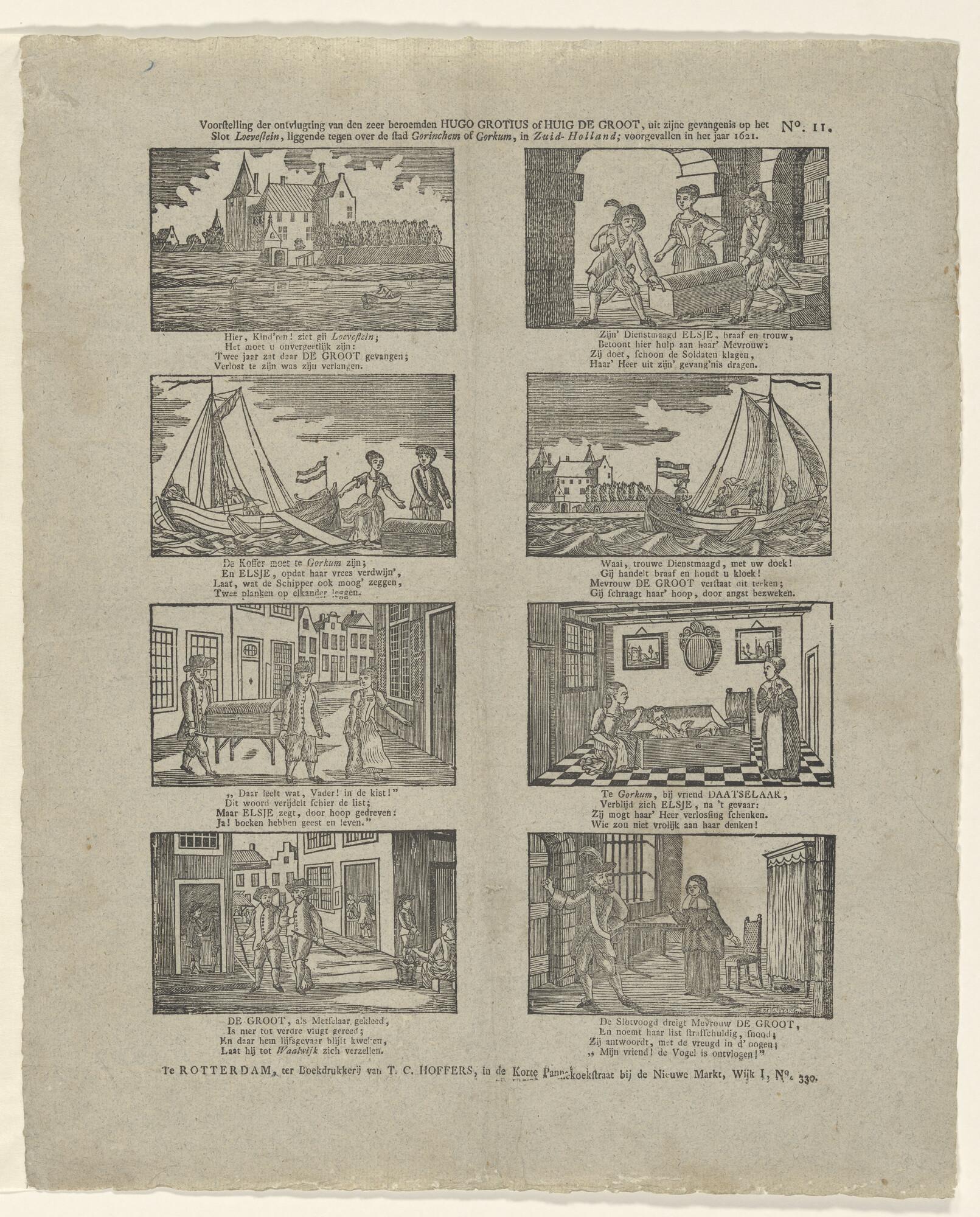 Kinderprent met 8 afbeeldingen. De ontsnapping van Hugo de Groot uit Slot Loevestein, 1621.
