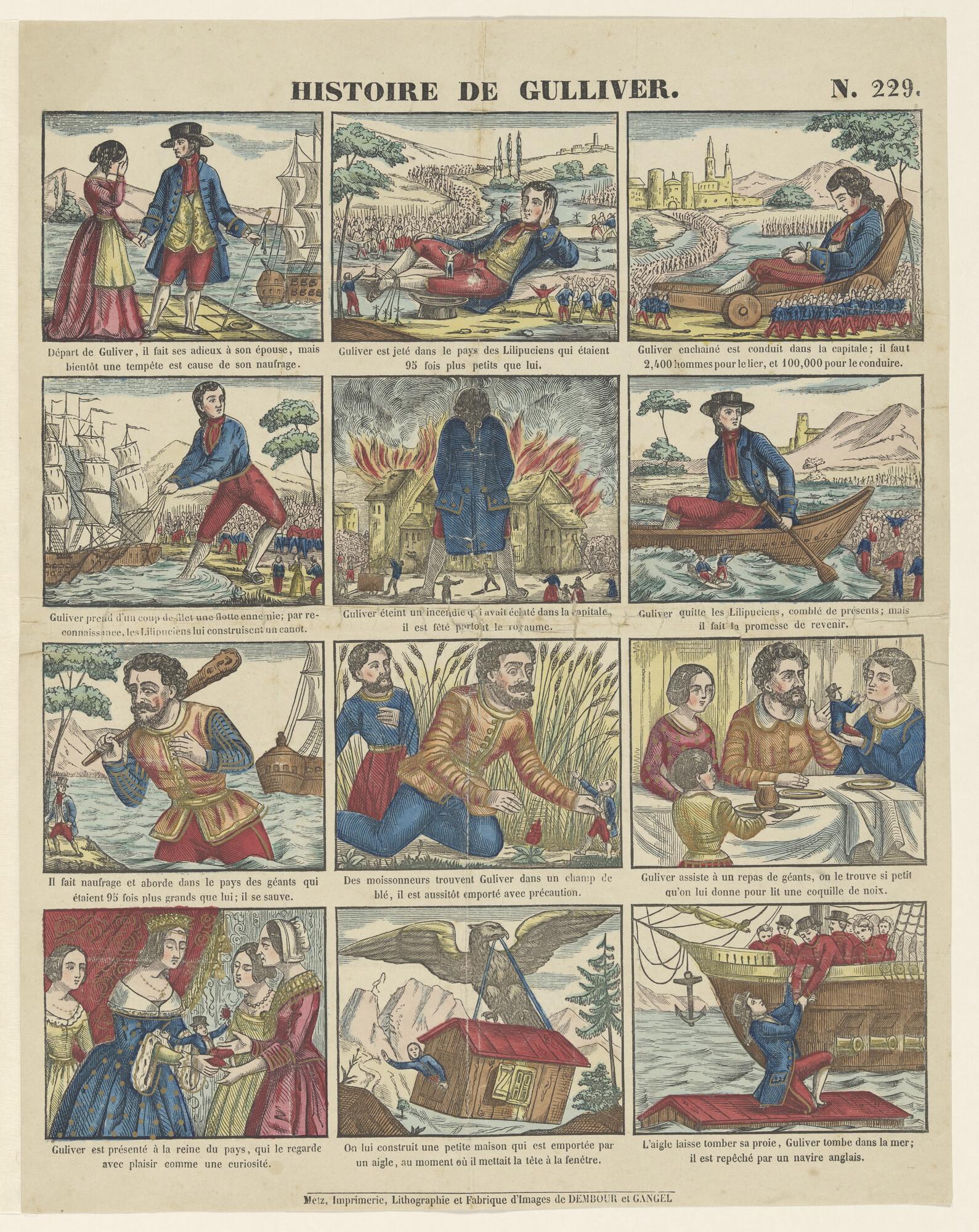 kinderprent met 12 afbeeldingen en onderschriften in het Frans. Gullivers reizen.
