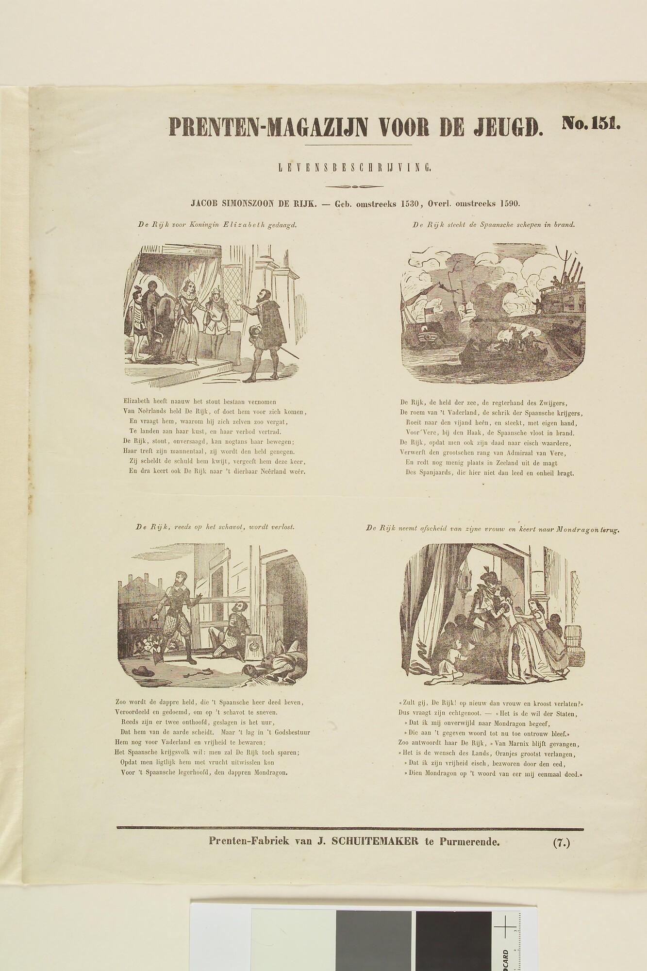 Levensbeschrijving van Jacob Simonszoon de Rijck (omstreeks 1530 - 1590), kinderprent met vier afbeeldingen en bijschriften..