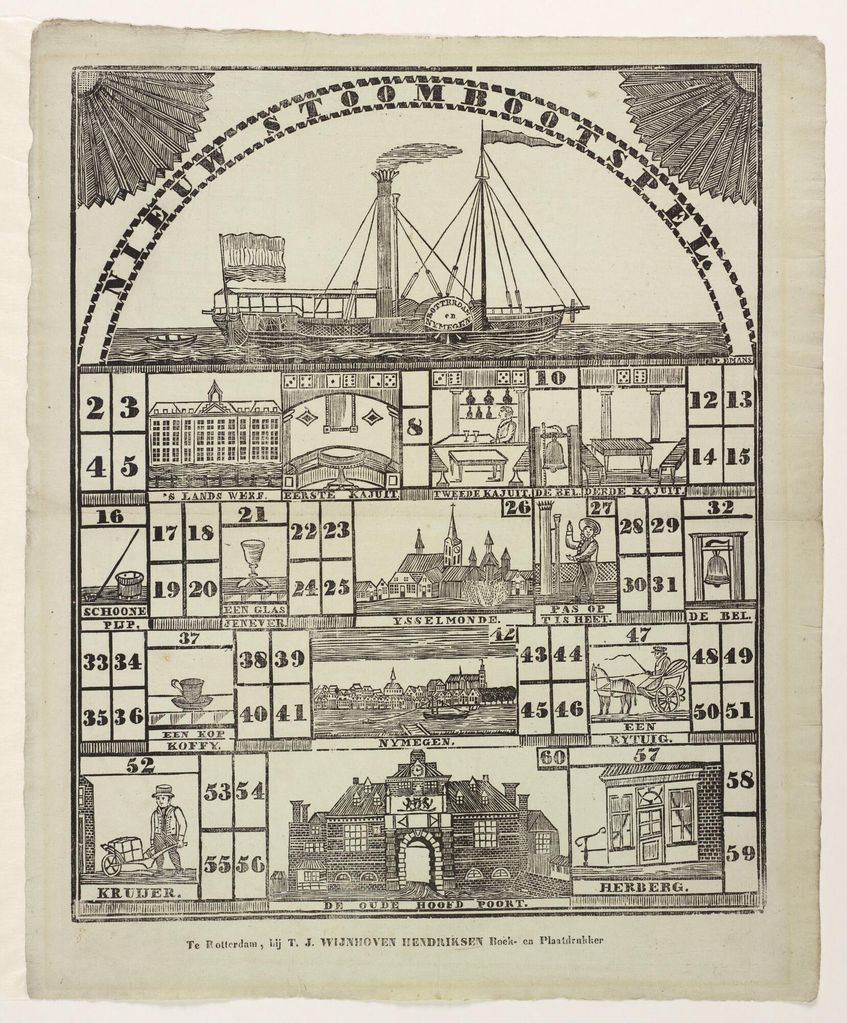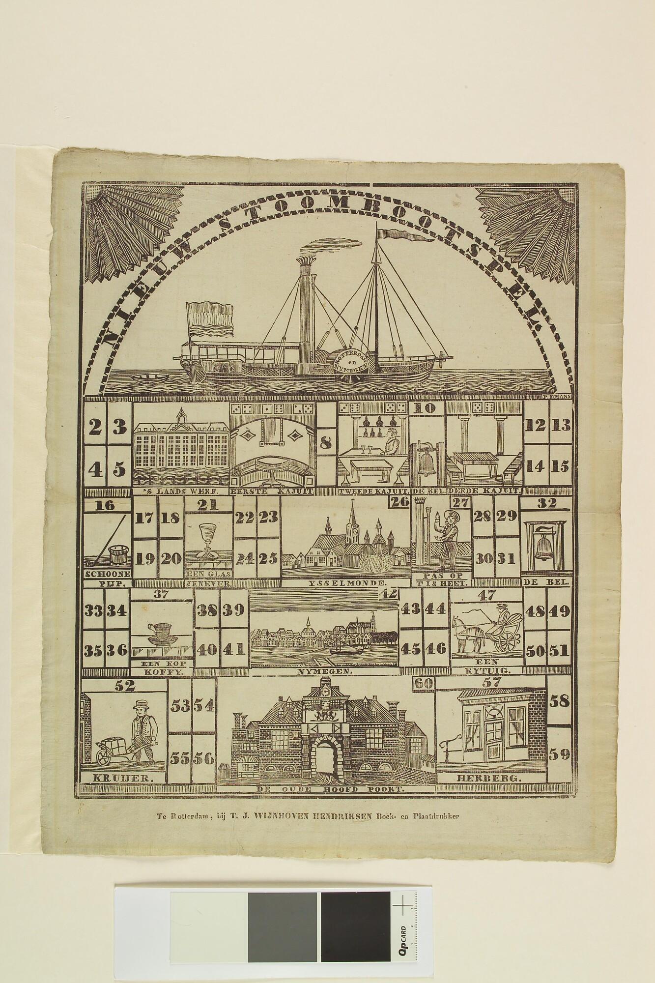 Nieuw Stoombootspel, met afbeelding van het raderstoomschip "Nederlander" van de Nederlandsche Stoomboot Maatschappij, gebouwd in 1823.