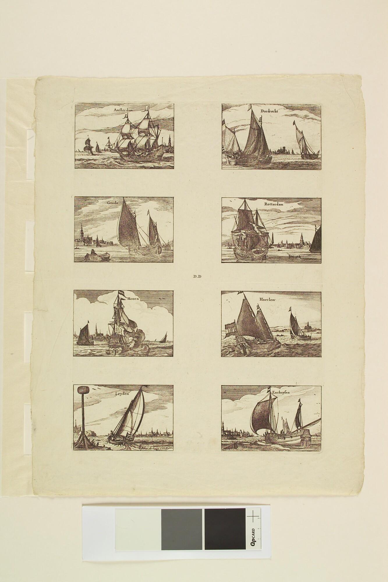 Zee- en binnenschepen op diverse Nederlandse redes omstreeks 1660; kinderprent met acht taferelen.