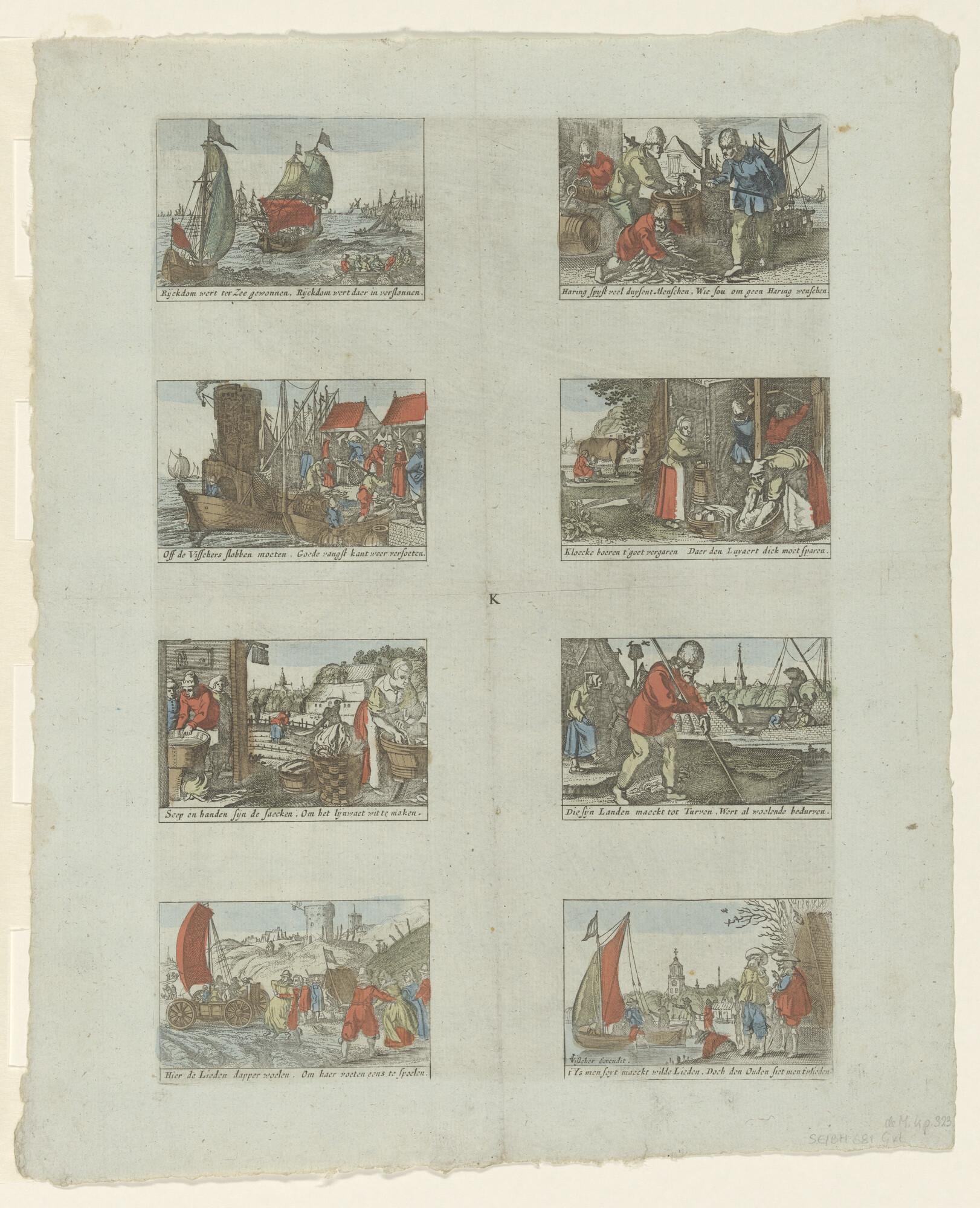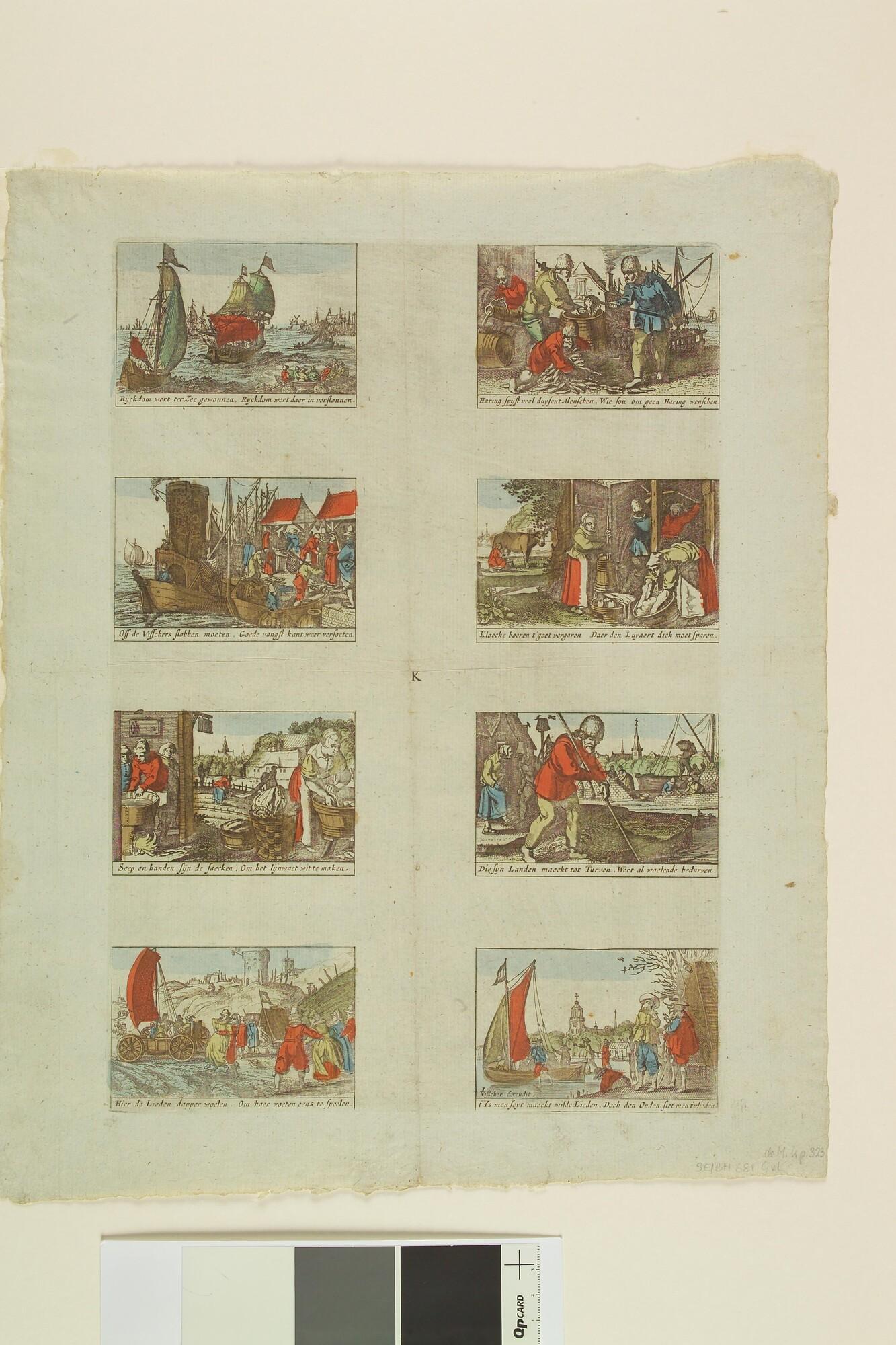 Blad met 8 zinneprenten over de scheepvaart, handel, visserij en vrije tijd; uitgegeven als kinderprent.