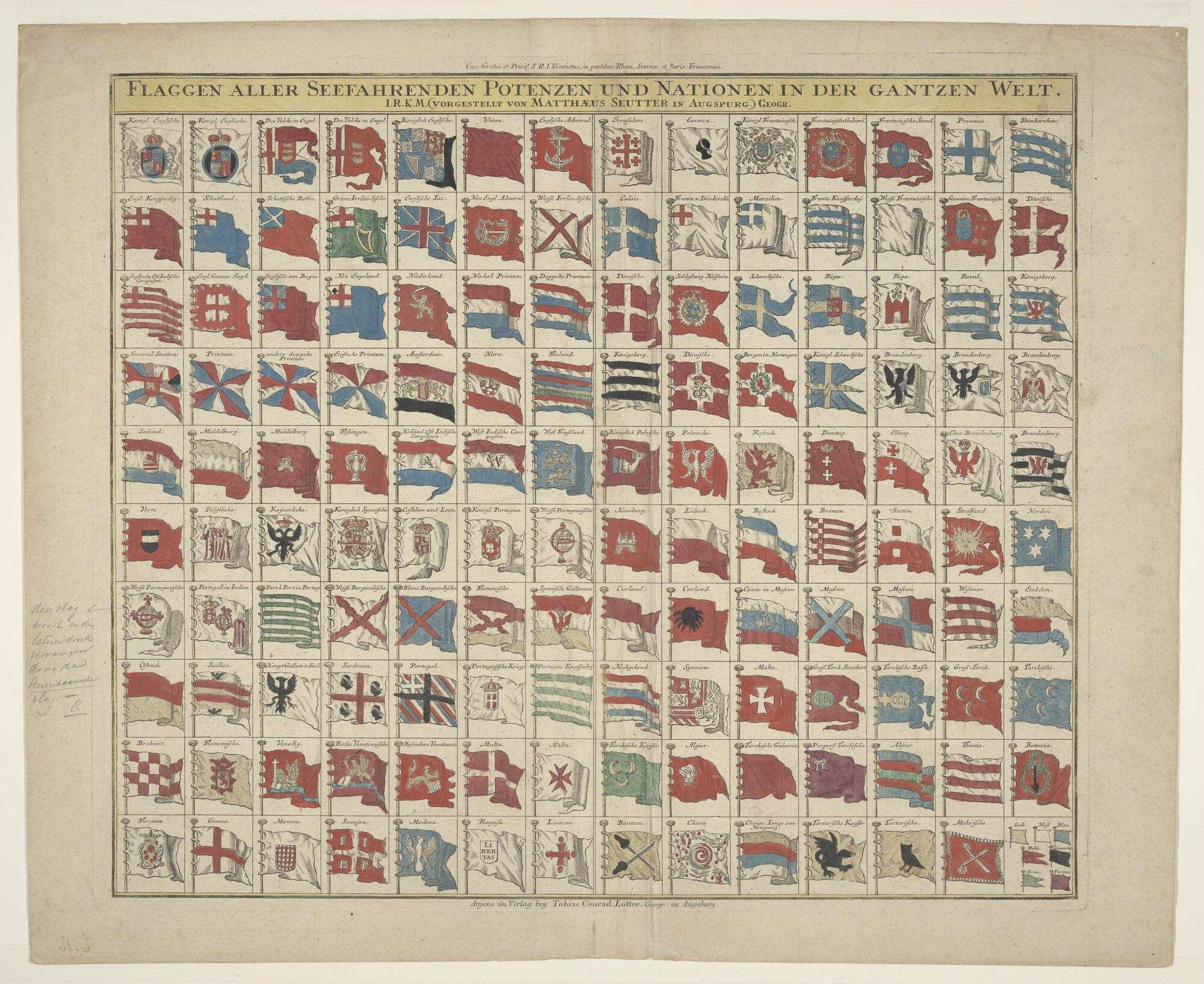 Vlaggenkaart met 139 afbeeldingen van vlaggen van zeevarende naties.