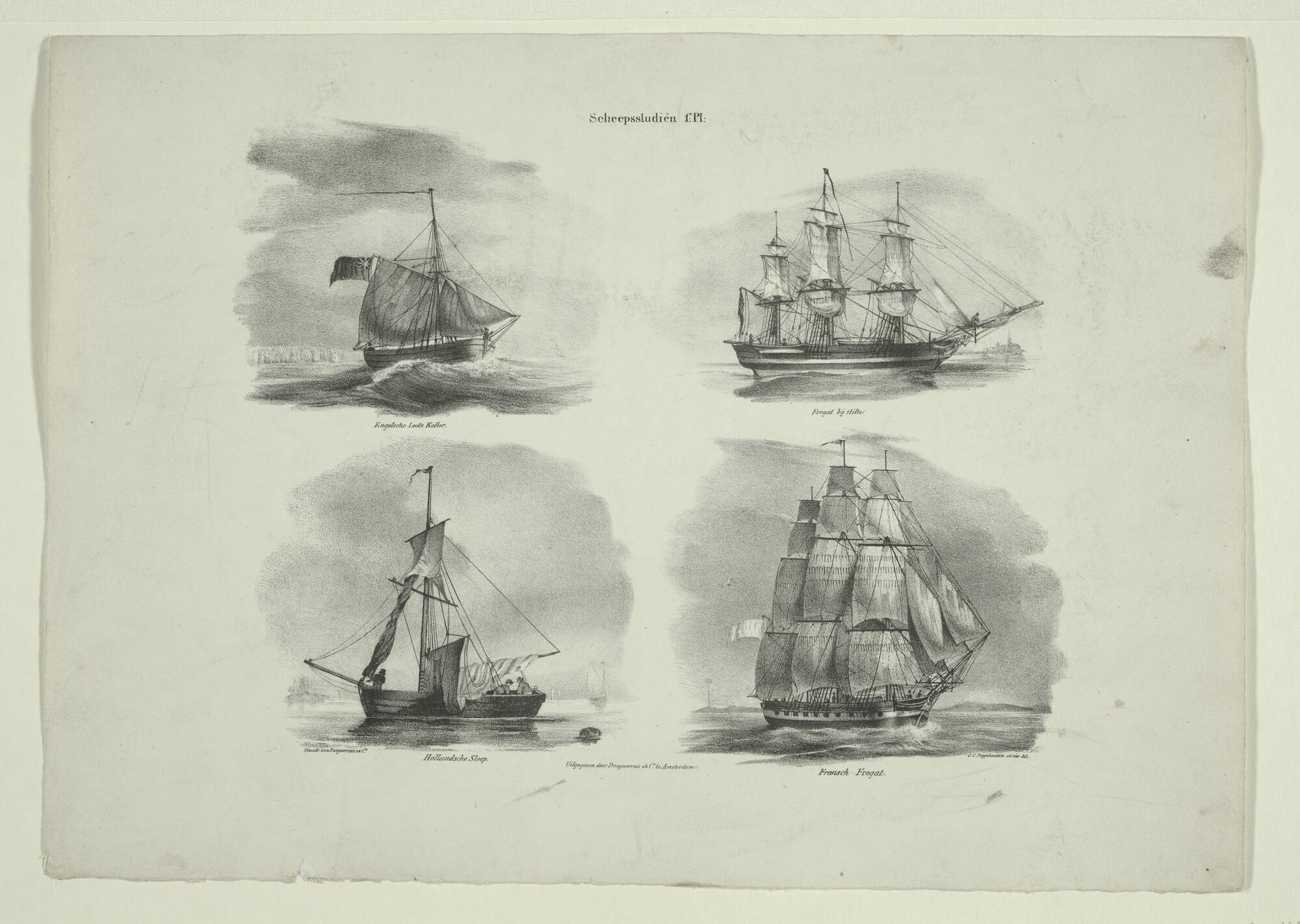 Een Engelse loodskotter, een fregat, een Hollands sloepschip en een Frans fregatschip.