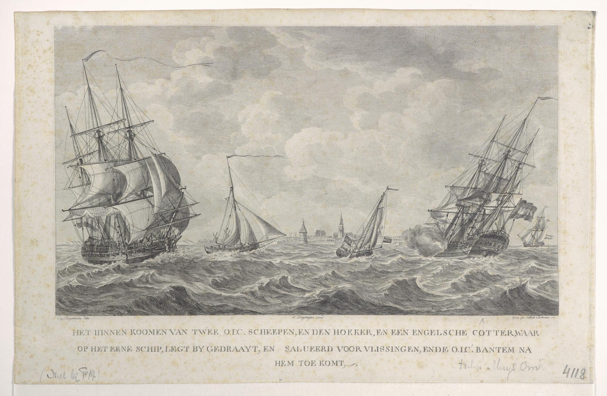 Het binnenzeilen van twee retourschepen van de VOC op de rede van Vlissingen, alsmede een Engelse kotter en een jacht van de VOC, kamer Middelburg.