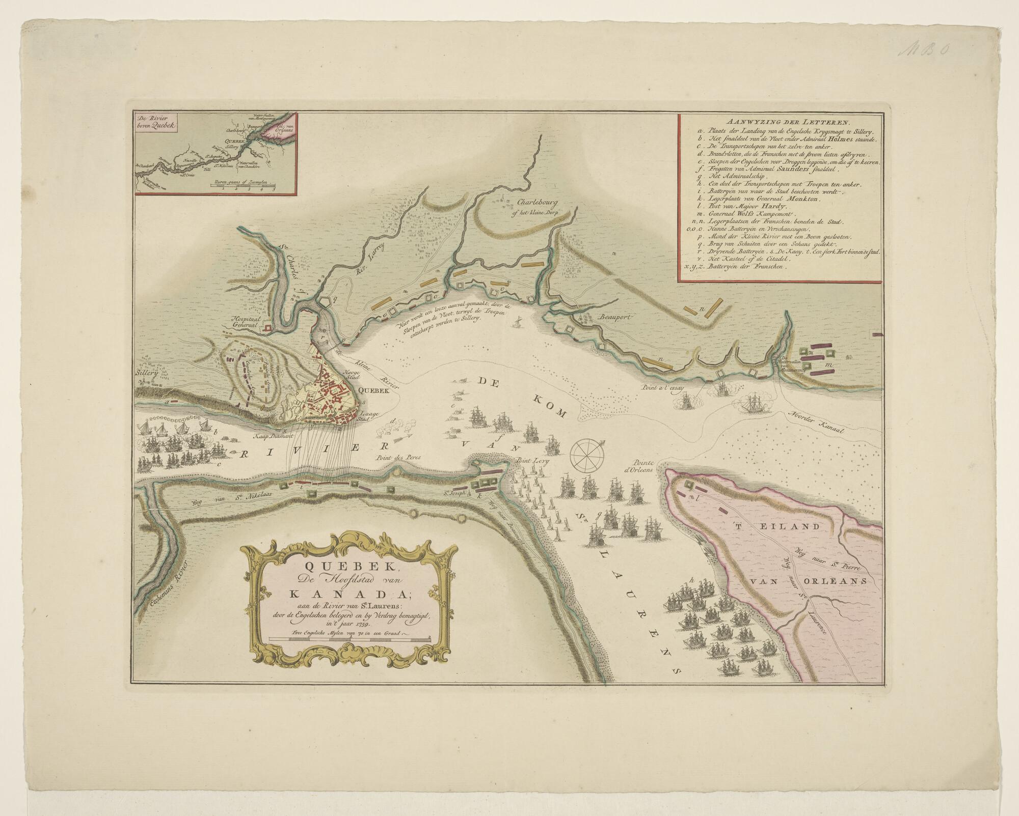 Kaart van de stad Quebec in Canada en omgeving en de belegering door de Engelsen, 1759