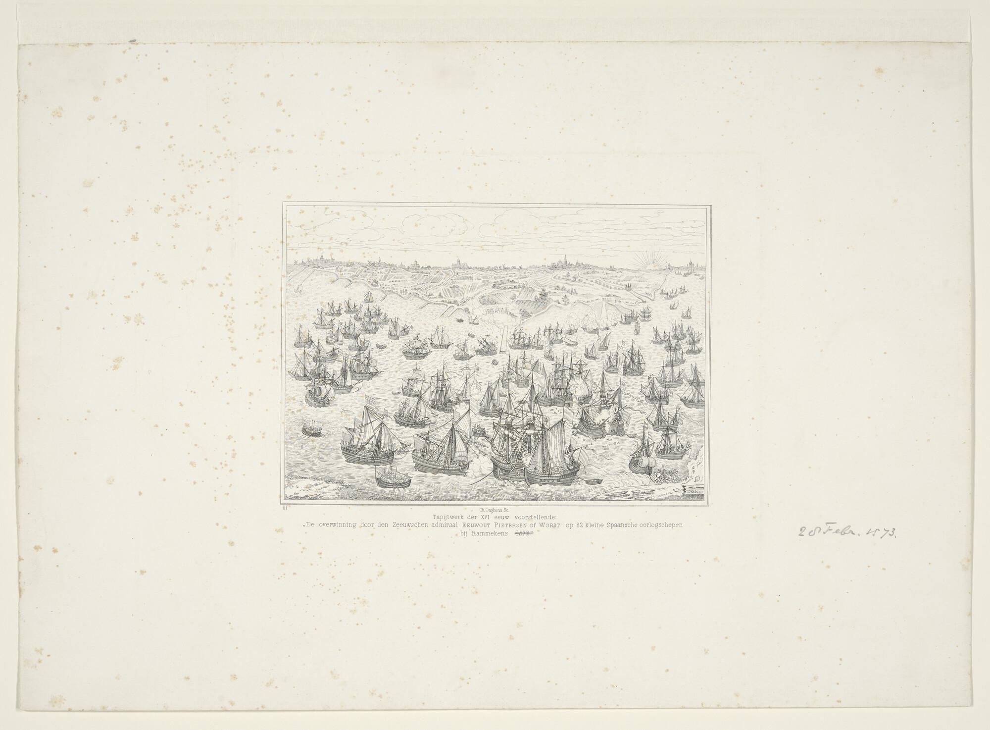 De overwinning door de Zeeuwse admiraal Eeuwout Pietersen of Wordt op 22 kleine spaanse oorlogsschepen bij Rammekens, 28 februari 1573.
