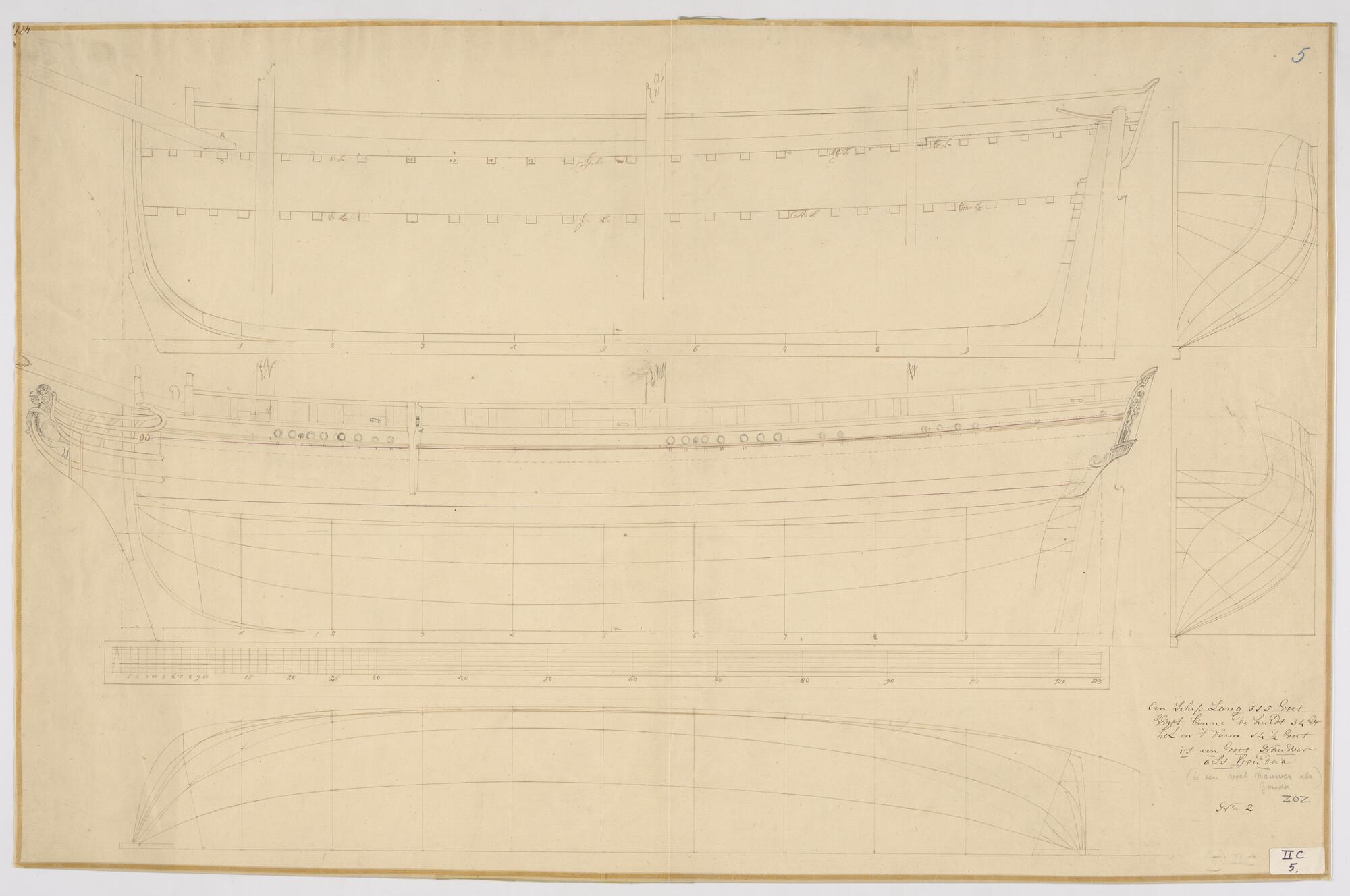 Lijnenplan met zijaanzicht, verticale langsdoorsnede, spantenraam, senten van een driemastschip van 18 stukken. De scheg is voorzien van een klimmende ongekroonde leeuw. Afmetingen van het schip zijn 115 x 34 x 14½ voet.