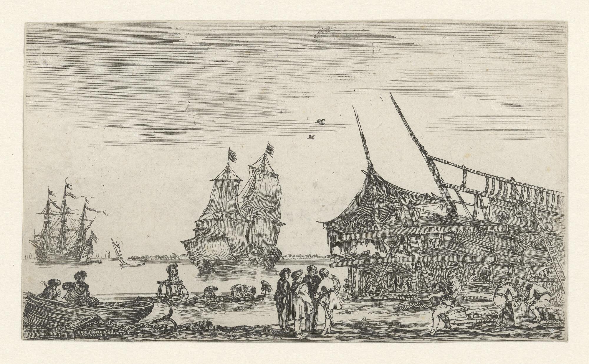 Les trois vues d'Amsterdam: Een schip in aanbouw aan de oever van een rivier.