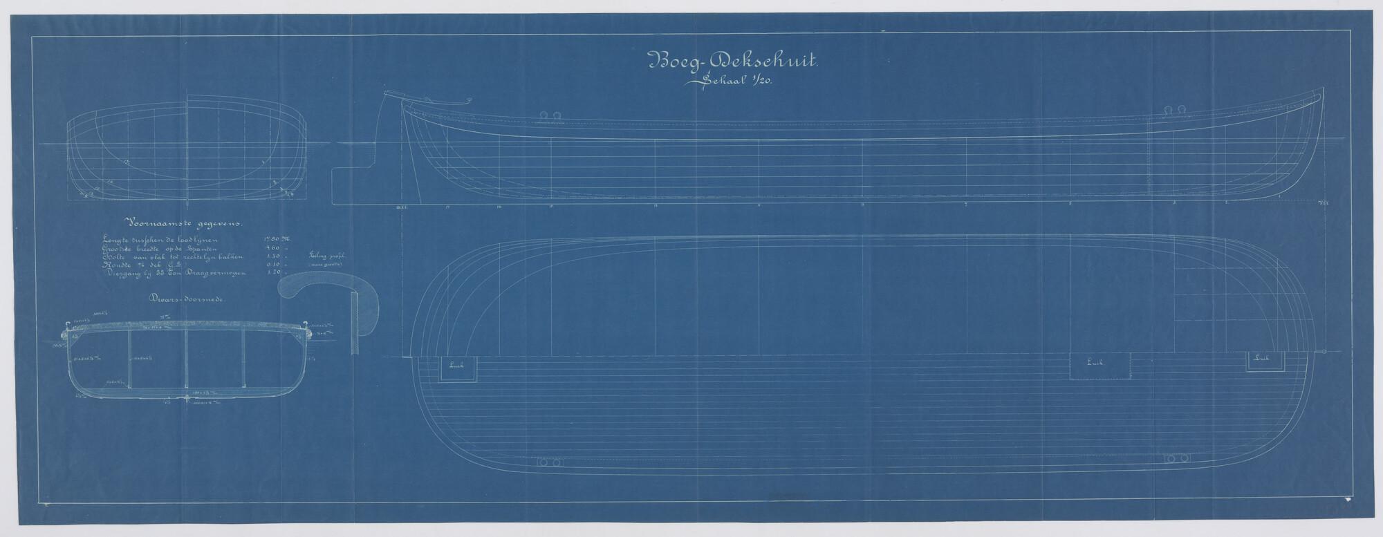 Zij-, boven-, voor- en achteraanzicht, lijnenplan en dwarsdoorsnede van een boegdekschuit, 1891