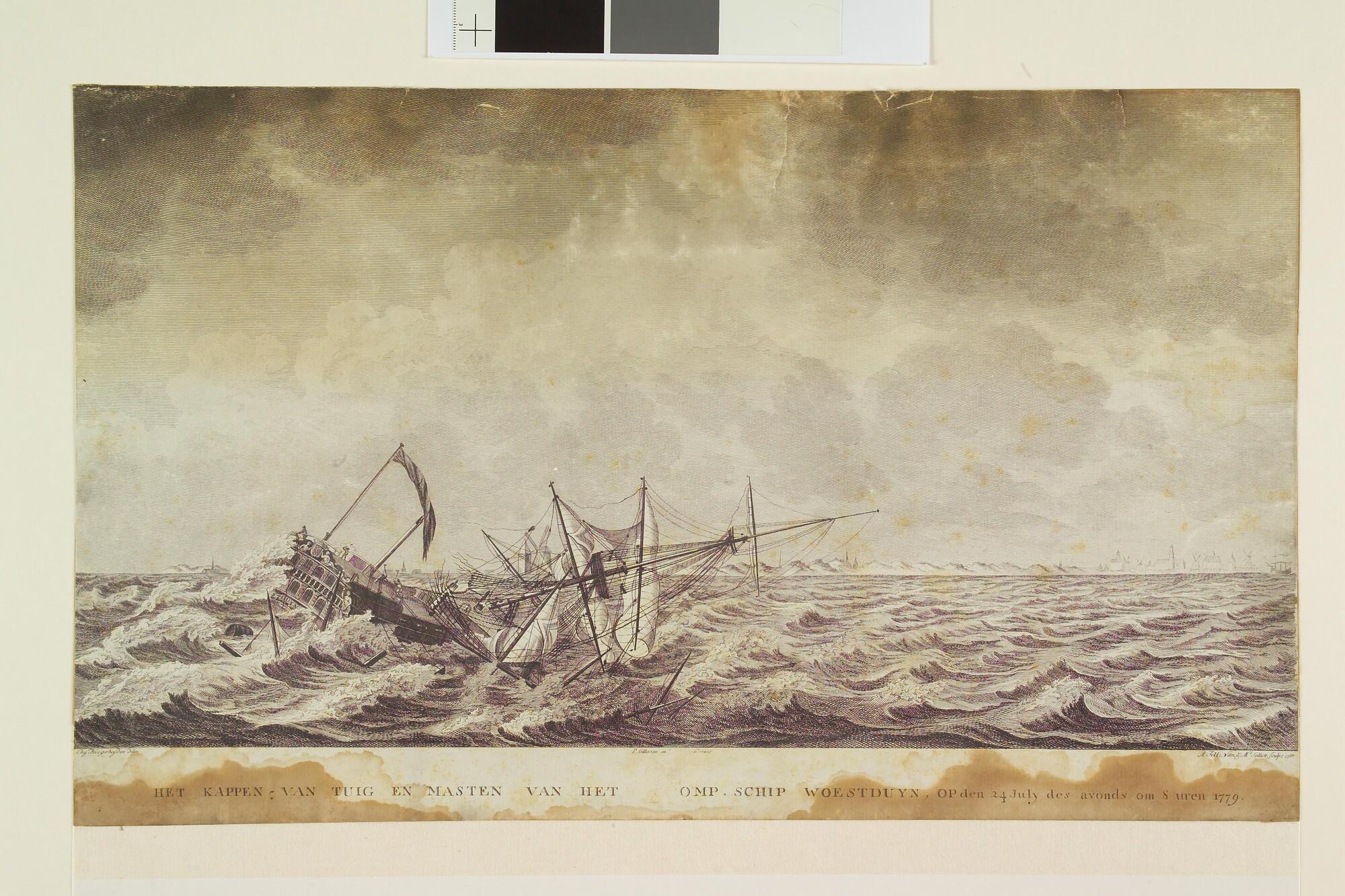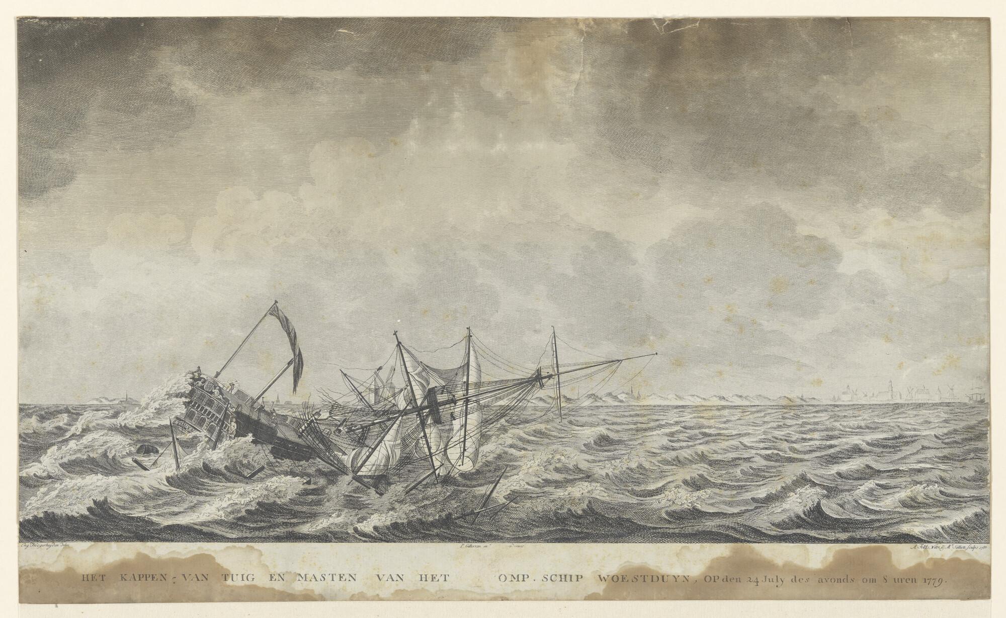 Het kappen - van tuig en masten van het VOC-schip "Woestduin", 1779. Links voor ligt de "Woestduin", half gezonken. De grote mast breekt af. Op het achterschip staan enkele mannen, die met bijlen de touwen kappen.