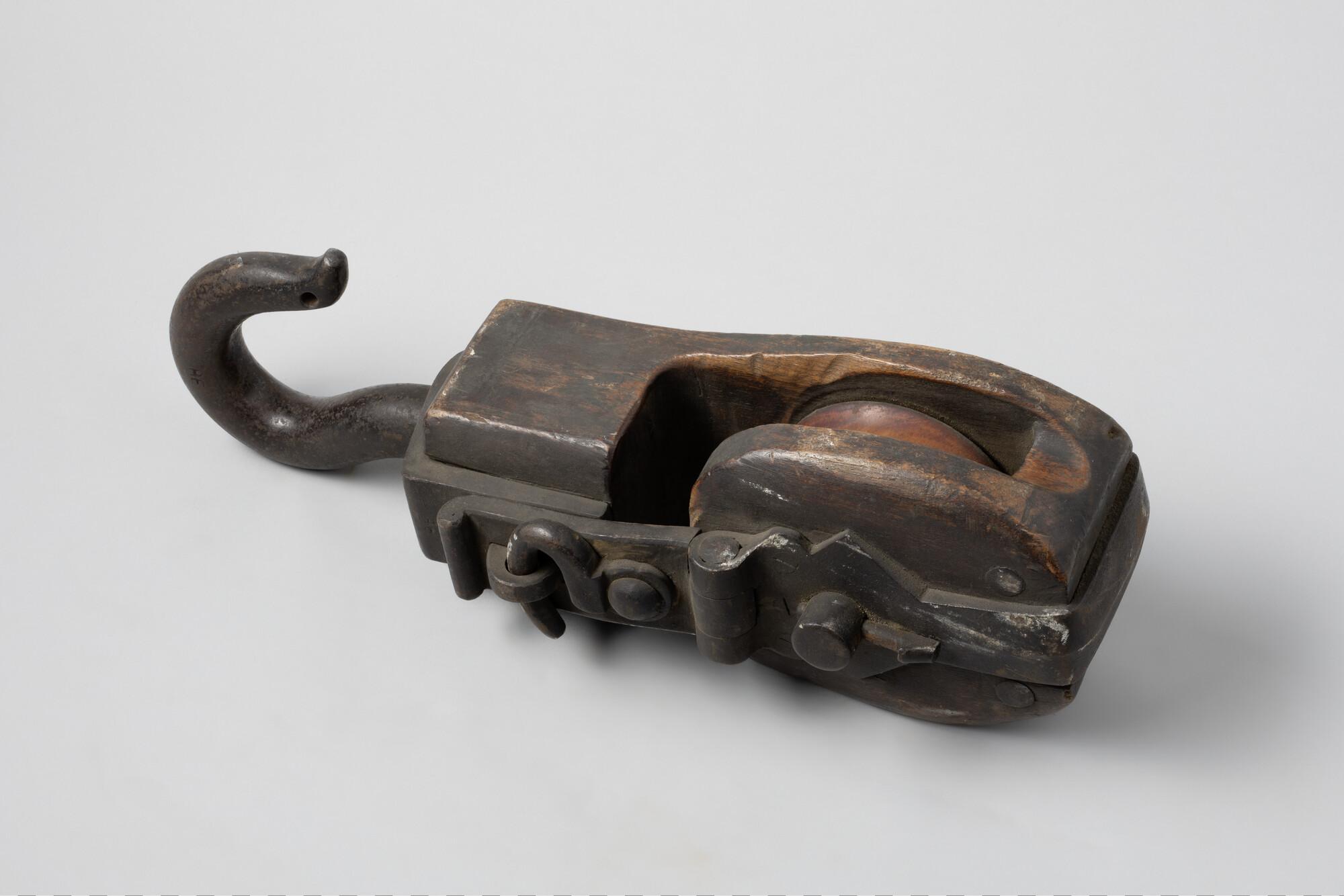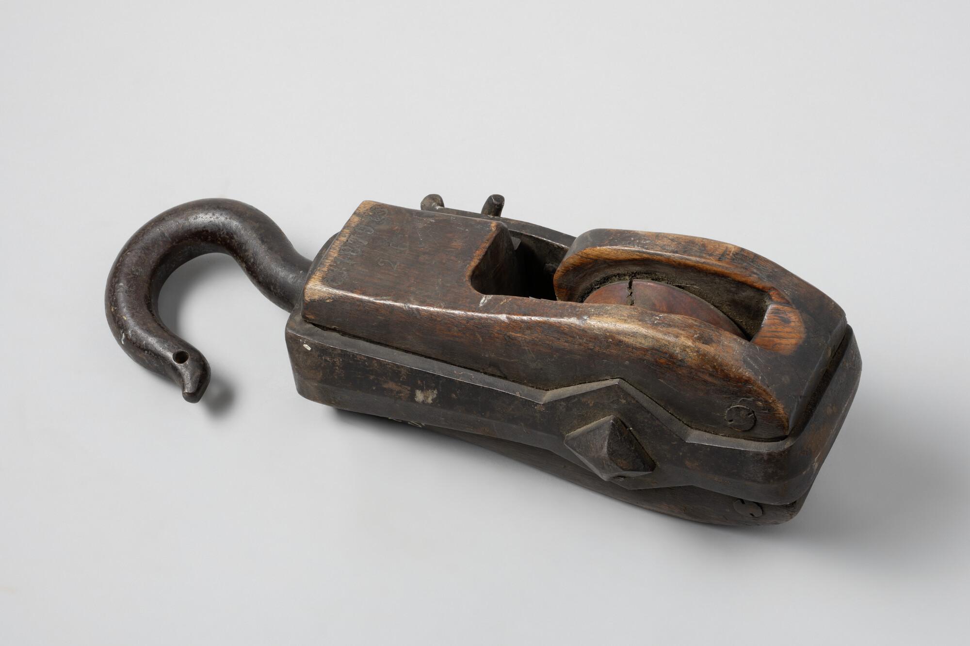 Iepenhouten kinnebaksblok met pokhouten schijf, ijzeren nagel en ijzerbeslag met draaihaak. Gemerkt met twee maal gekruiste ankers, RE, 26 en jaartal 1879. Foutief inv.nr. op object.