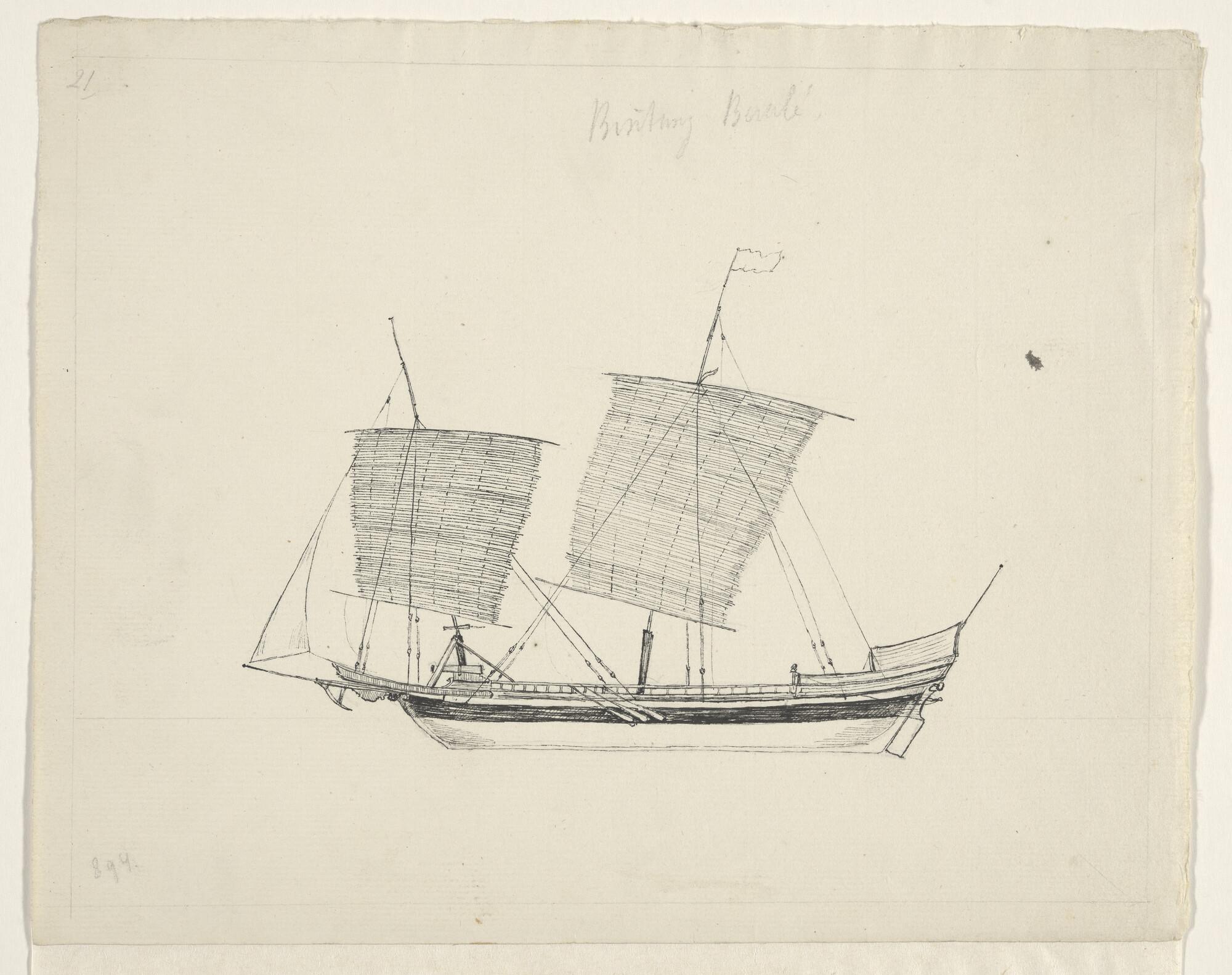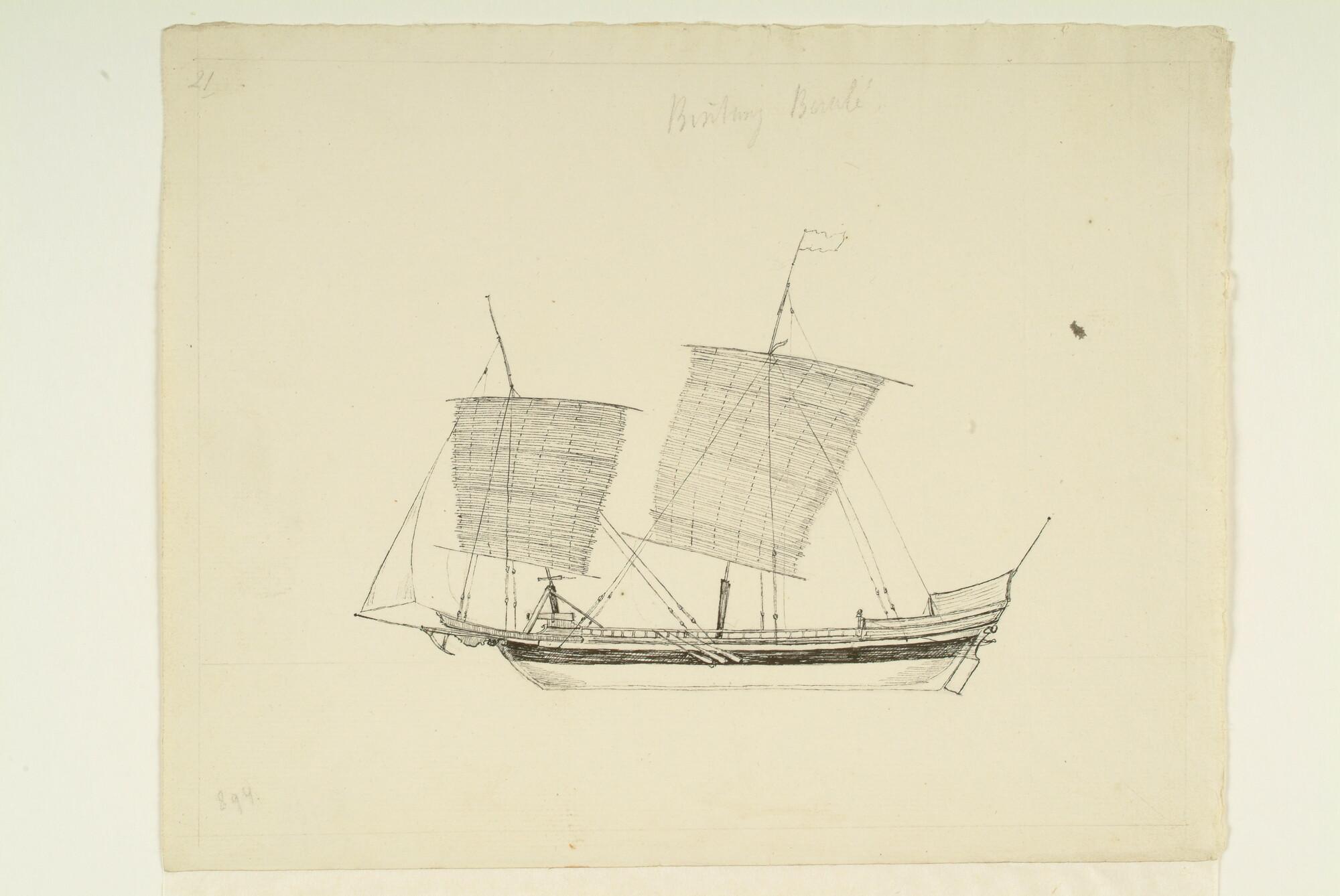 Tekening van een inlands vaartuig uit de Oostindische Archipel: een Bintang Beralé [?].