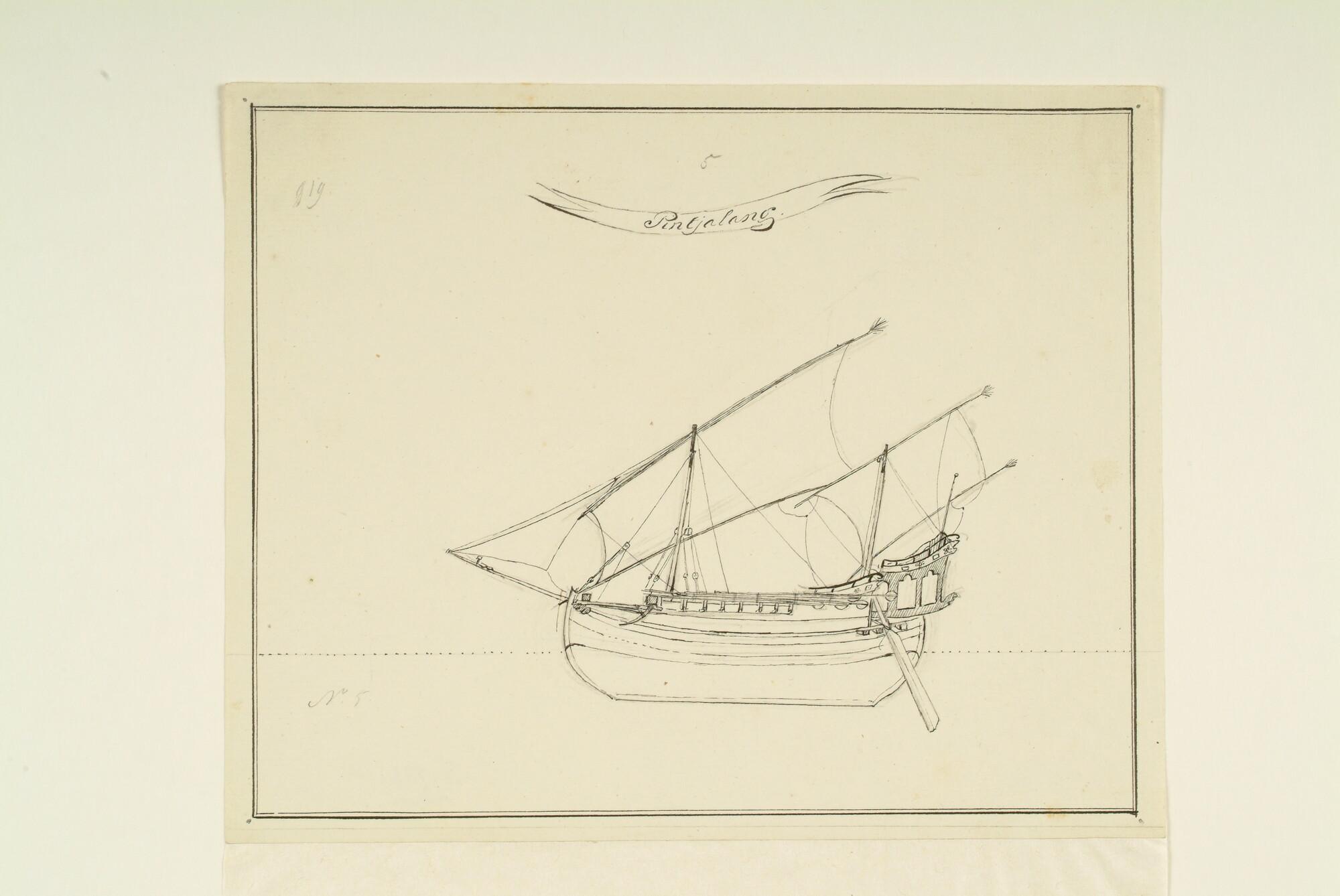 Tekening van een inlands vaartuig uit de Oostindische Archipel: een Pentjalang.