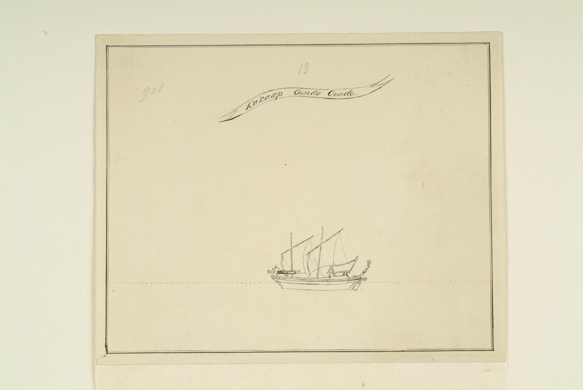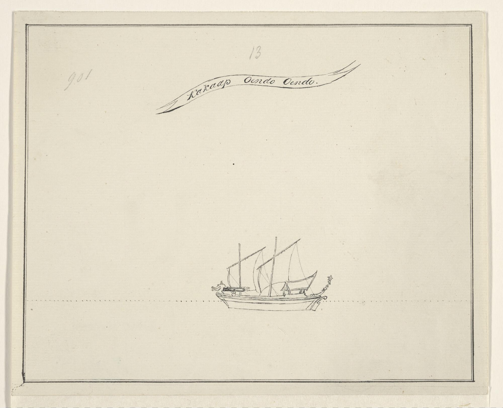 Tekening van een inlands vaartuig uit de Oostindische Archipel: een Kakaap Oendo Oendo