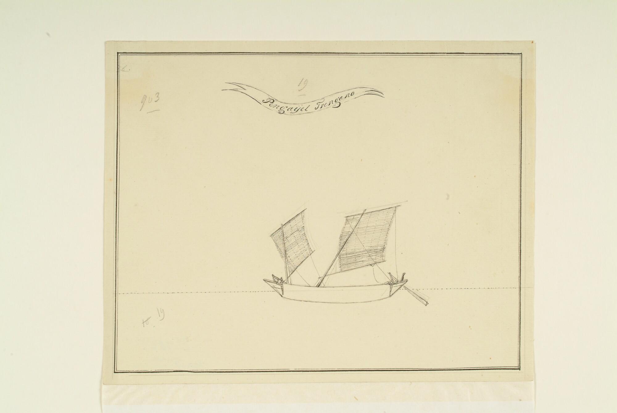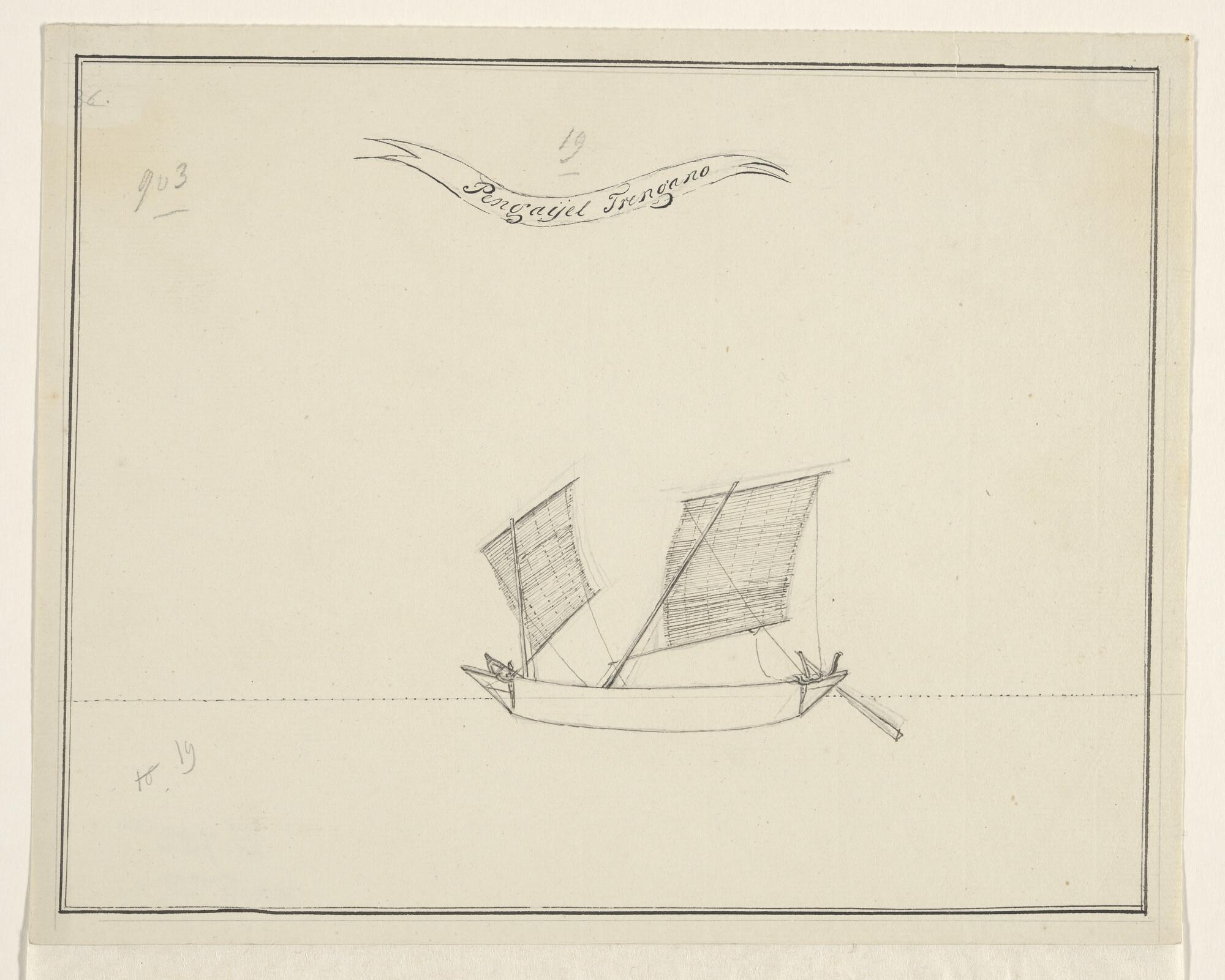 Tekening van een inlands vaartuig uit de Oostindische Archipel: een Pengayet Trengano.