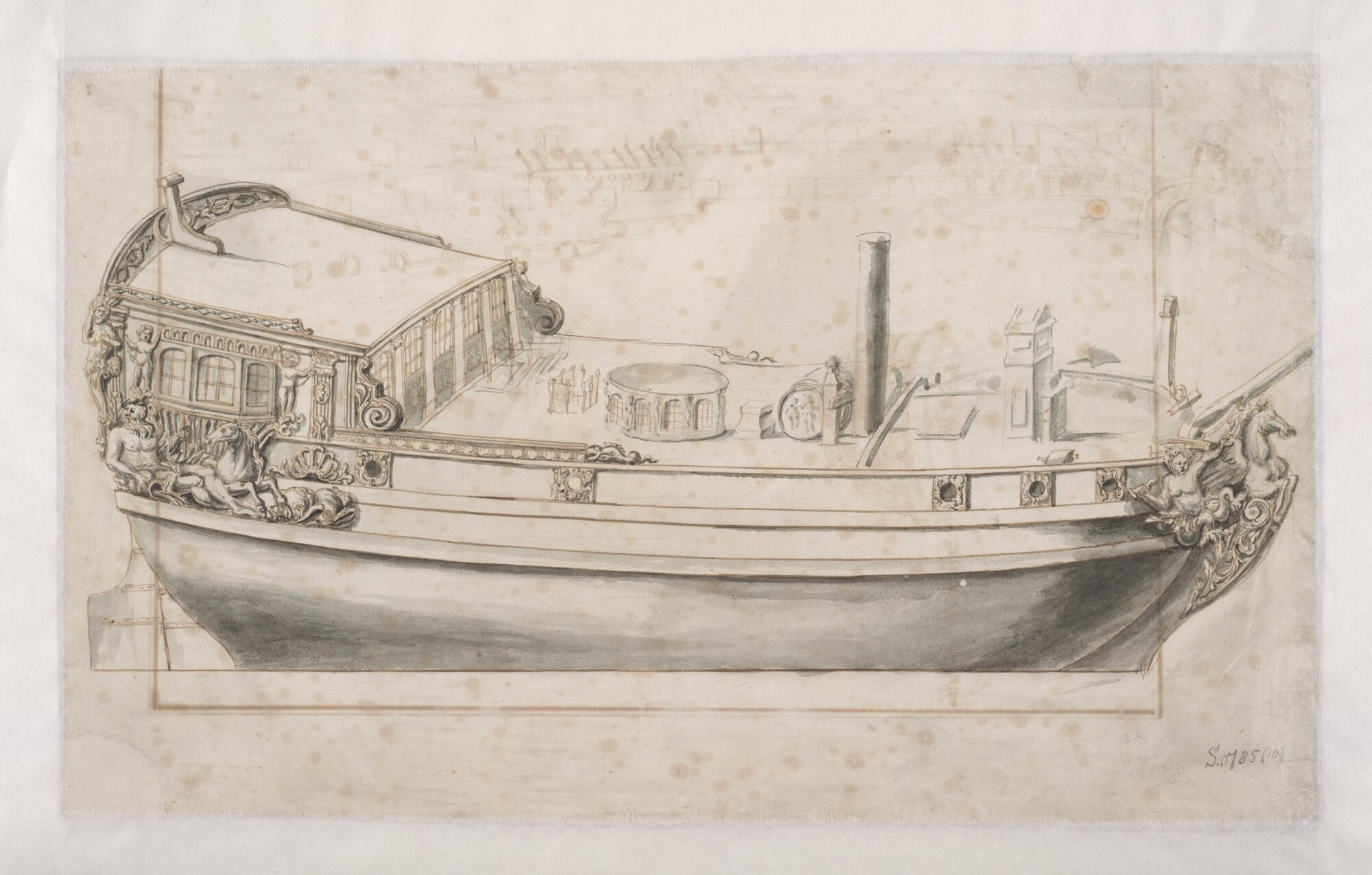 Zijaanzicht op 3/4 van achteren, en spiegelversiering van het fregat 'Wageningen'