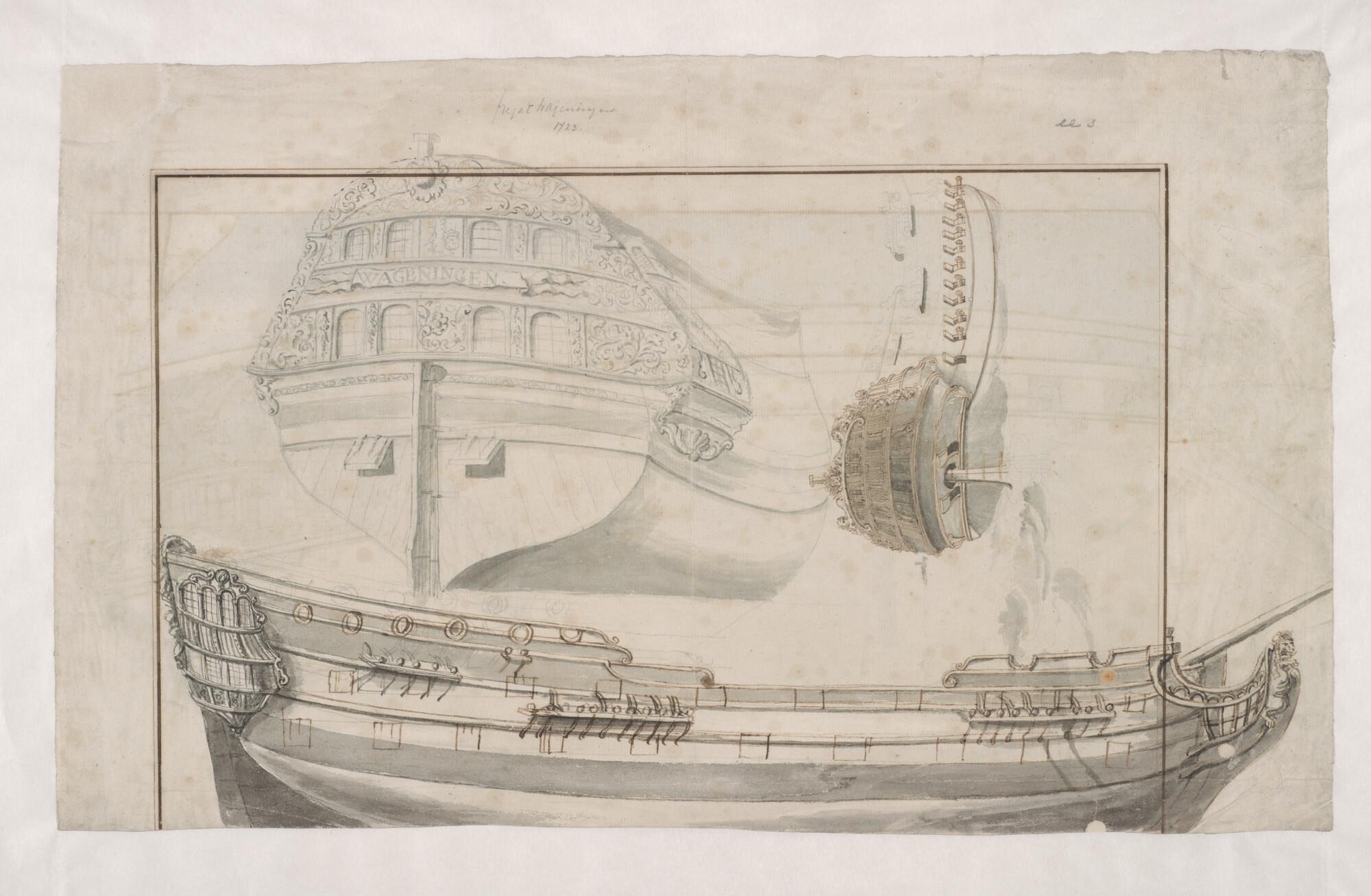 Zijaanzicht op 3/4 van achteren, en spiegelversiering van het fregat "Wageningen" van 36 stukken, gebouwd op de Admiraliteitswerf van Amsterdam.