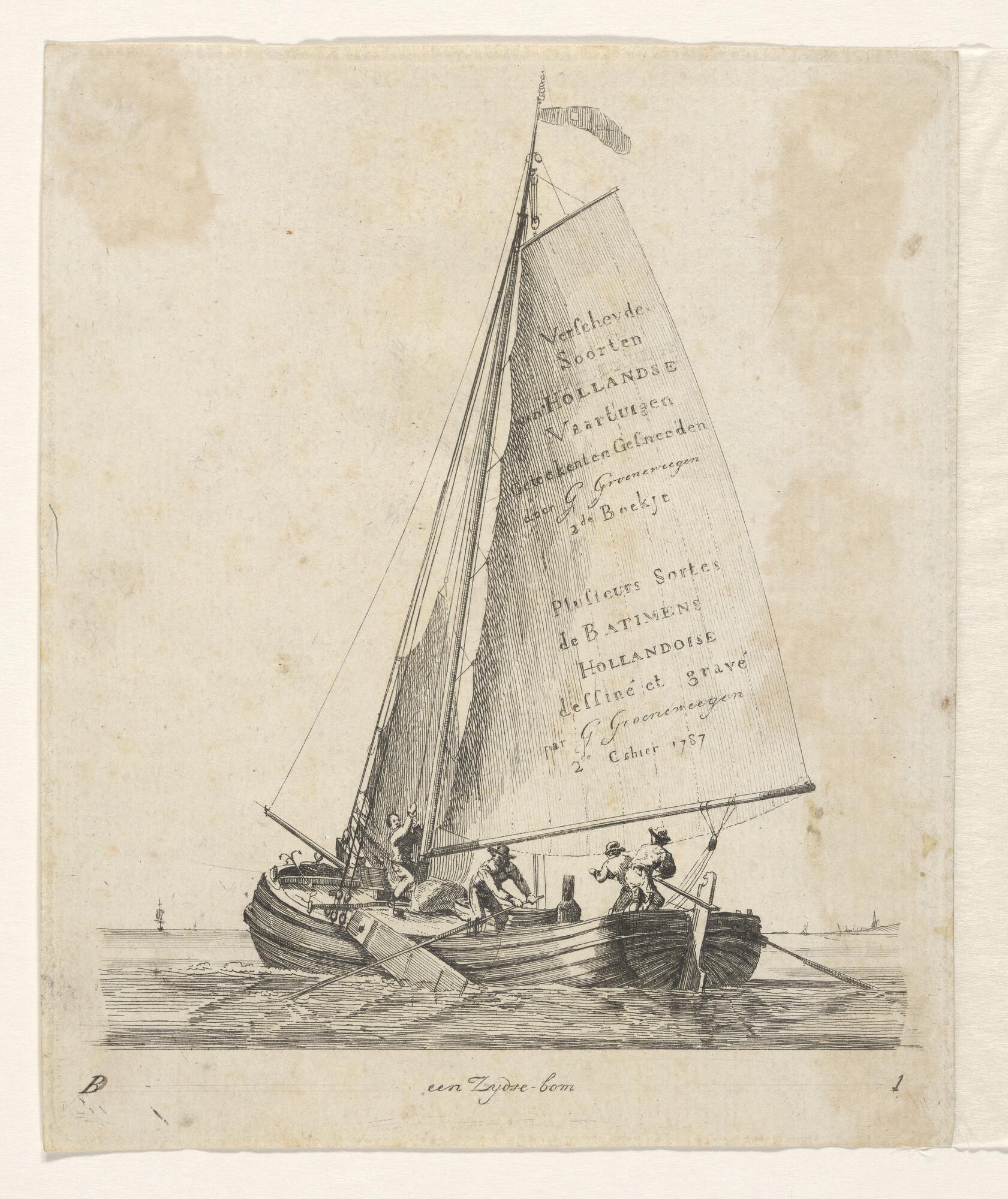 Titelblad van de serie 'Verscheidene soorten van Hollandse vaartuigen', tweede katern: een zijdse bom.