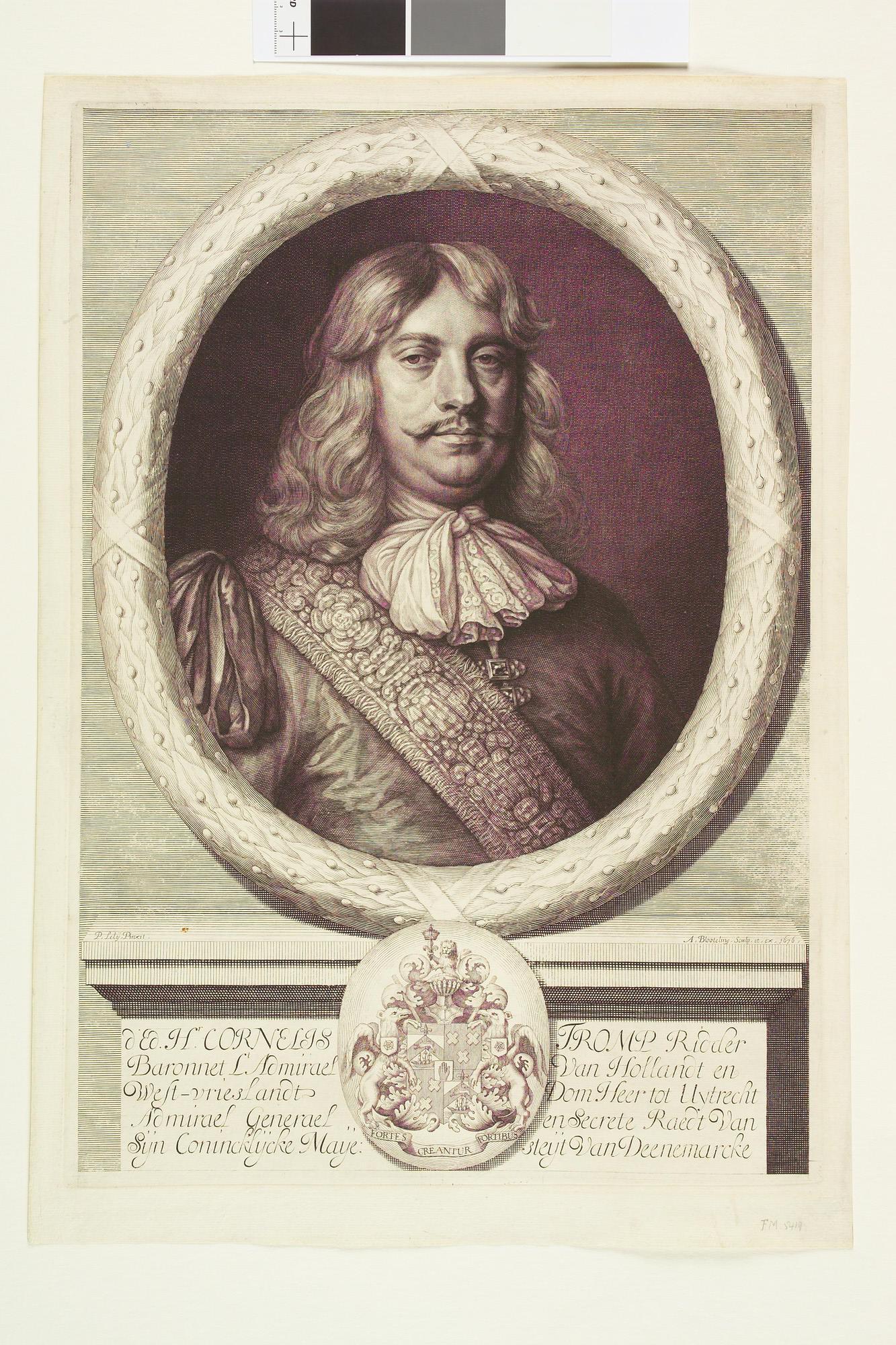 Portret van luitenant-admiraal Cornelis Tromp, borstbeeld in eikenkrans; daaronder zijn familiewapen.