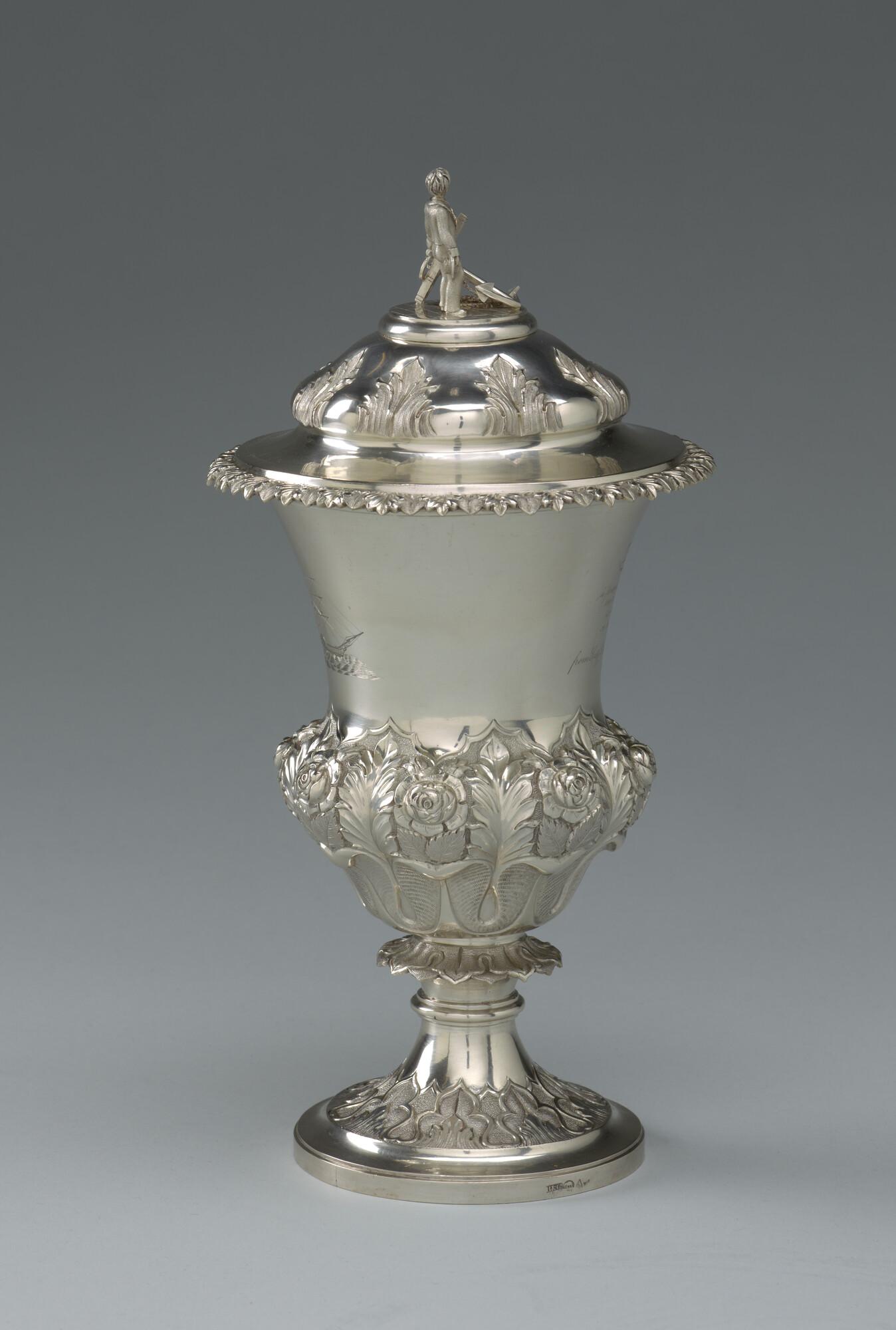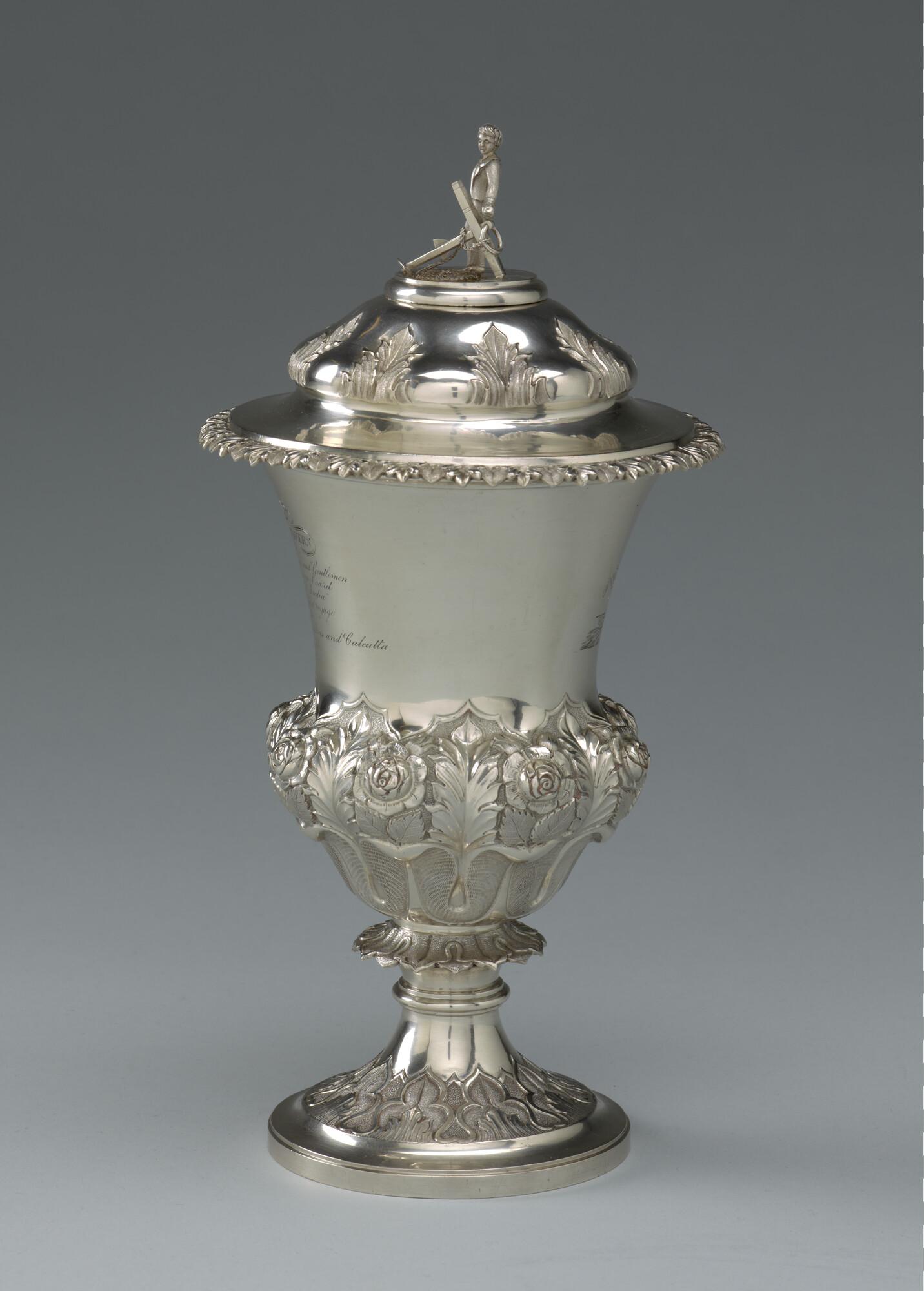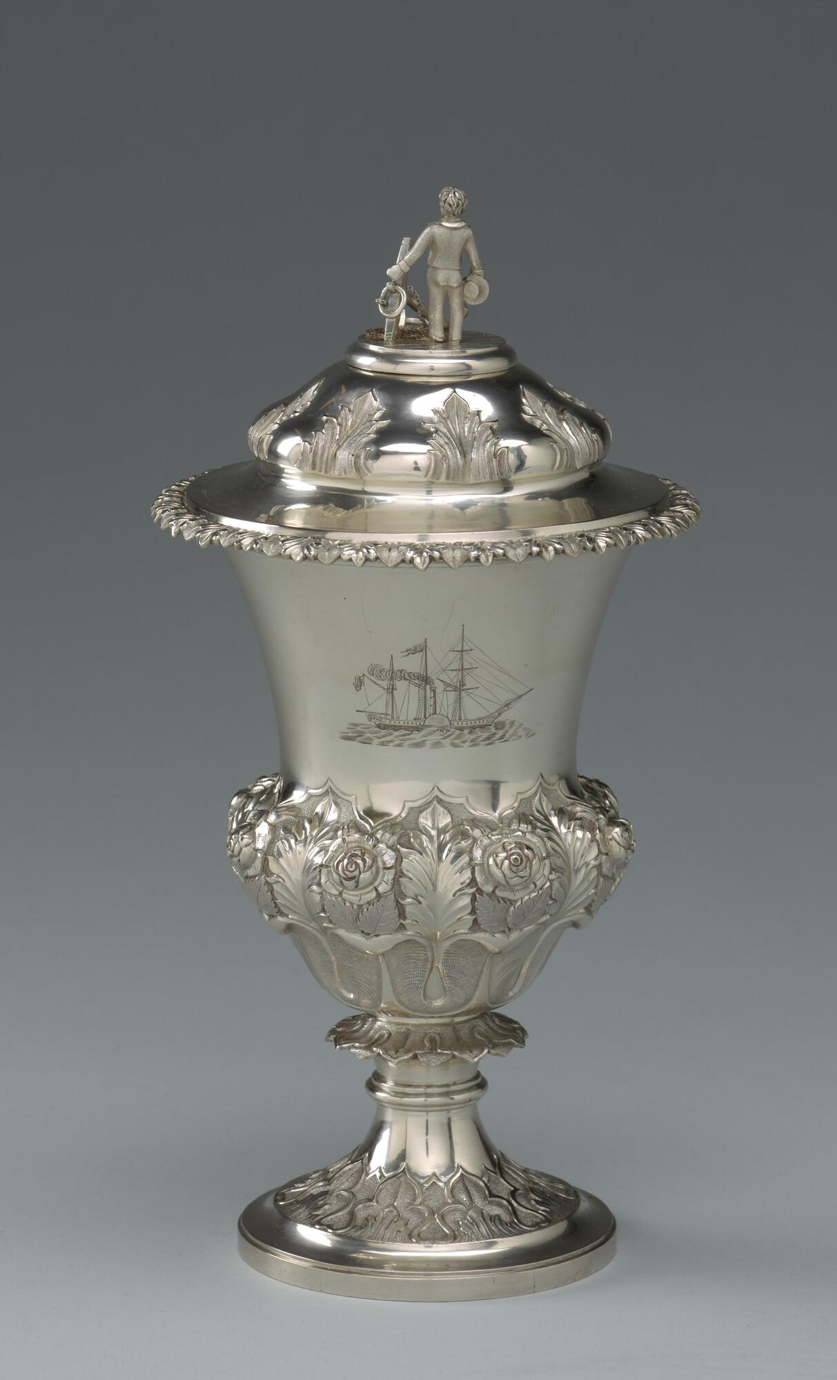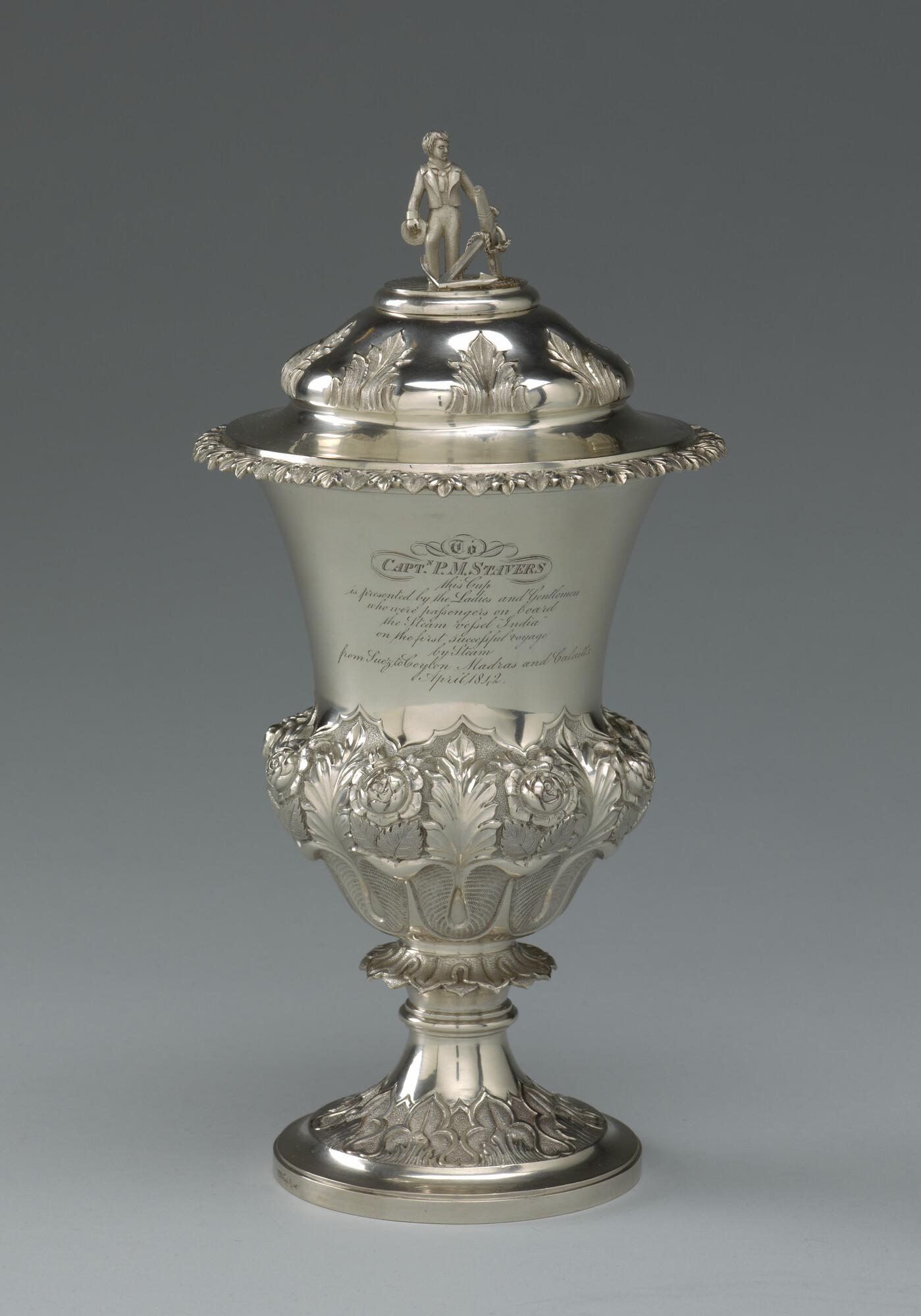 Zilveren beker met deksel, aangeboden aan de gezagvoerder P.M. Stavers door de passagiers aan boord van het ss. "India" op de eerste stoomreis van Suez naar Ceylon, Madras en Calcutta in april 1842.