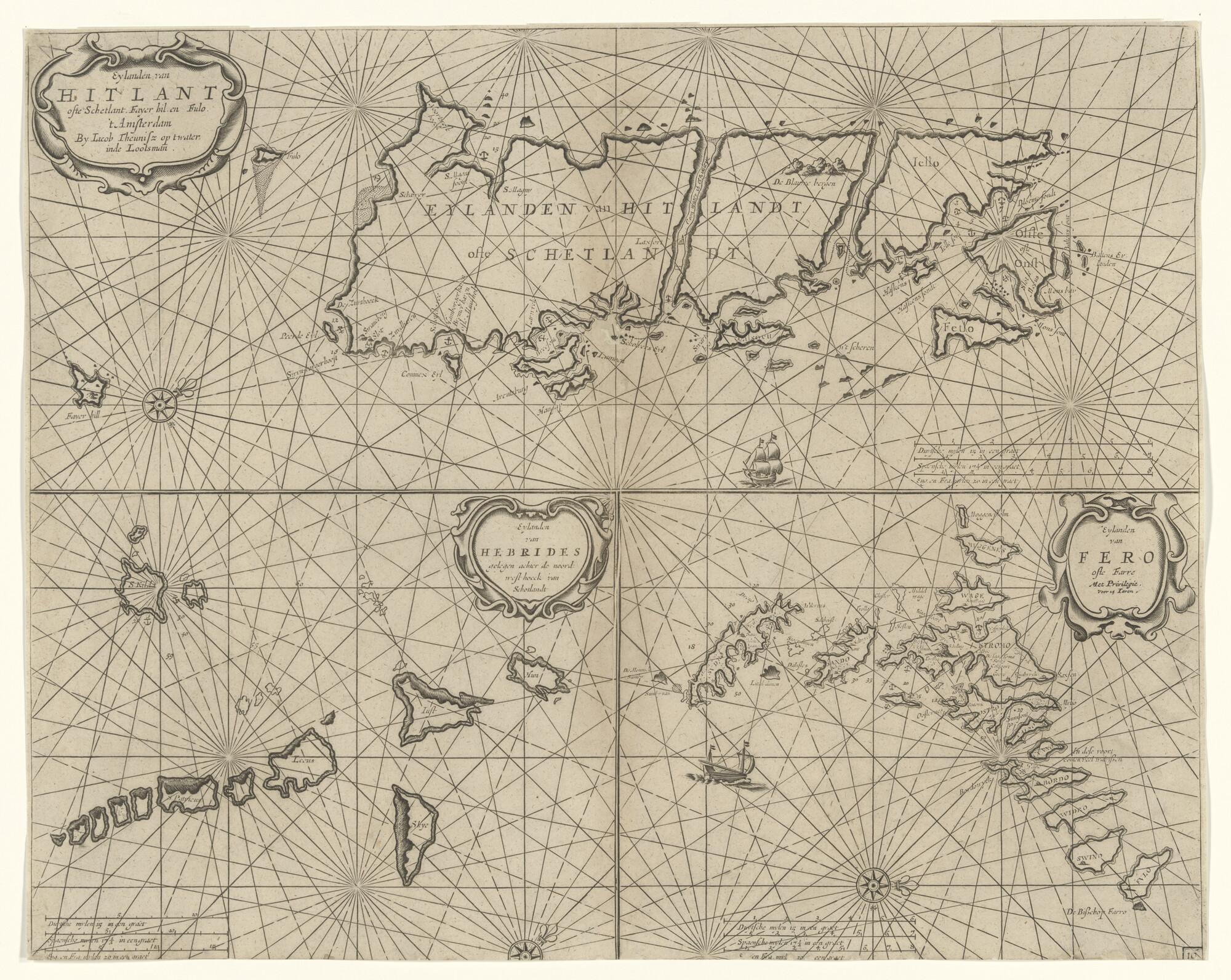 Zeekaart van de Shetland eilanden de Hebrides en de Far Oer eilanden. Door Anthonie Jacobsz (circa 1606 - 1650), Amsterdam, 1643 (diverse schalen).
