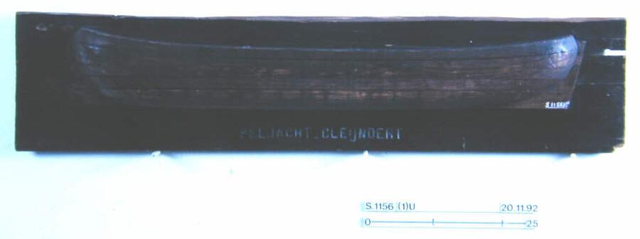 Halfmodel van een tjalk met beplating en spanten aangegeven op de romp.