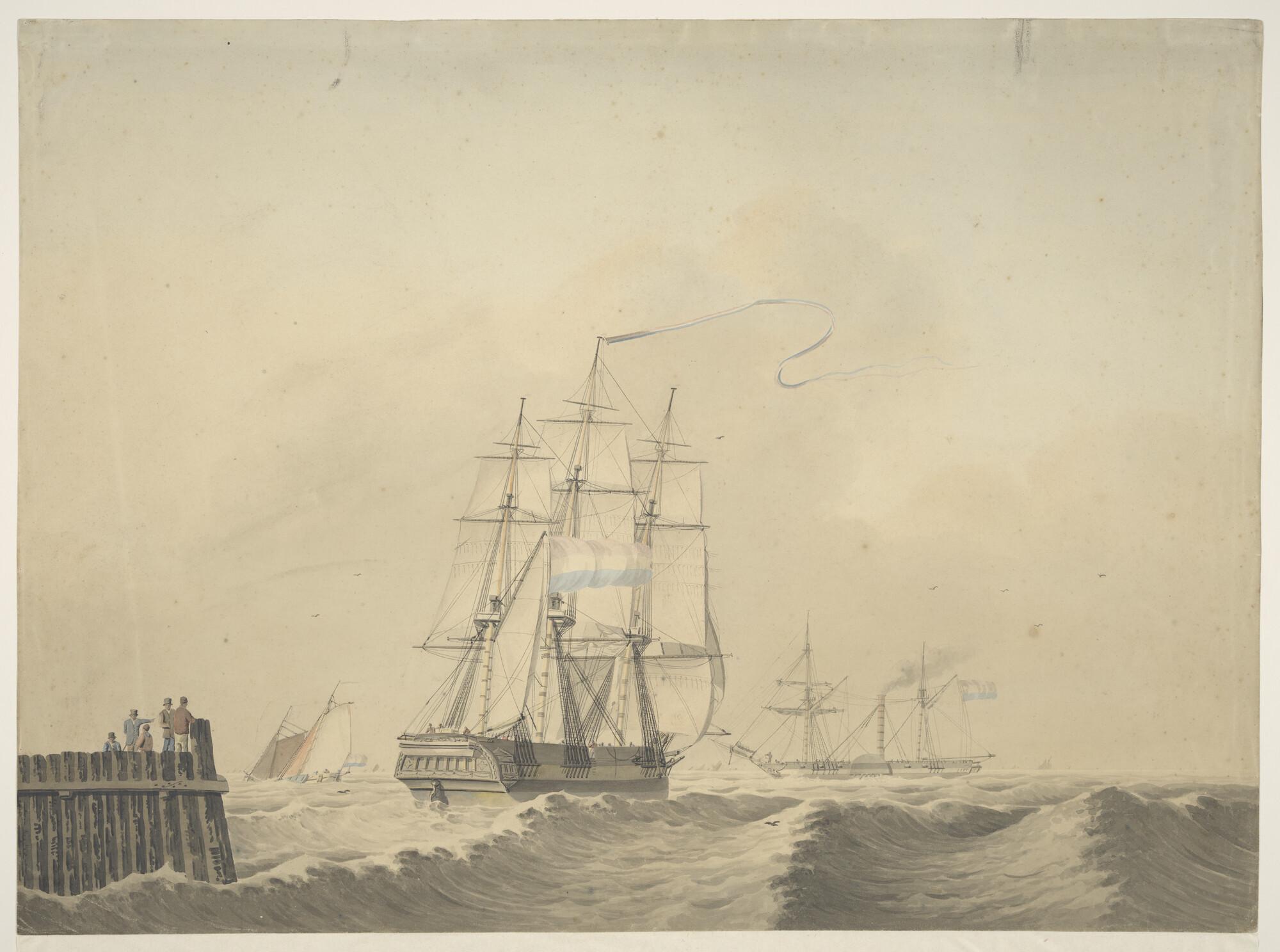 Een koopvaardijfregat en een raderstoomschip