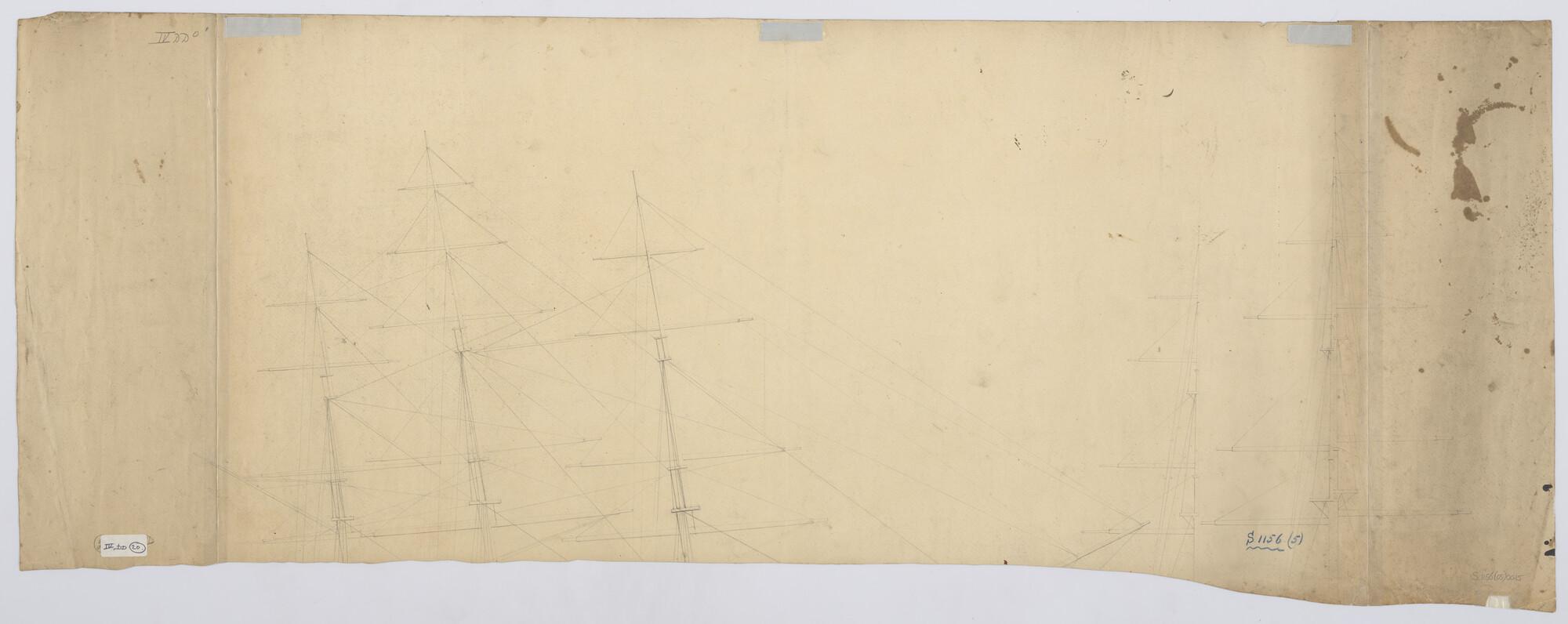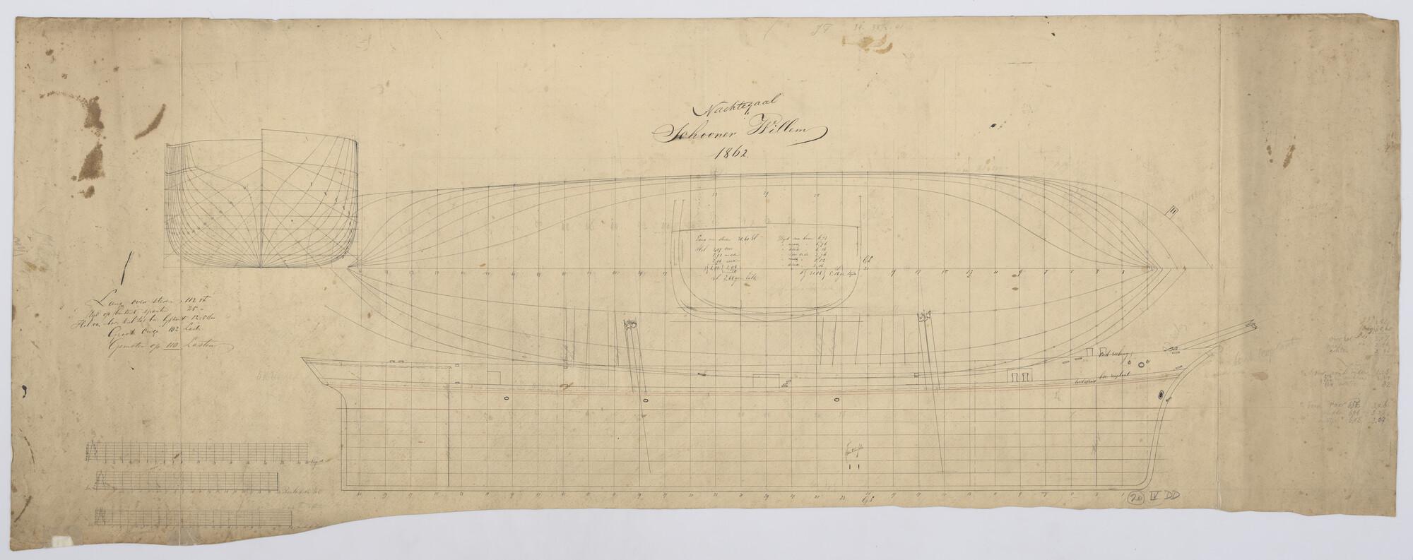 Zijaanzicht, lijnenplan van de schoener "Willem" 112 x 25 x 12.5 voet. 110 lasten.