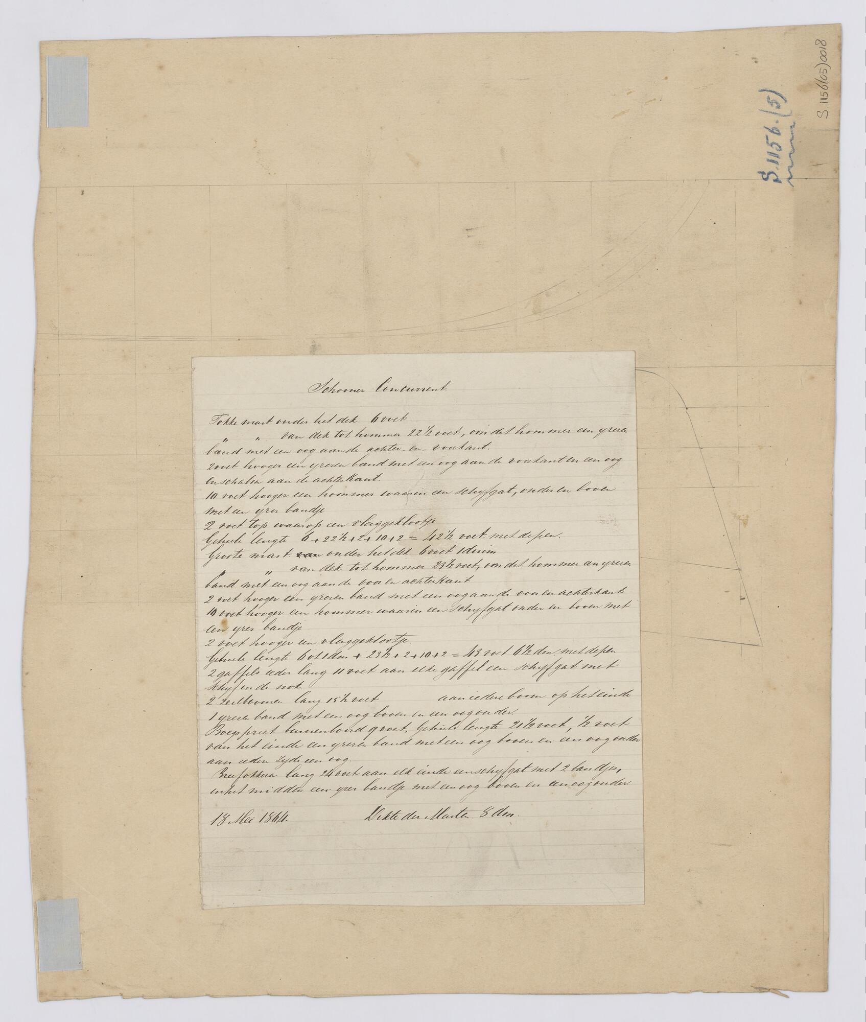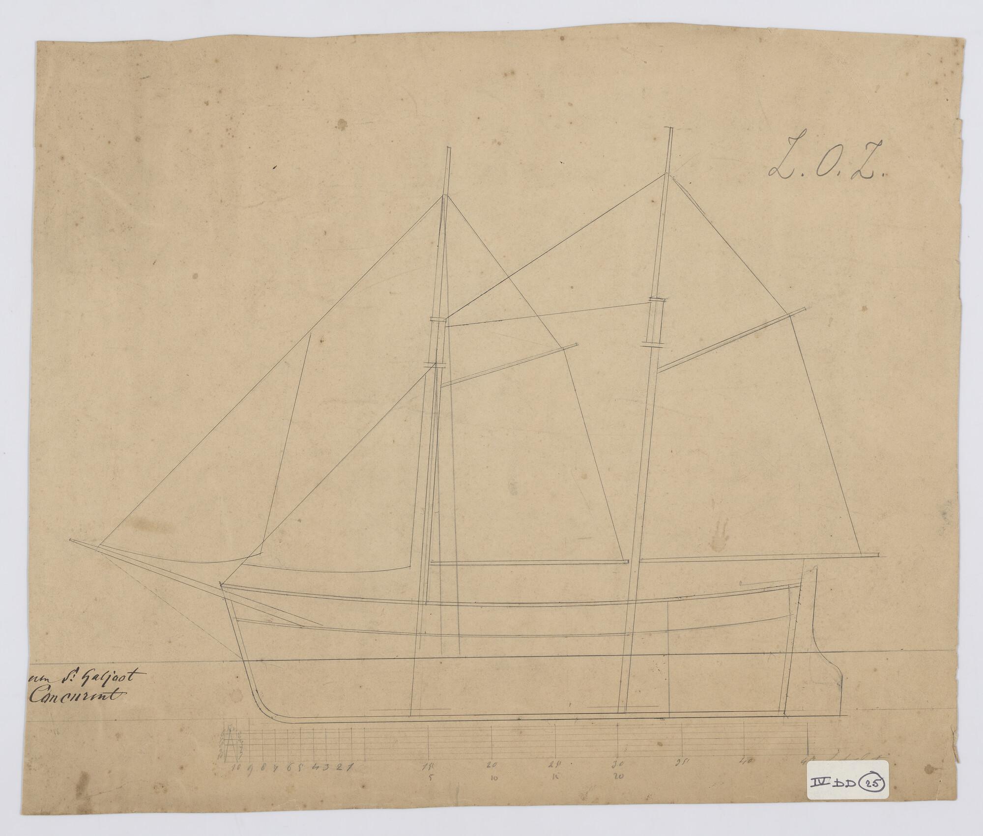 Zijaanzicht, lijnenplan, van de schoenergaljoot "Concurrent". (IJzer). Tuigplan aan achterzijde gegevens rondhouten.