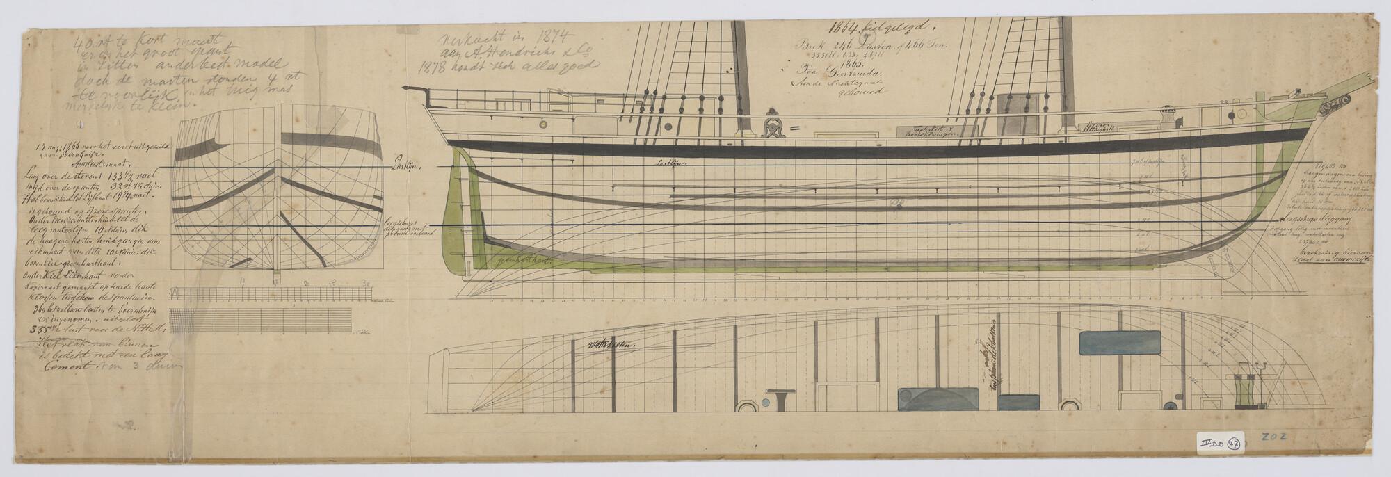 Zijaanzicht, bovenaanzicht, vooraanzicht, achteraanzicht, lijnenplan, zijaanzicht, tuigplan, Compositiebouw van de brik "Ida Geertruida". Afmetingen 133.5 x 32.7½ x 19.25 voet.