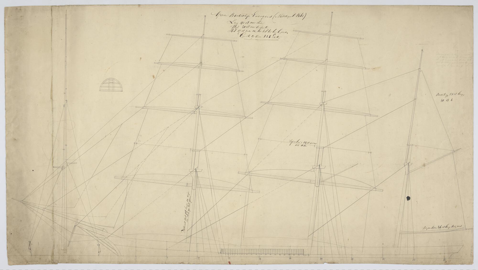 Tuigtekening met afmetingen van masten en ra's van de bark "Emergens" 144 x 30 x 17 ½ voet.