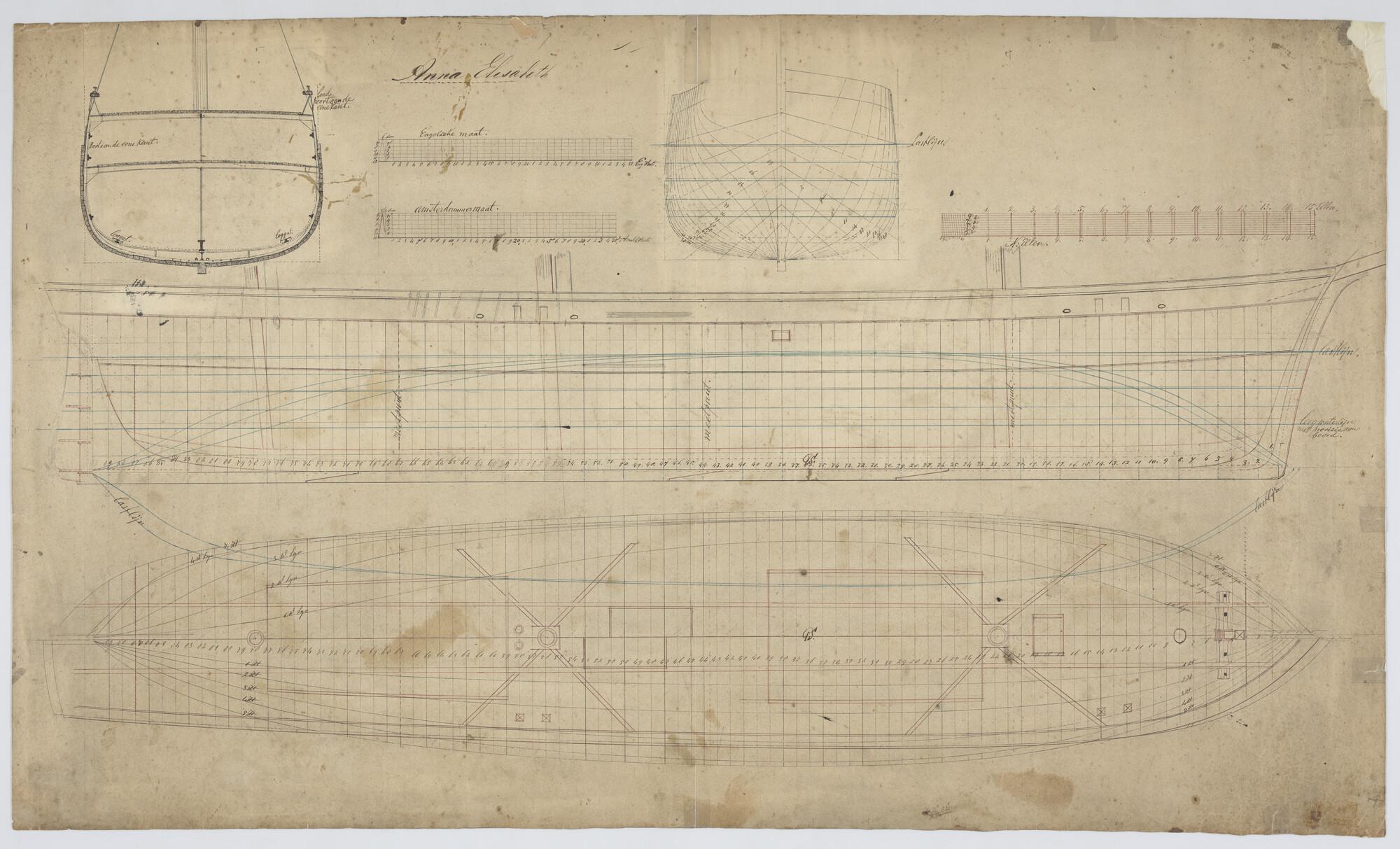 Zijaanzicht, spantenraam, senten, waterlijnen van de bark "Anna Elisabeth".