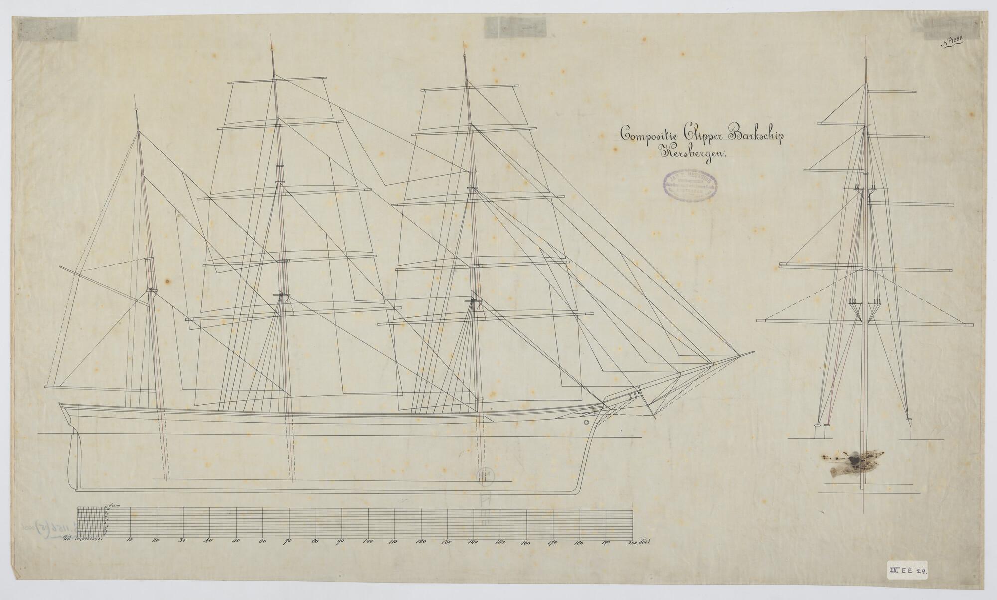 Tuigplan van het klipperbarkschip 'Kersbergen'