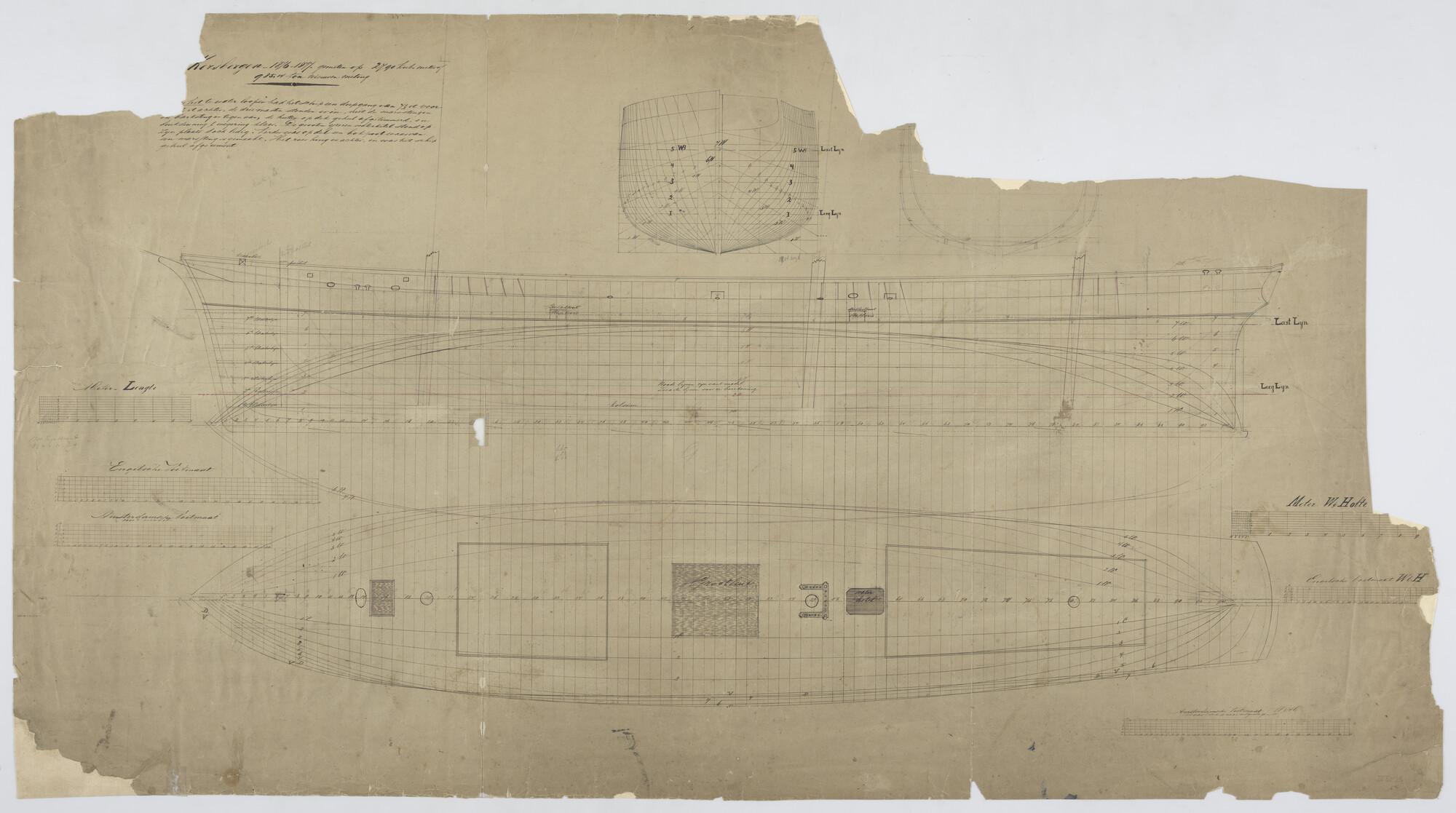 Zijaanzicht, bovenaanzicht, waterlijnen, spantenraam, Klipperbarkschip "Kersbergen". Afmetingen 180 x 34½ x 20½ voet.