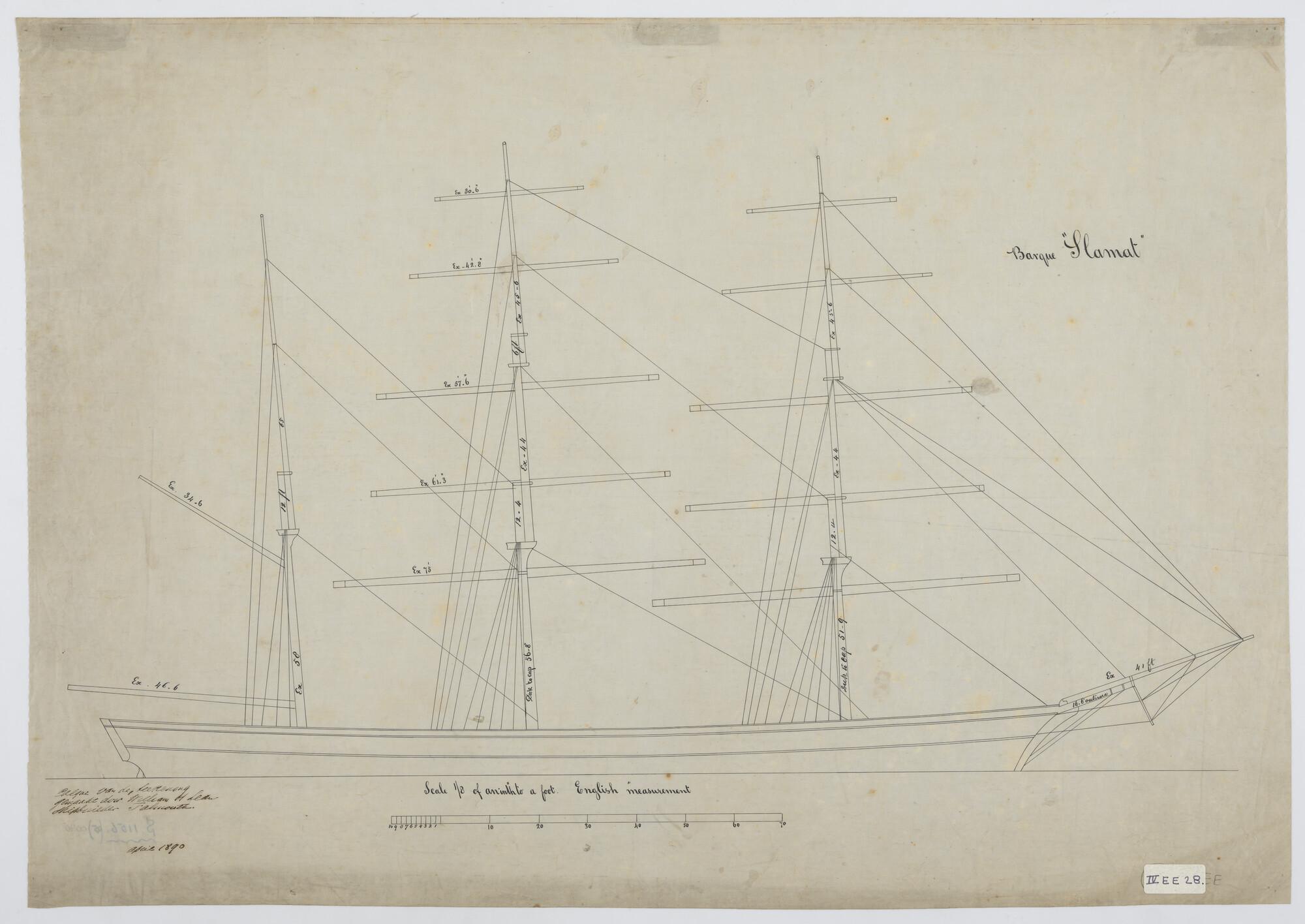 Klipperbark 'Slamat'. Tekening van het vaste want, met maten van het rondhout