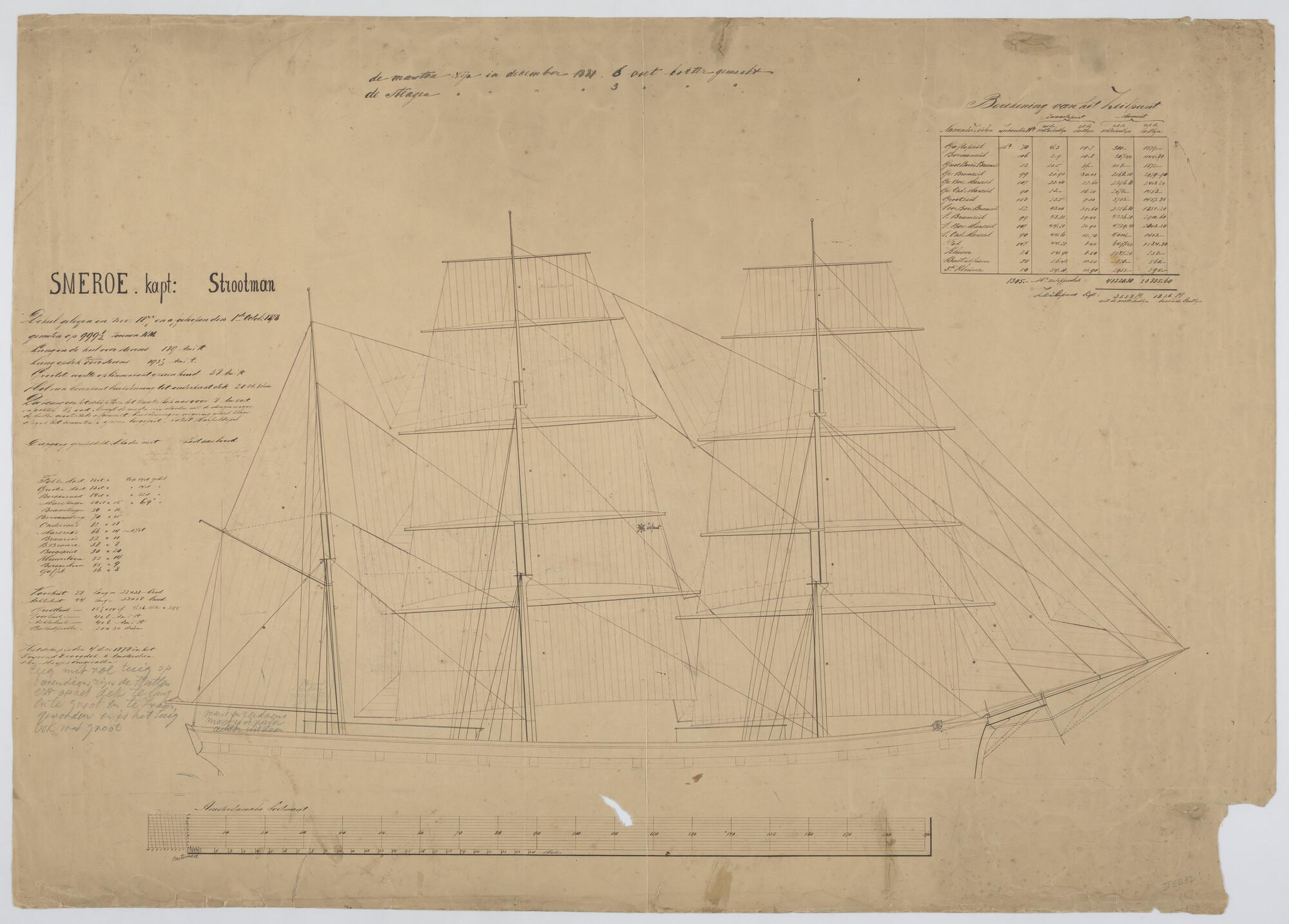 Klipperbark "Smeroe". Zeil en tuigplan, berekening zeilpunt, afmetingen rondhout en dekhuizen. Afmetingen 189 x 38 x 20.8 voet.