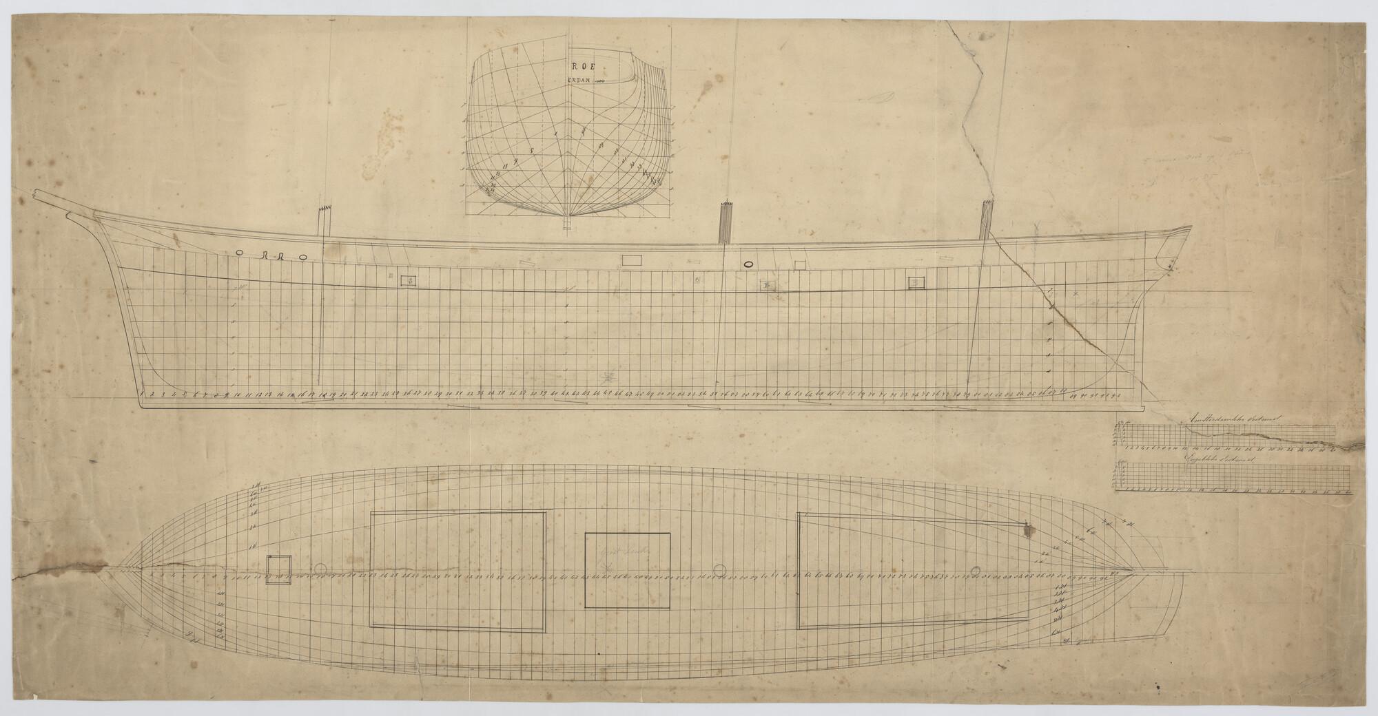 Klipperbark "Smeroe": Zijaanzicht, bovenaanzicht, vooraanzicht, achteraanzicht, spantenraam, waterlijnen, verticalen & gegevens waterverplaatsing.